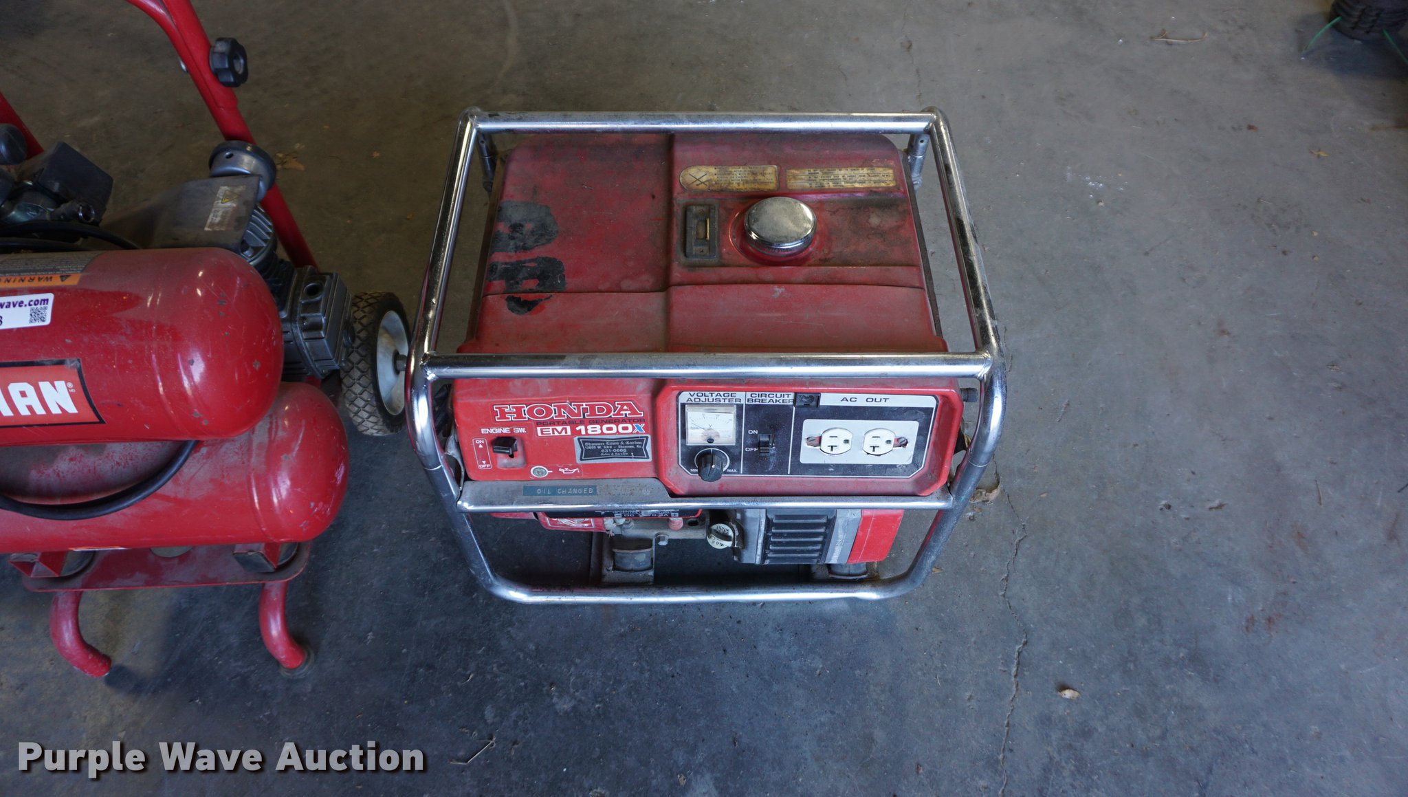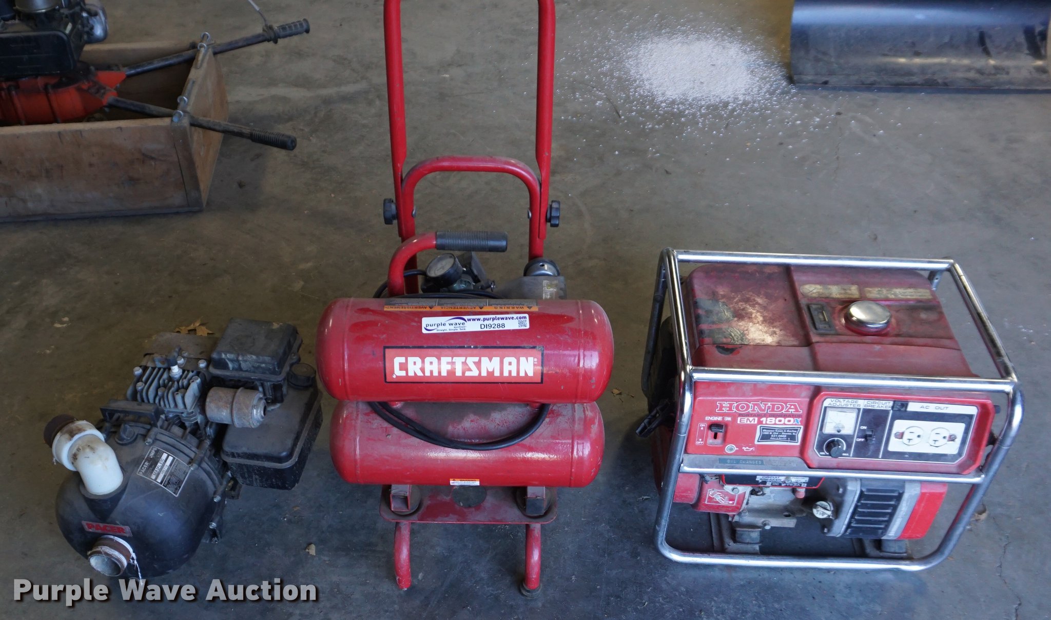 Purple Wave is selling a used Tools in Kansas. This item is a Tools with the following: Craftsman air compressor, 1 HP, 125 psi, Four gallon tank capacity, Pacer trash pump, Briggs & Stratton gas engine, 3.5 HP, 2" inlet/outlet, Unknown operating condition, Honda generator, Gas engine, 115V, 1,800 watts