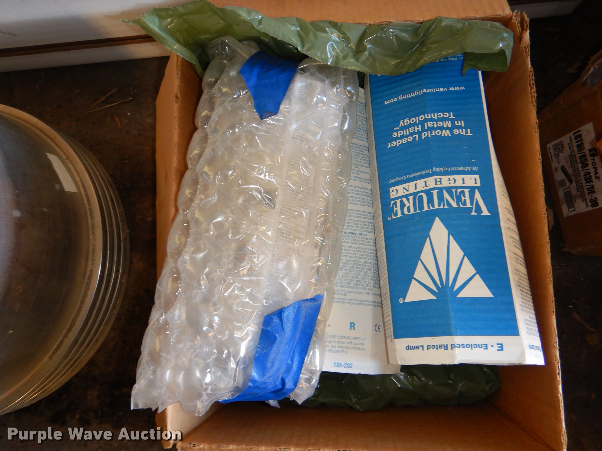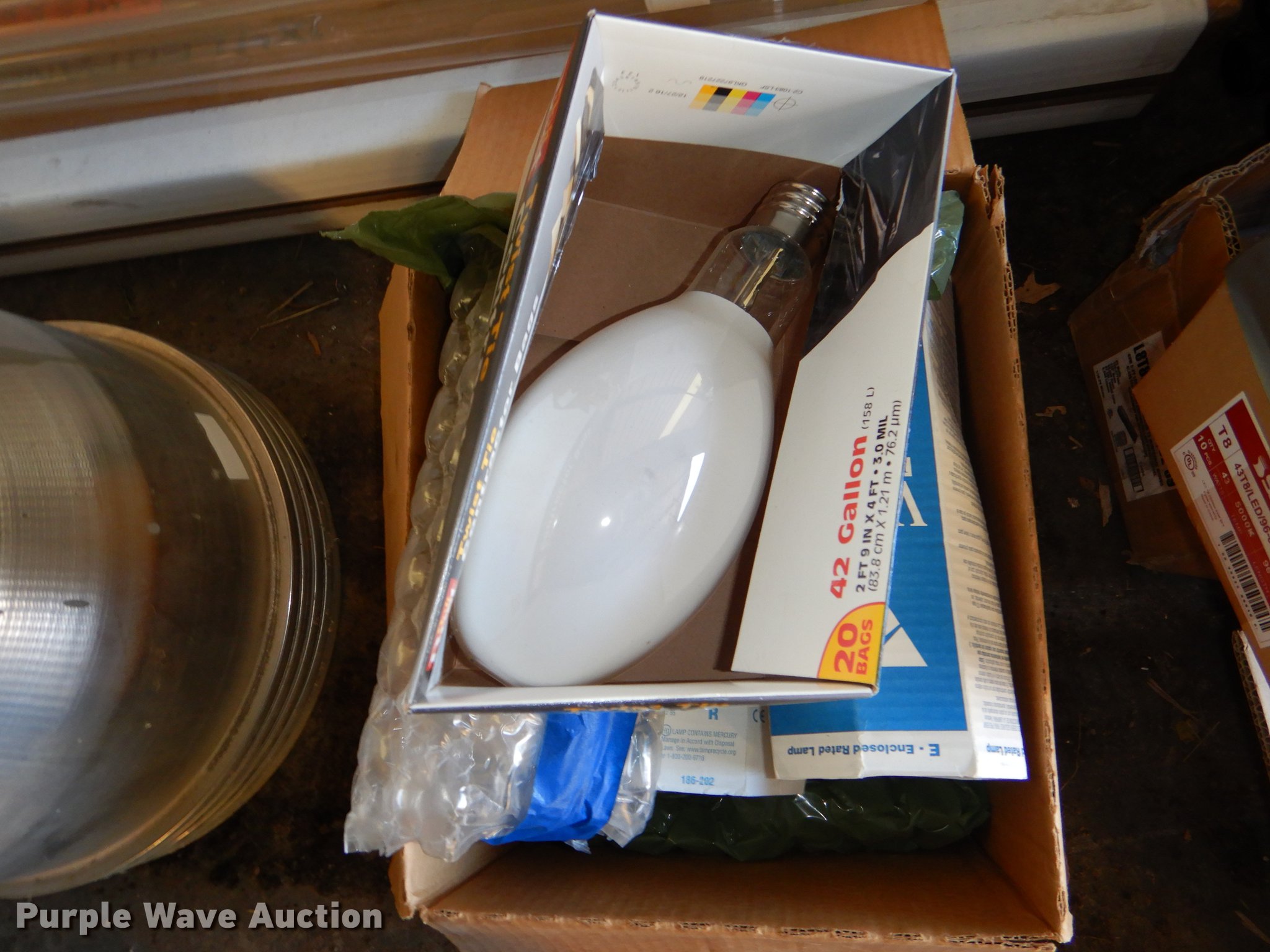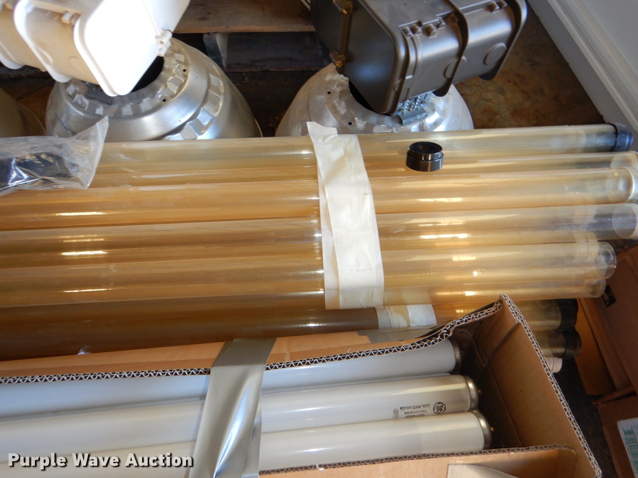 Purple Wave is selling a used Building Materials in Kansas. This item is a Lights and accessories with the following: Strip light bulbs, Tube covers, (5) light domes, 400 watt bulbs