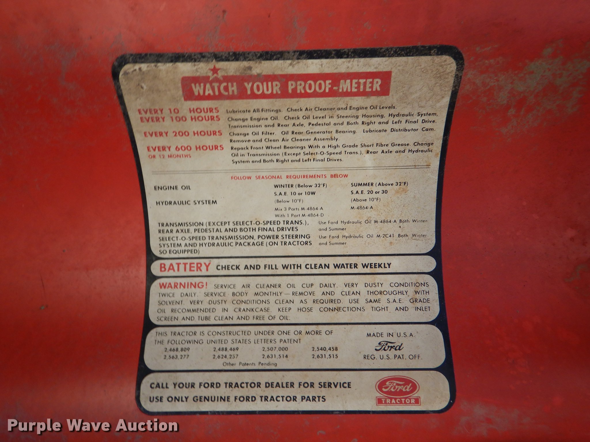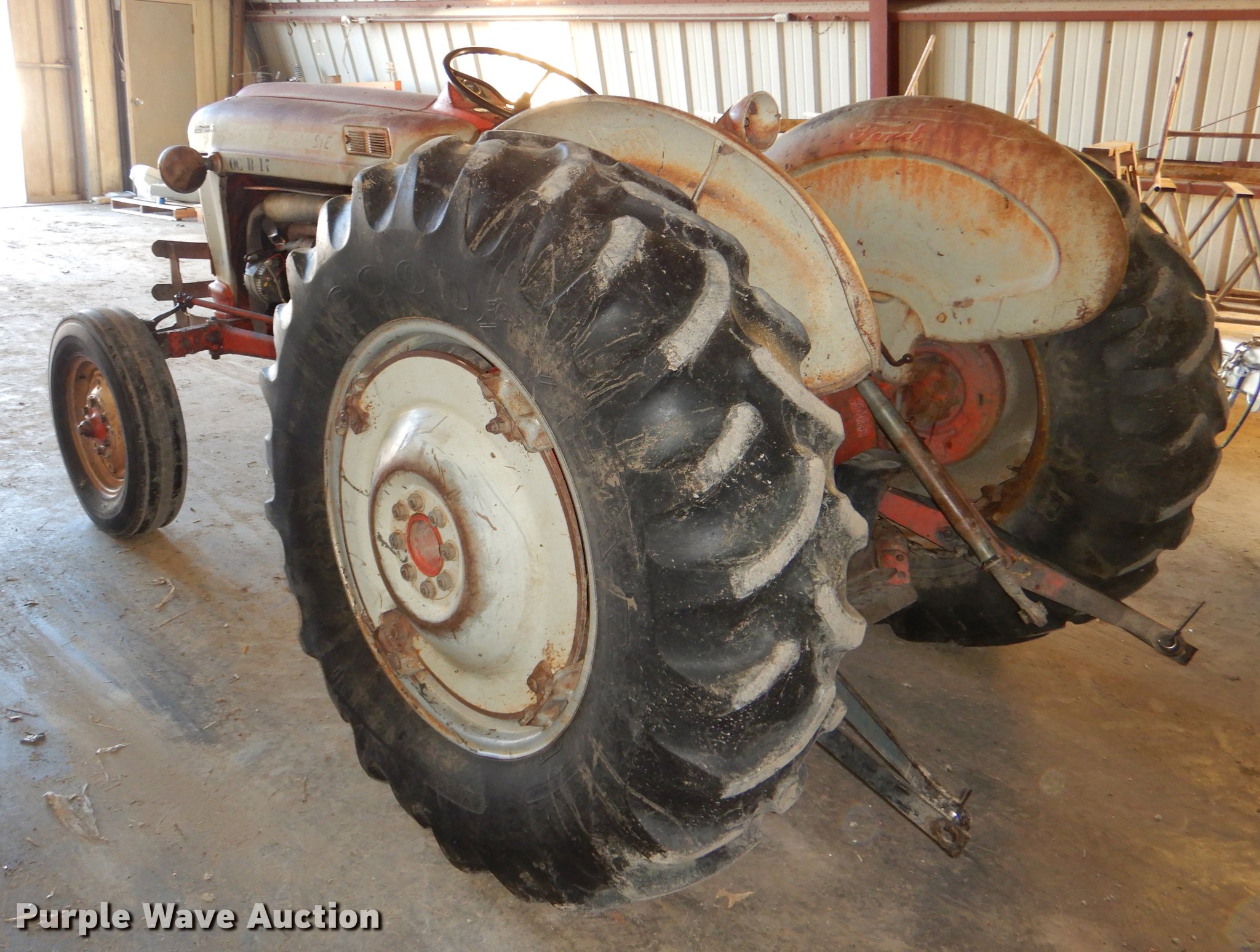 Purple Wave is selling a used Tractor in Kansas. This item is a 1960 Ford 801 tractor with the following: Ford 2.8L four cylinder gas engine, 62 HP, 5F-1R gears, Rear work light, Three point, Top link, 540 PTO, 6.00-16.5 front tires, 14.9-28 rear tires, No bulb or lens for work light, Seat needs to be replaced, Serial 127262