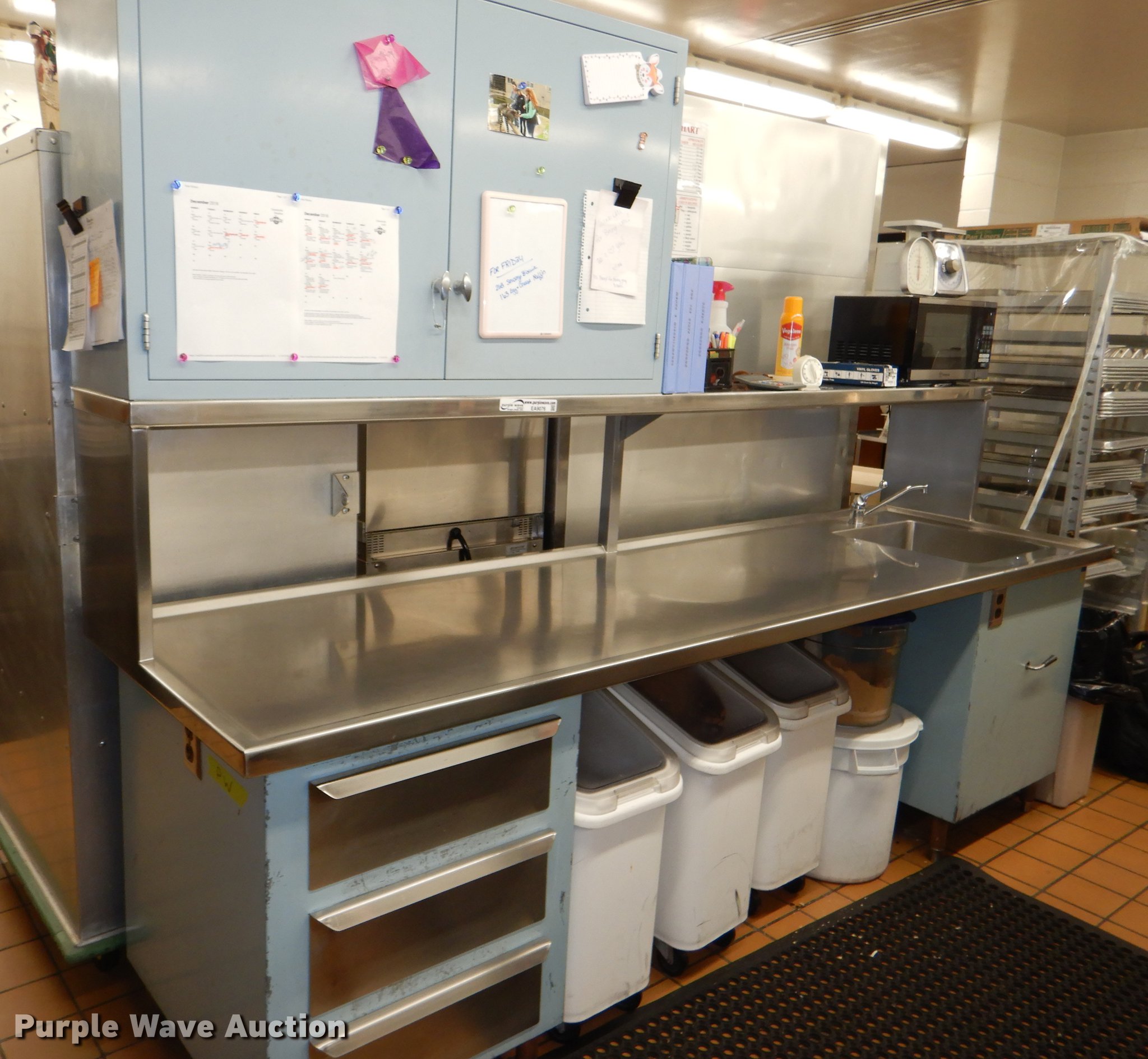 Purple Wave is selling a used Restaurant Equip. in Kansas. This item is a Food prep station with the following: Top storage cupboard, Sink, (3) storage drawers, 9' x 30" x 52" table, 4' x 13" x 30", Contents and bins not included