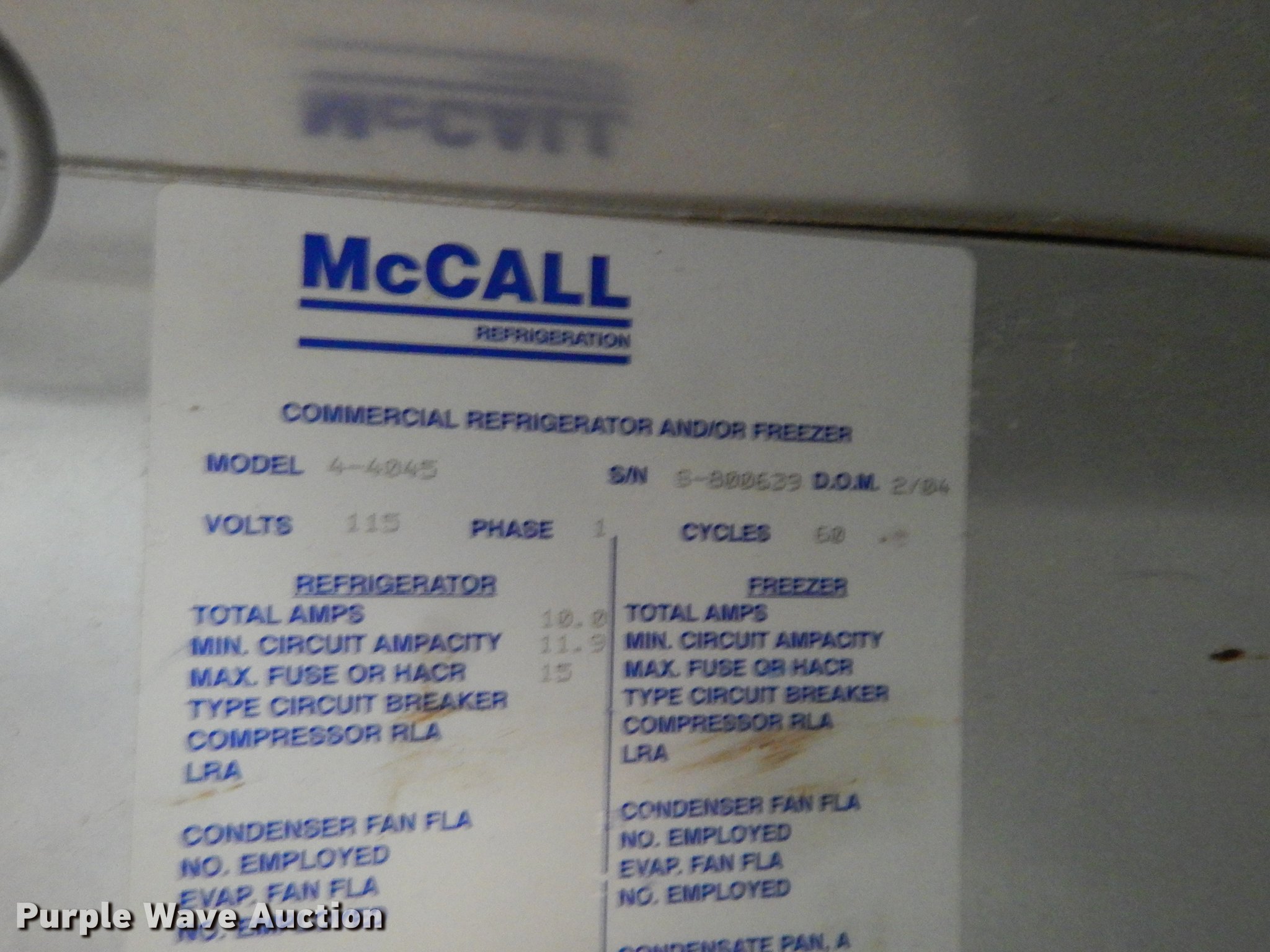 Purple Wave is selling a used Restaurant Equip. in Kansas. This item is a Restaurant equipment with the following: Beverage Air milk cooler, 58" x 31" x 40", 115V, McCall refrigerator, 55" x 33.5" x 84", Two doors, Non-operational