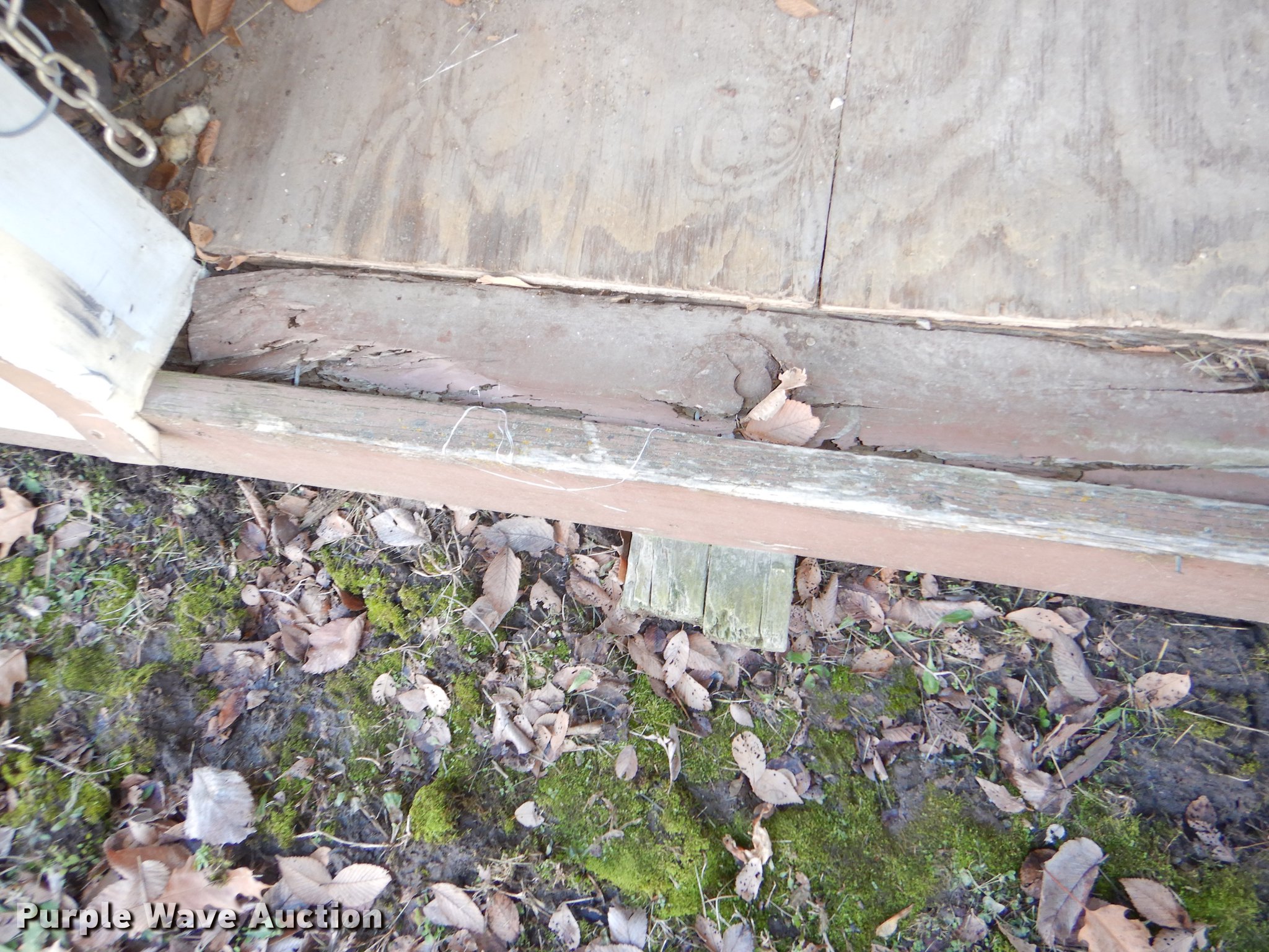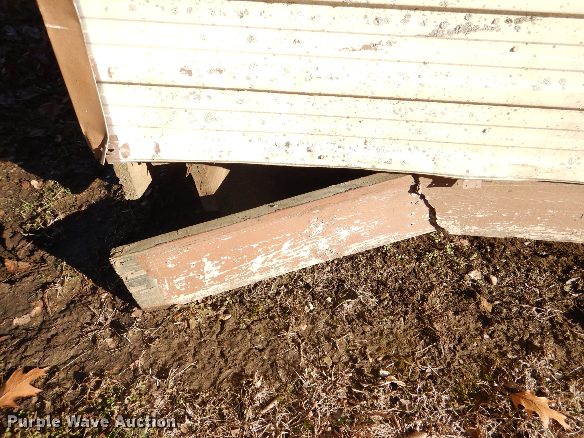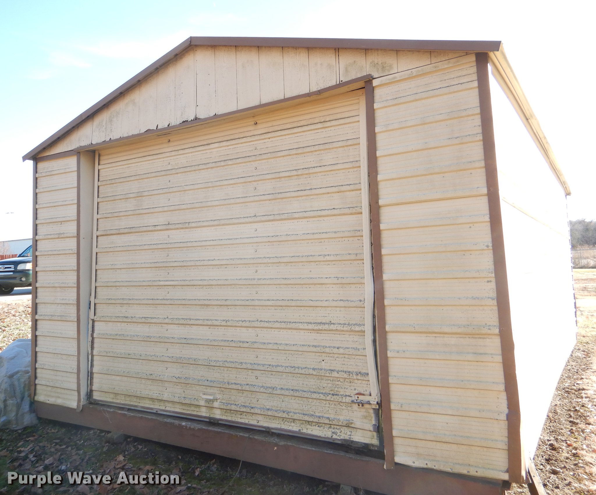 Morgan steel building. 284"L x 170"W, 11'H O.D., 2' x 8' floor framing material, Wood floor, Exterior sheet metal/tin, Folding garage door, Side entry door, Interior structure needs to be redone at right side corner to transport. Additional images forthcoming. Bonner Springs, KS 66012
