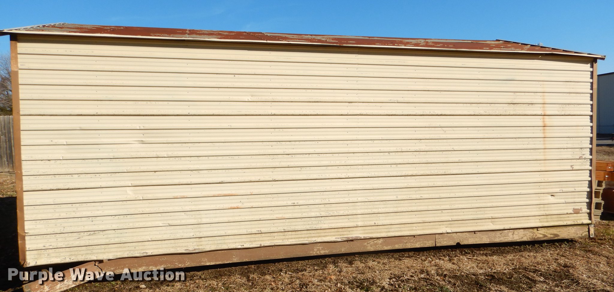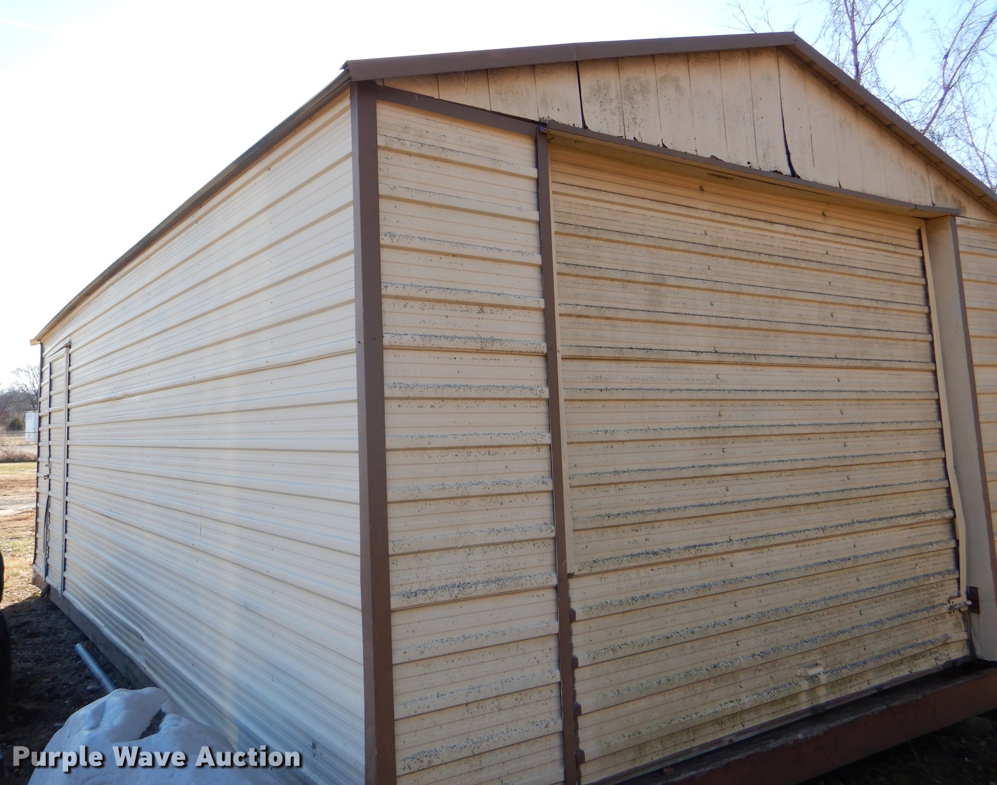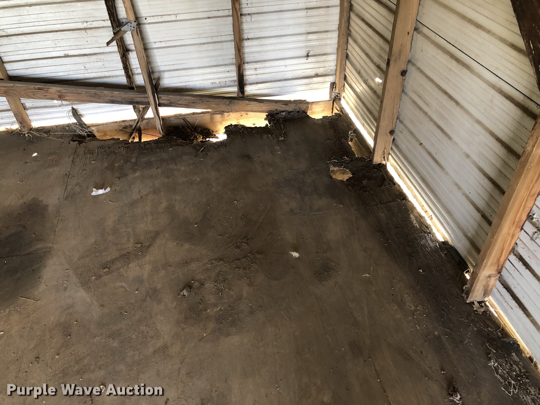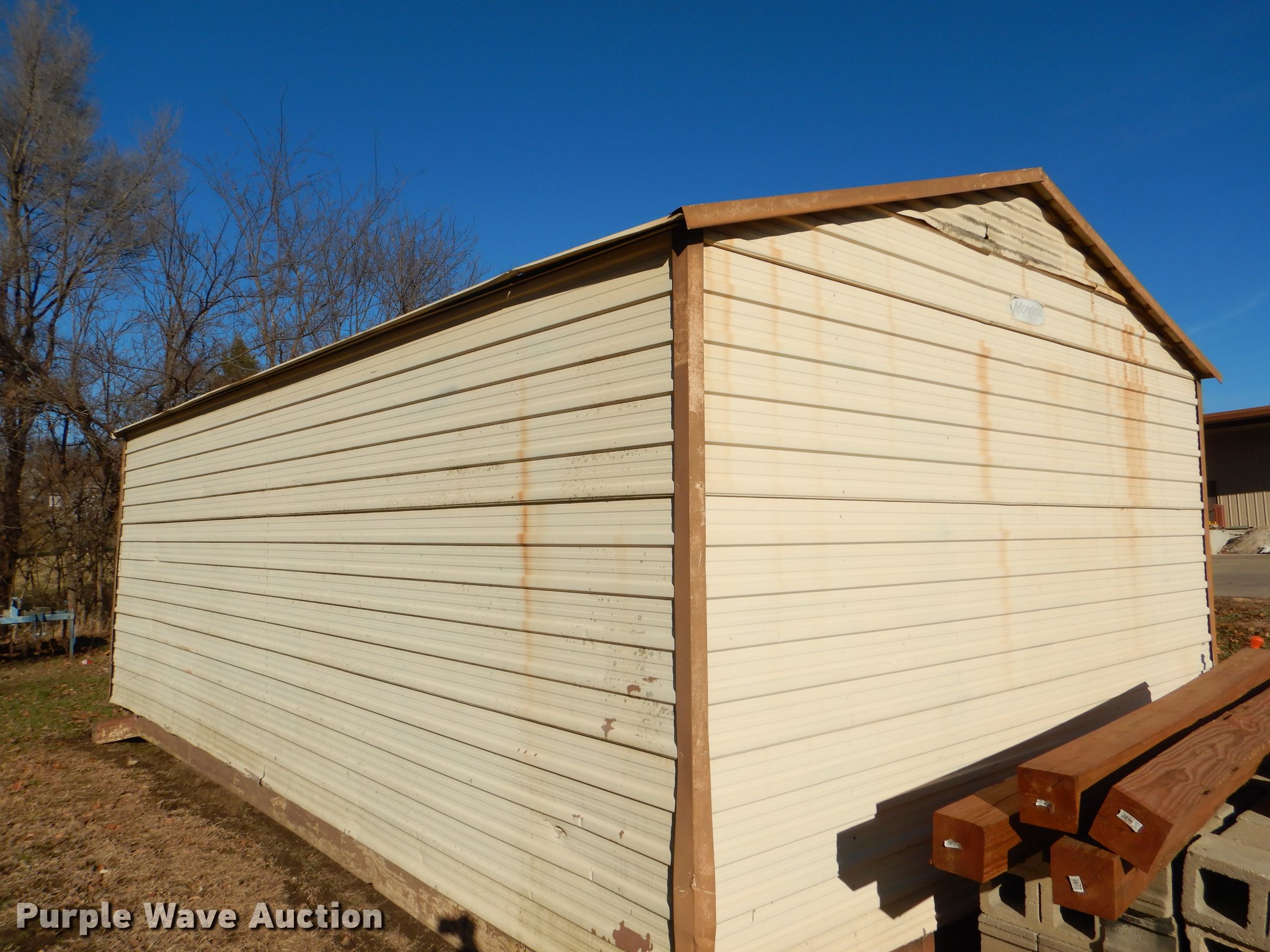 Purple Wave is selling a used Building Materials in Kansas. This item is a Morgan steel building with the following: 284"L x 170"W, 11'H O.D., 2' x 8' floor framing material, Wood floor, Exterior sheet metal/tin, Folding garage door, Side entry door, Interior structure needs to be redone at right side corner to transport