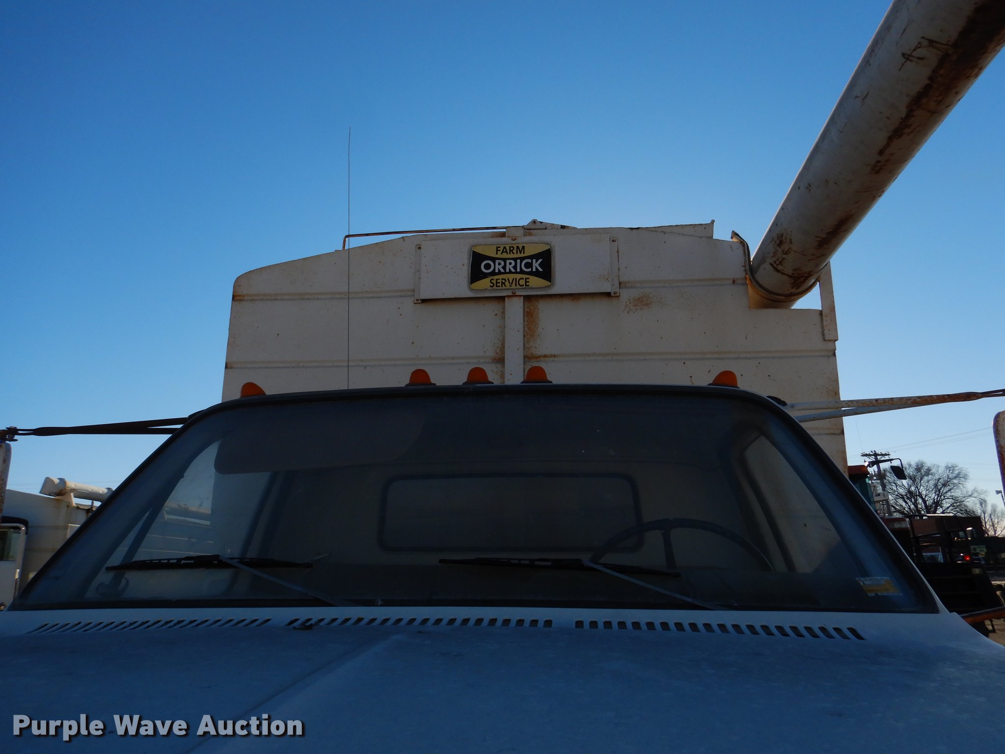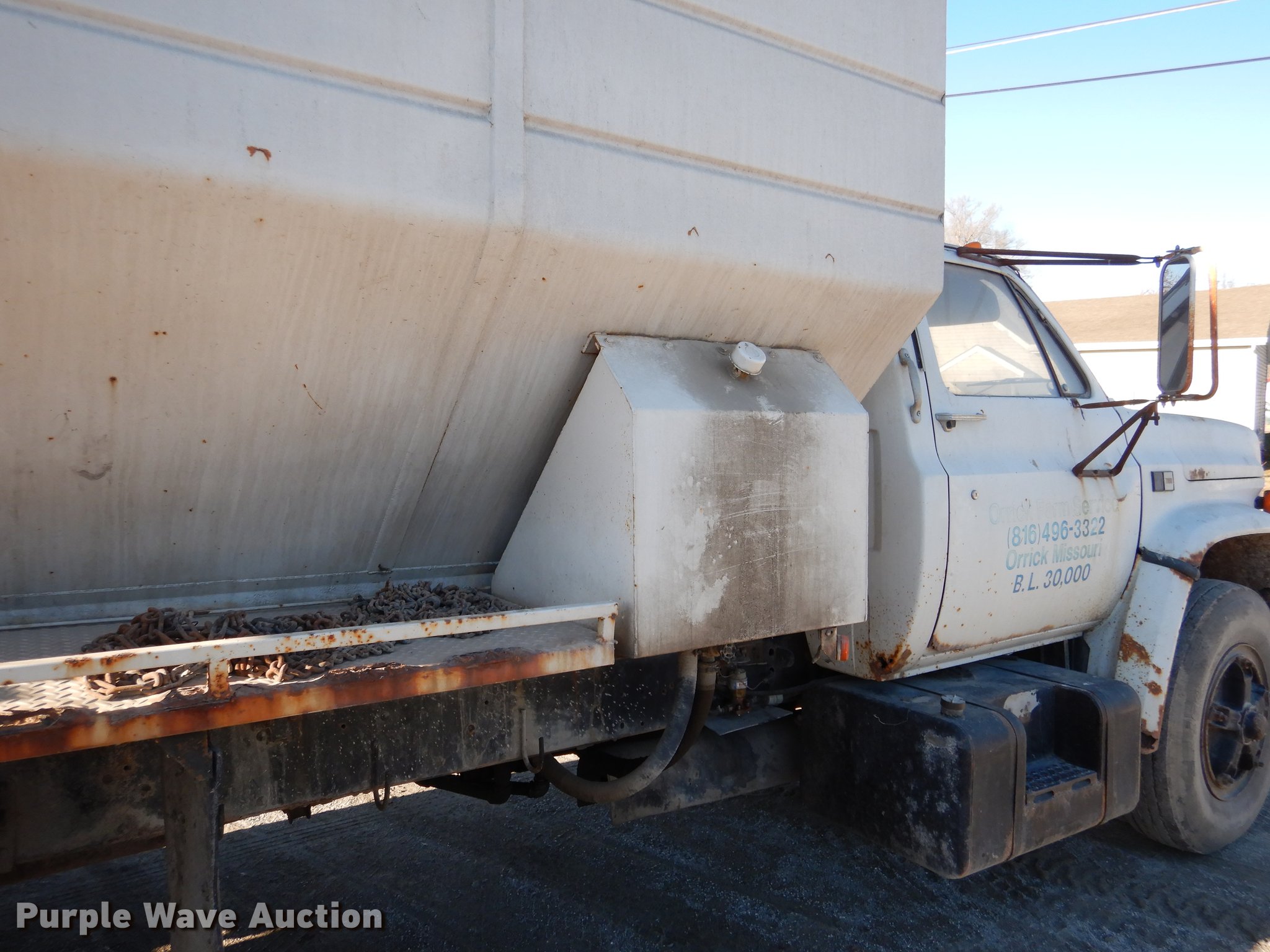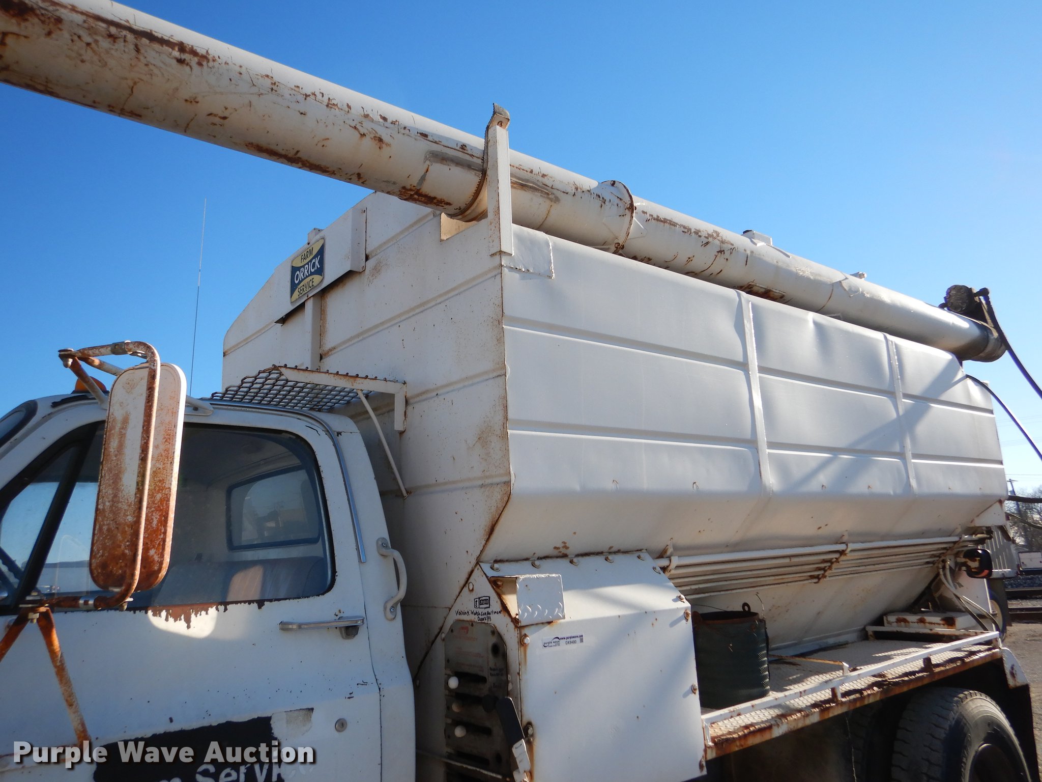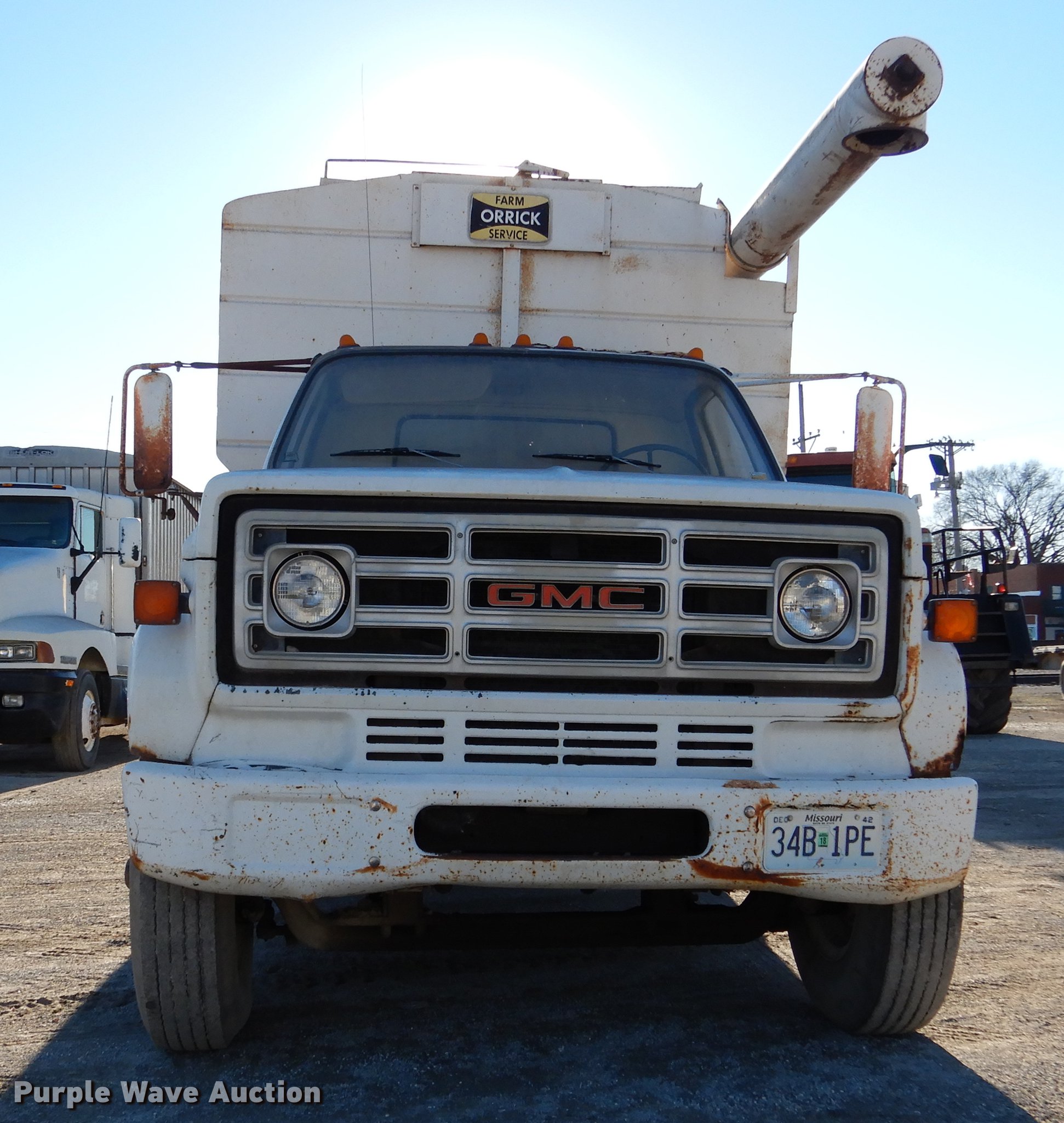 1987 GMC 7000 feed delivery truck. 225,766 miles on odometer, GM 366 C.I.D. V8 gas engine, Five speed manual transmission Two speed rear end, Single axle, Heat, Model 300-M feed bed 12'L, Six ton capacity, 16'L side auger, Single exhaust stack, 179" wheelbase, Spring suspension, Hydraulic brakes, 10.00R20 front tires, 11R22.5 rear tires, GVWR 28,000 lbs, FAWR 9,000 lbs, RAWR 19,000 lbs. Missouri title. 1GDL7D1B5HV524027. MFA Agri Services. 208 E North Front St. Orrick, MO 64077