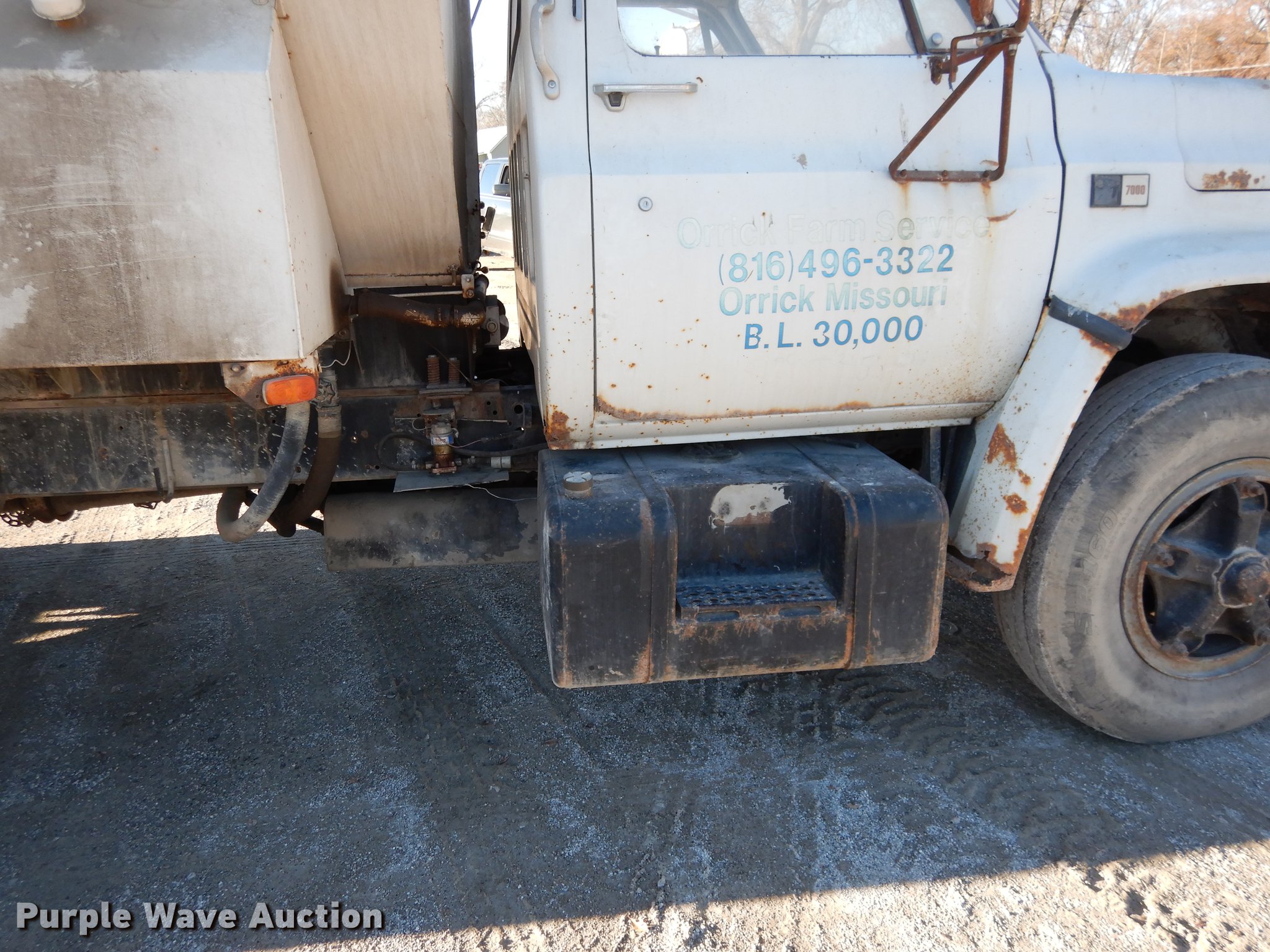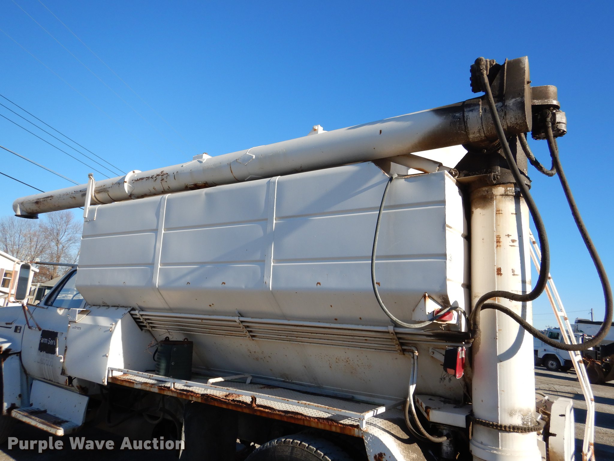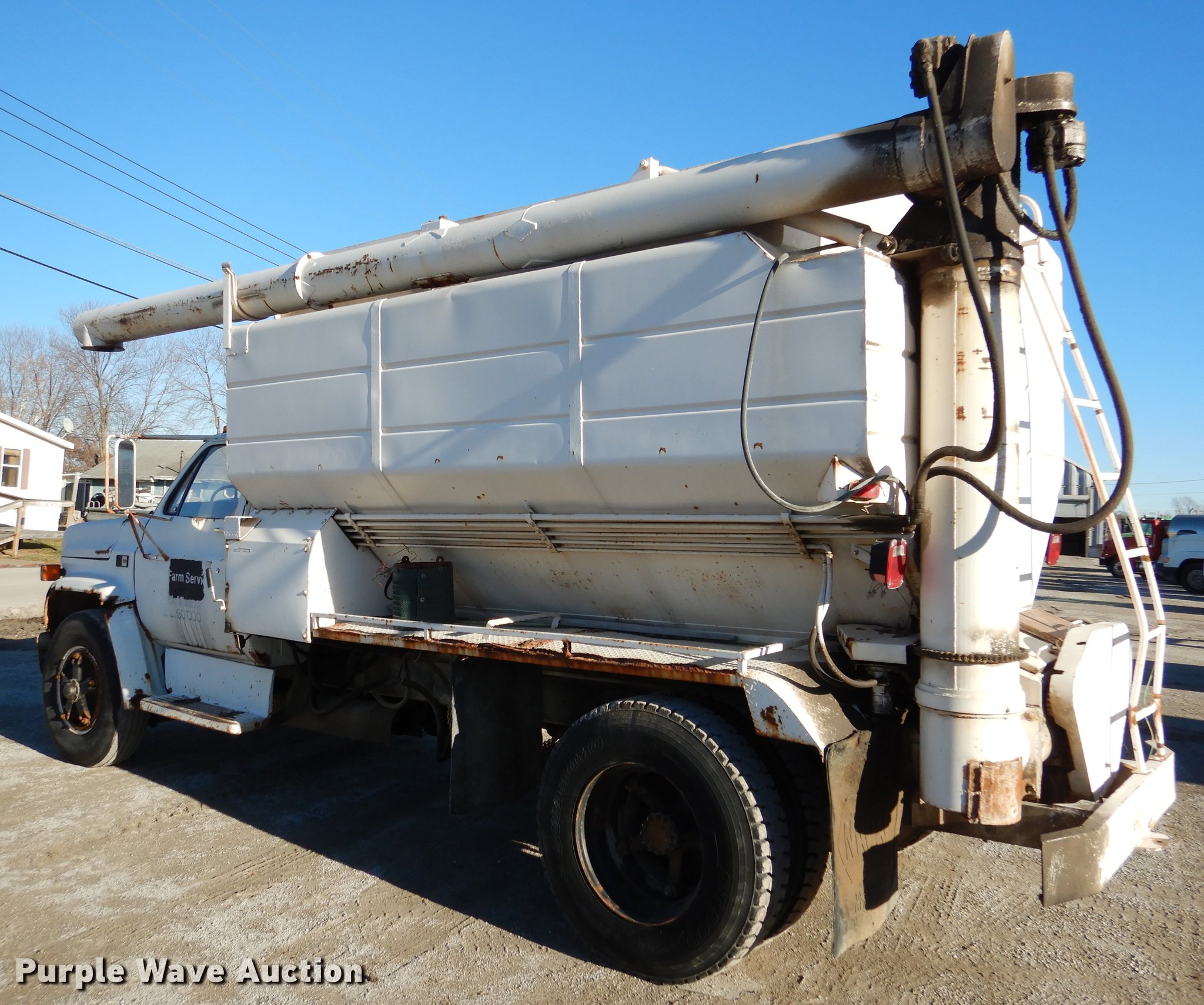 Purple Wave is selling a used Fertilizer or Feed Delivery Truck in Missouri. This item is a 1987 GMC 7000 feed delivery truck with the following: 225,766 miles on odometer, GM 366 C.I.D. V8 gas engine, Five speed manual transmission, Two speed rear end, Single axle, Heat, Model 300-M feed bed, 12'L, Six ton capacity, 16'L side auger, Single exhaust stack, 179" wheelbase, Spring suspension, Hydraulic brakes, 10.00R20 front tires, 11R22.5 rear tires, GVWR 28,000 lbs, FAWR 9,000 lbs, RAWR 19,000 lbs