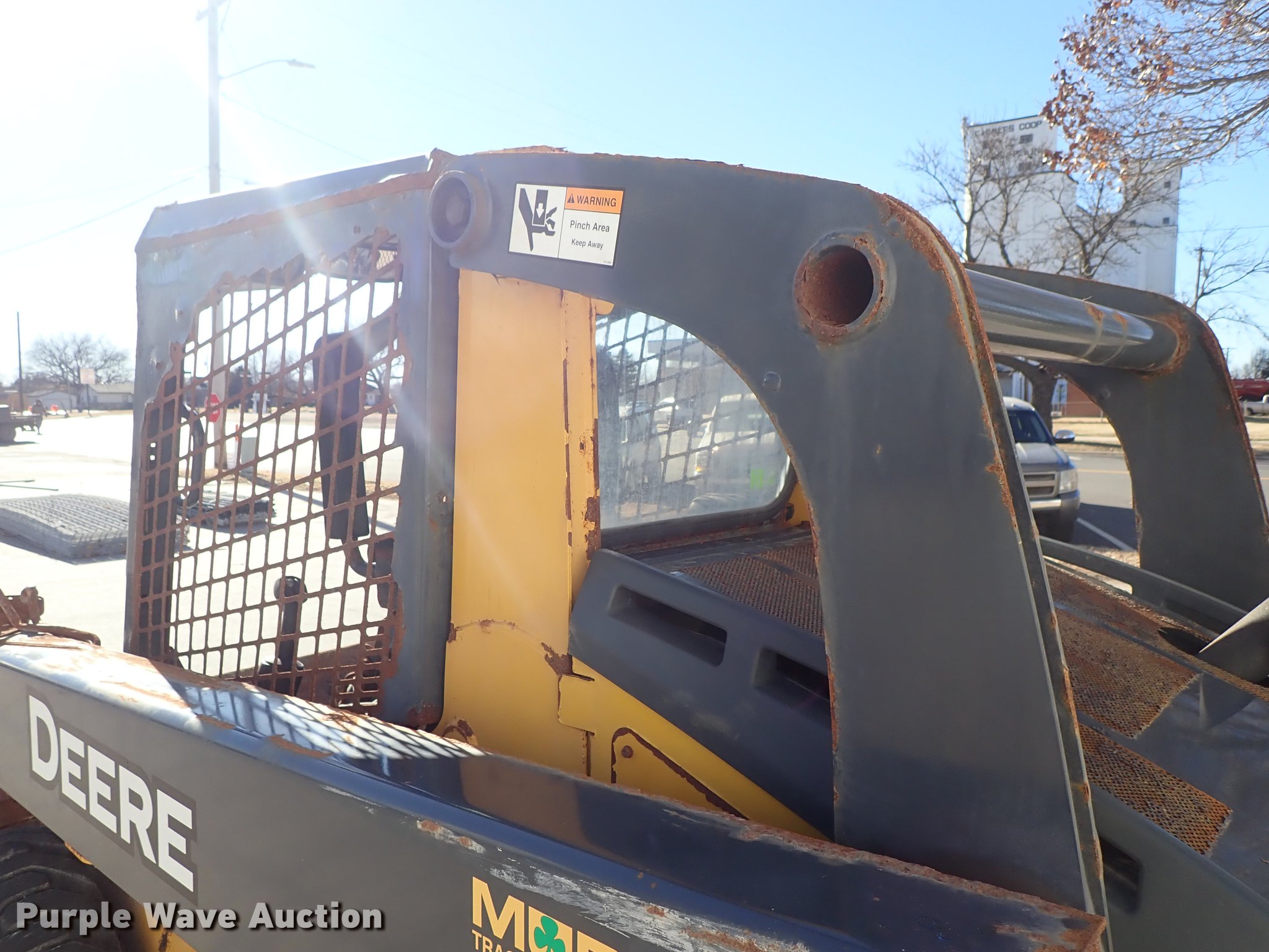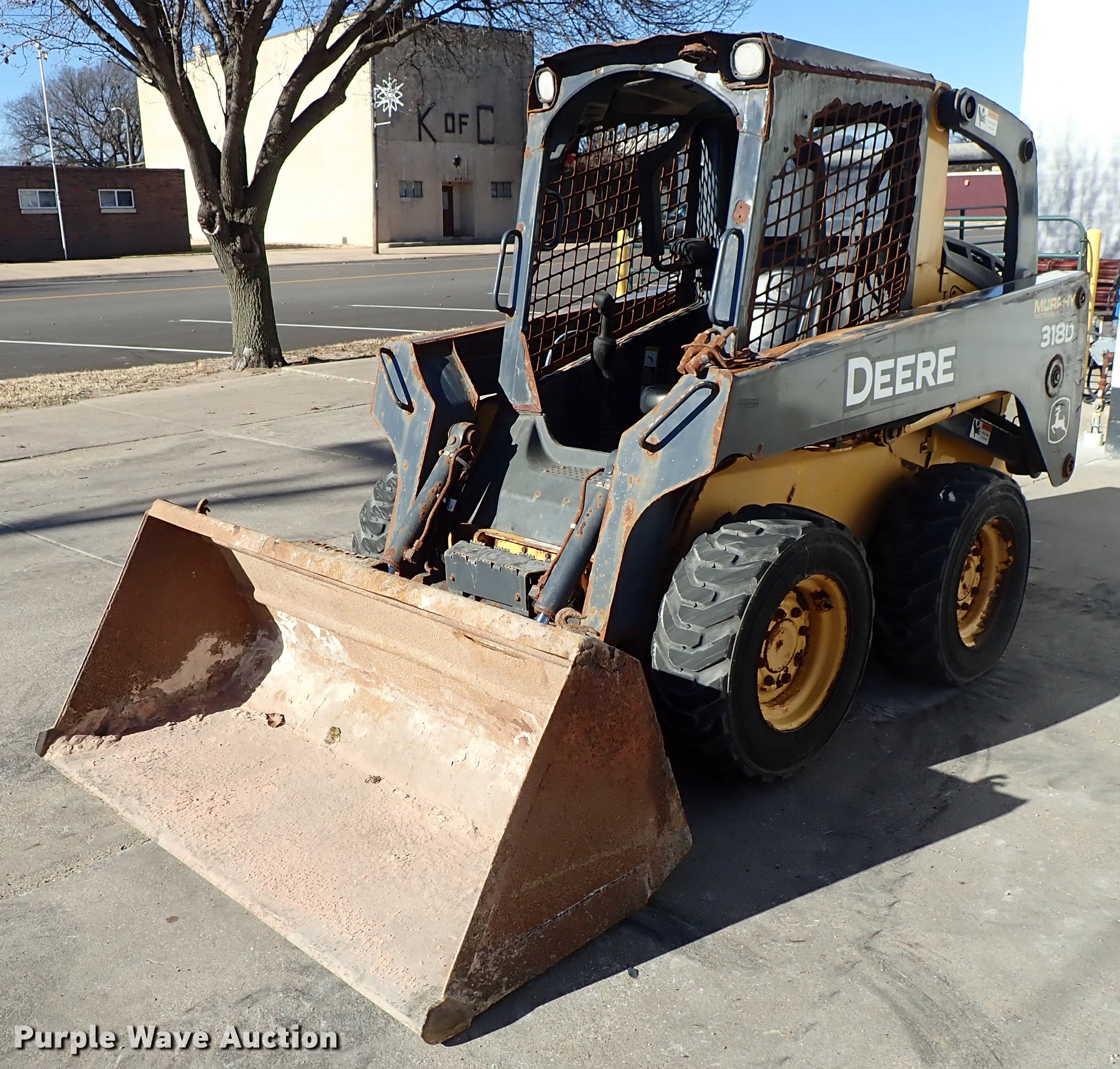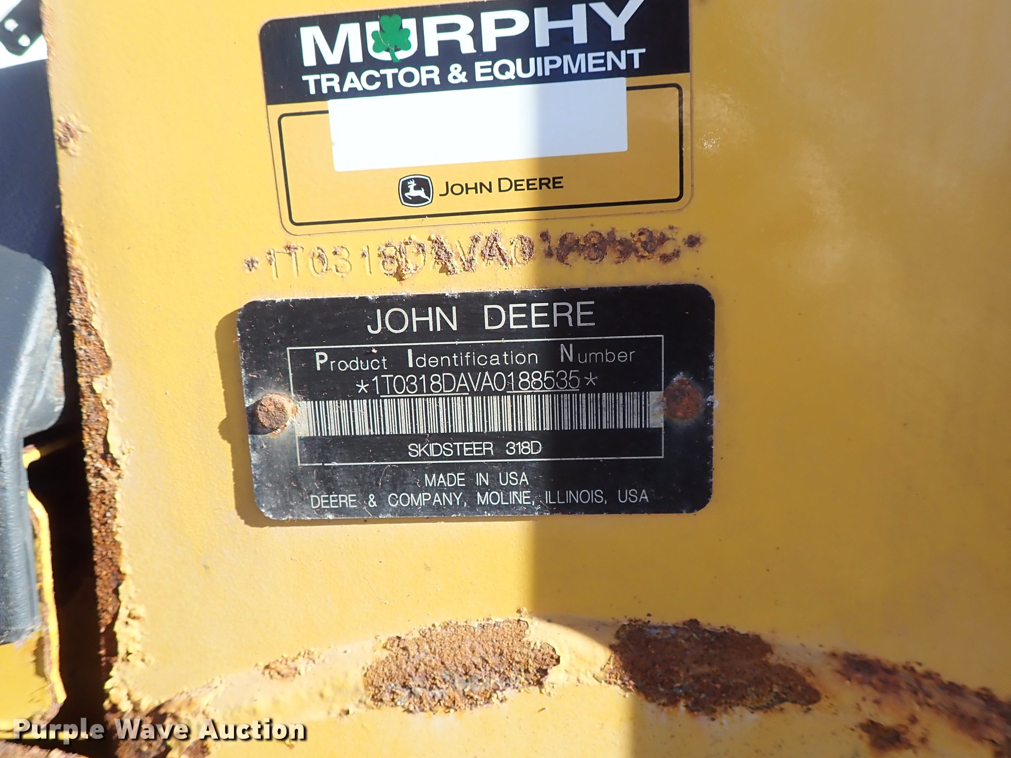 Purple Wave is selling a used Skid Steer Loader in Kansas. This item is a 2010 John Deere 318D skid steer with the following: 1,037 hours on meter, Deisel engine, Hydrostatic transmission, Open station/canopy, Hand and foot controls, Spring suspension seat, Front and rear work lights, 70"W bucket, Auxiliary hydraulics, 10-16.5 tires, Serial 1T0318DAVA0188535