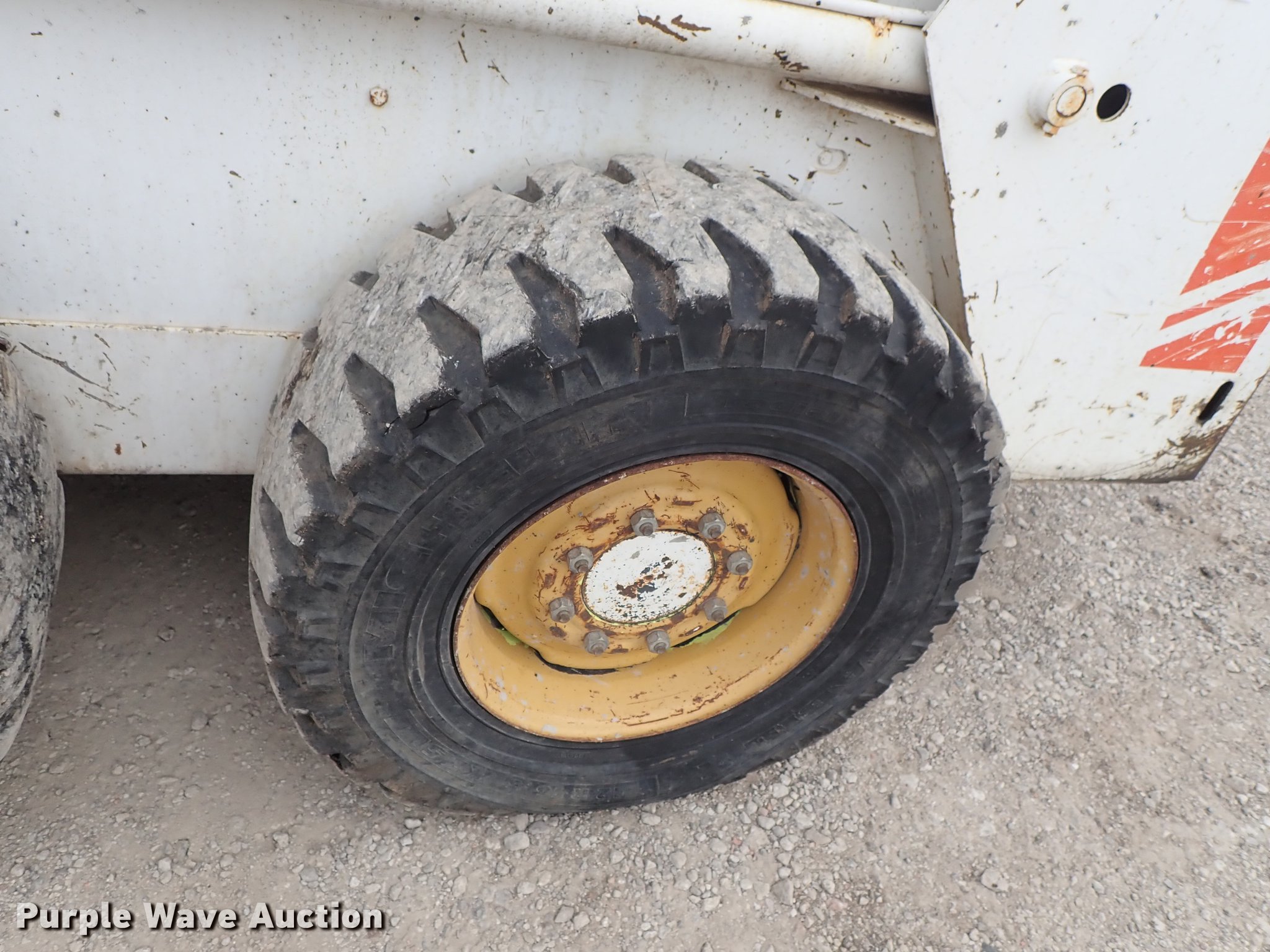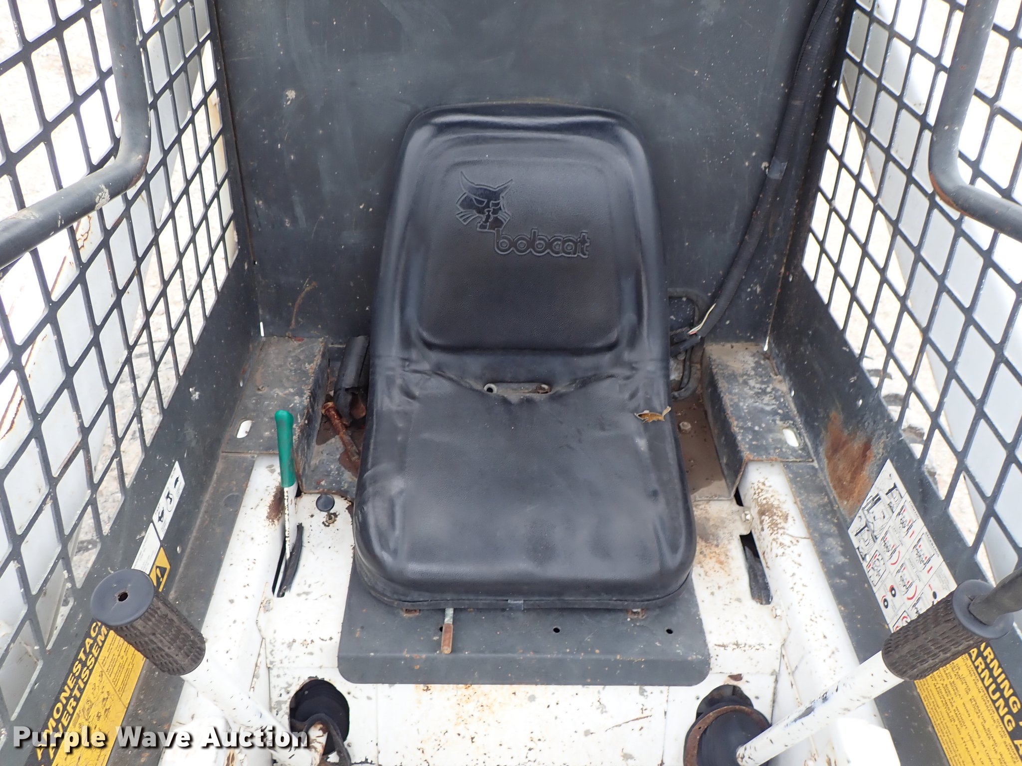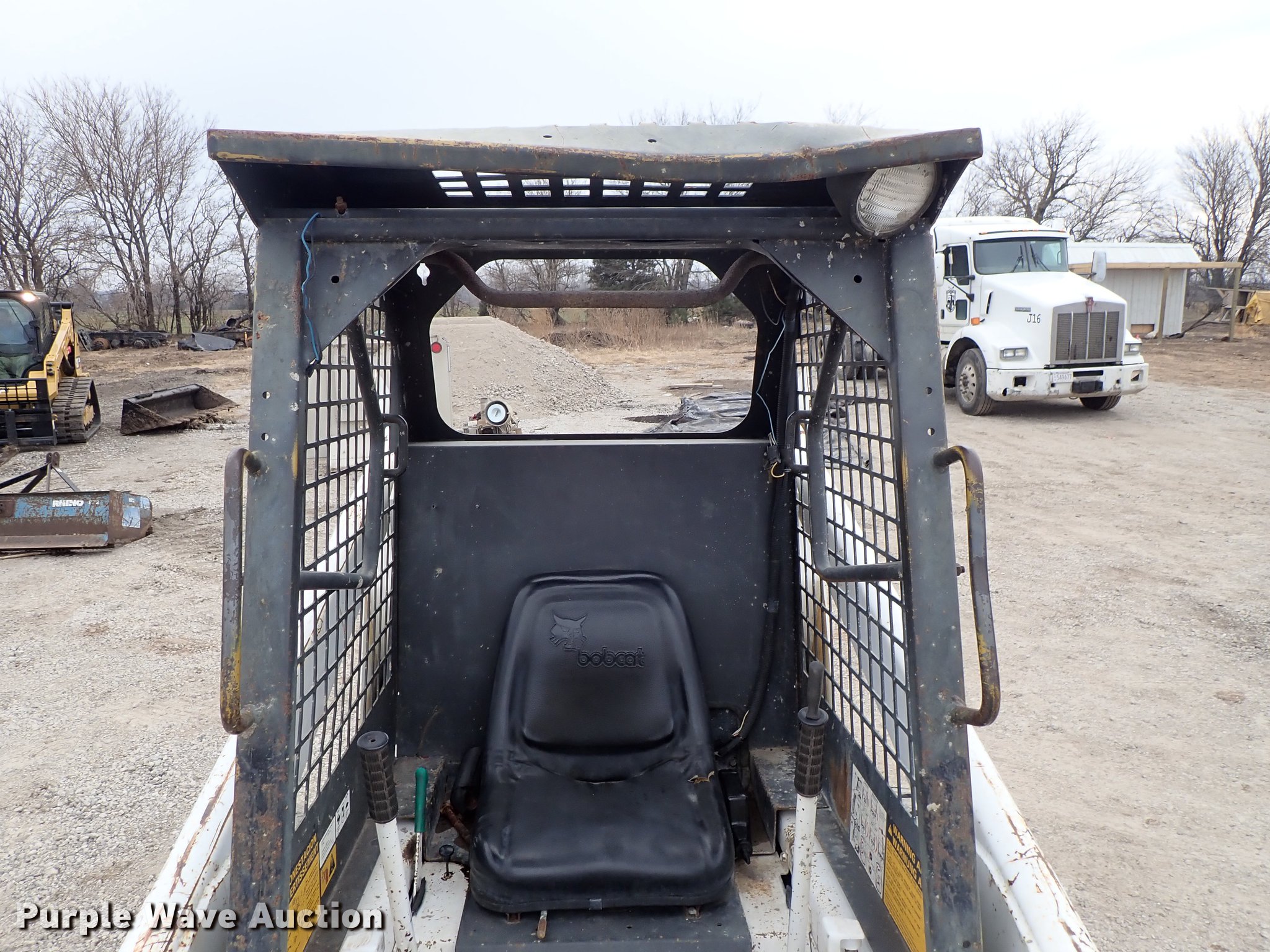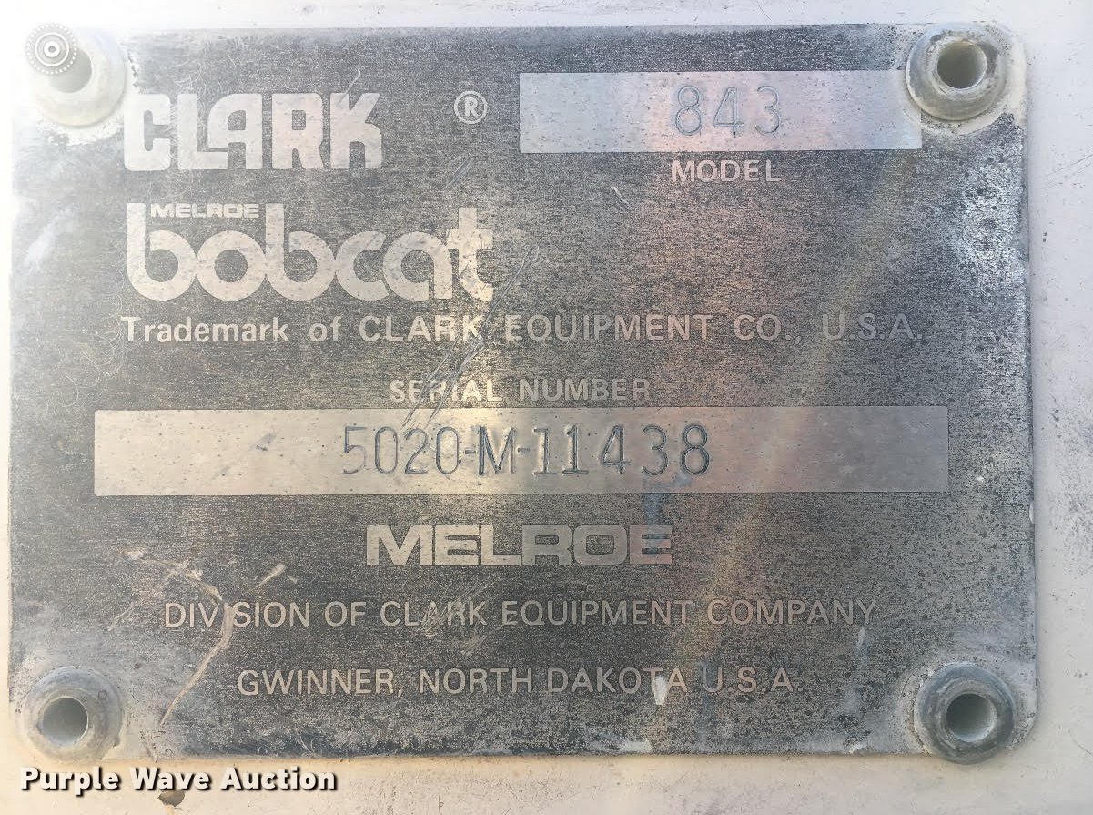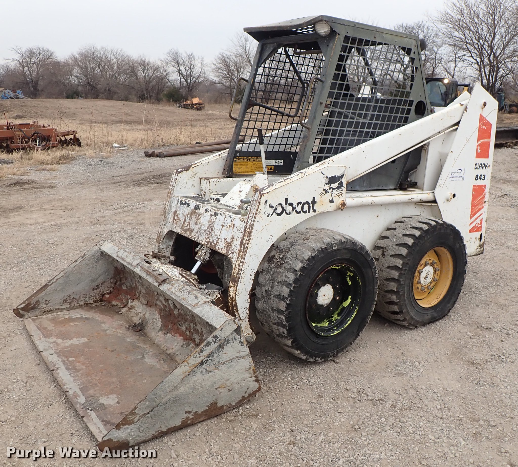 Purple Wave is selling a used Skid Steer Loader in Kansas. This item is a Bobcat 843 skid steer with the following: 2,270 hours on meter, Four cylinder diesel engine, Hydrostatic transmission, Open station/canopy, Hand and foot controls, Spring suspension seat, Front work lights, 72"W bucket, Bolt-on cutting edge, Auxiliary hydraulics, Manual quick coupler, 12R16.5 tires, Front tire flat