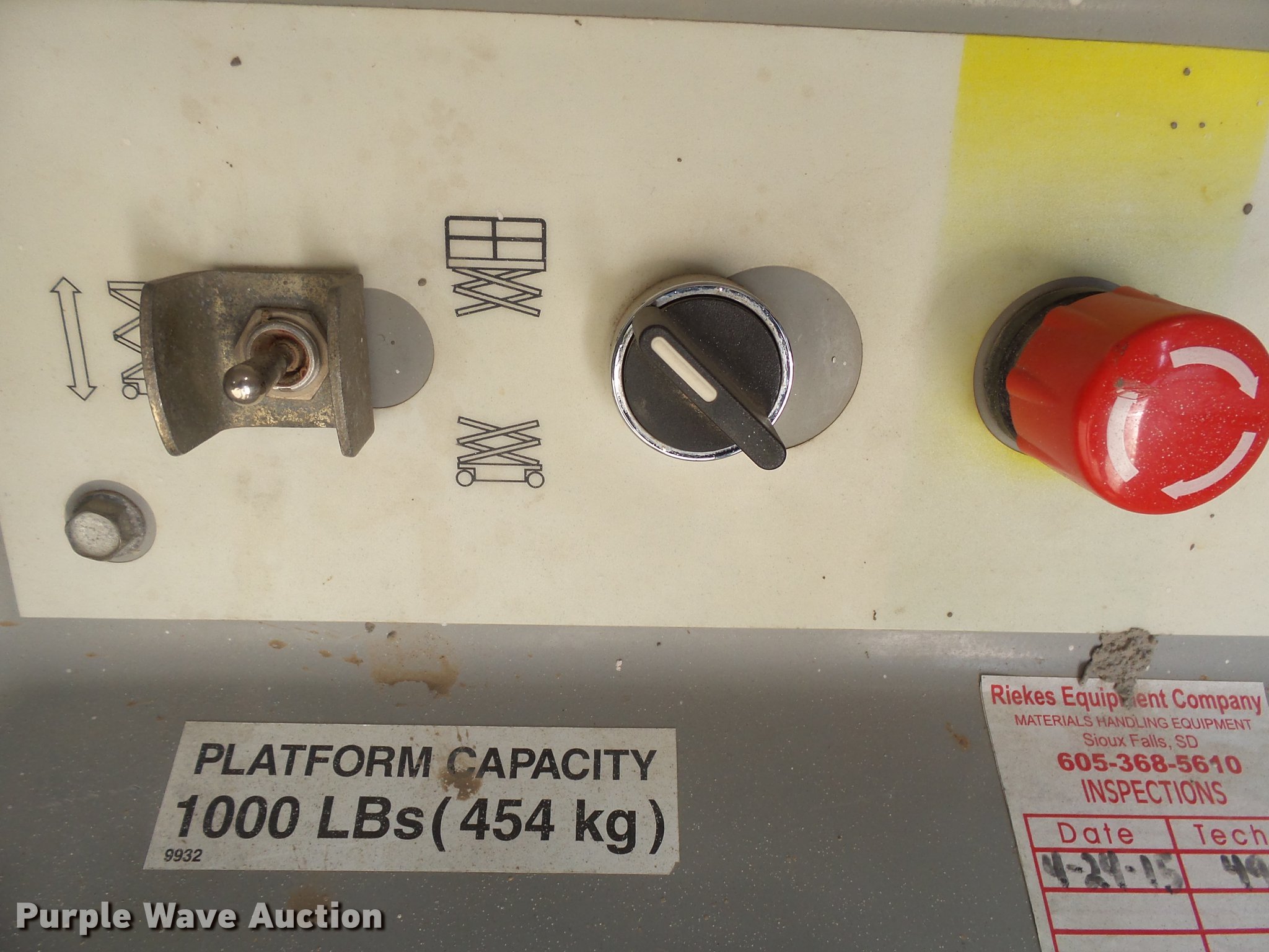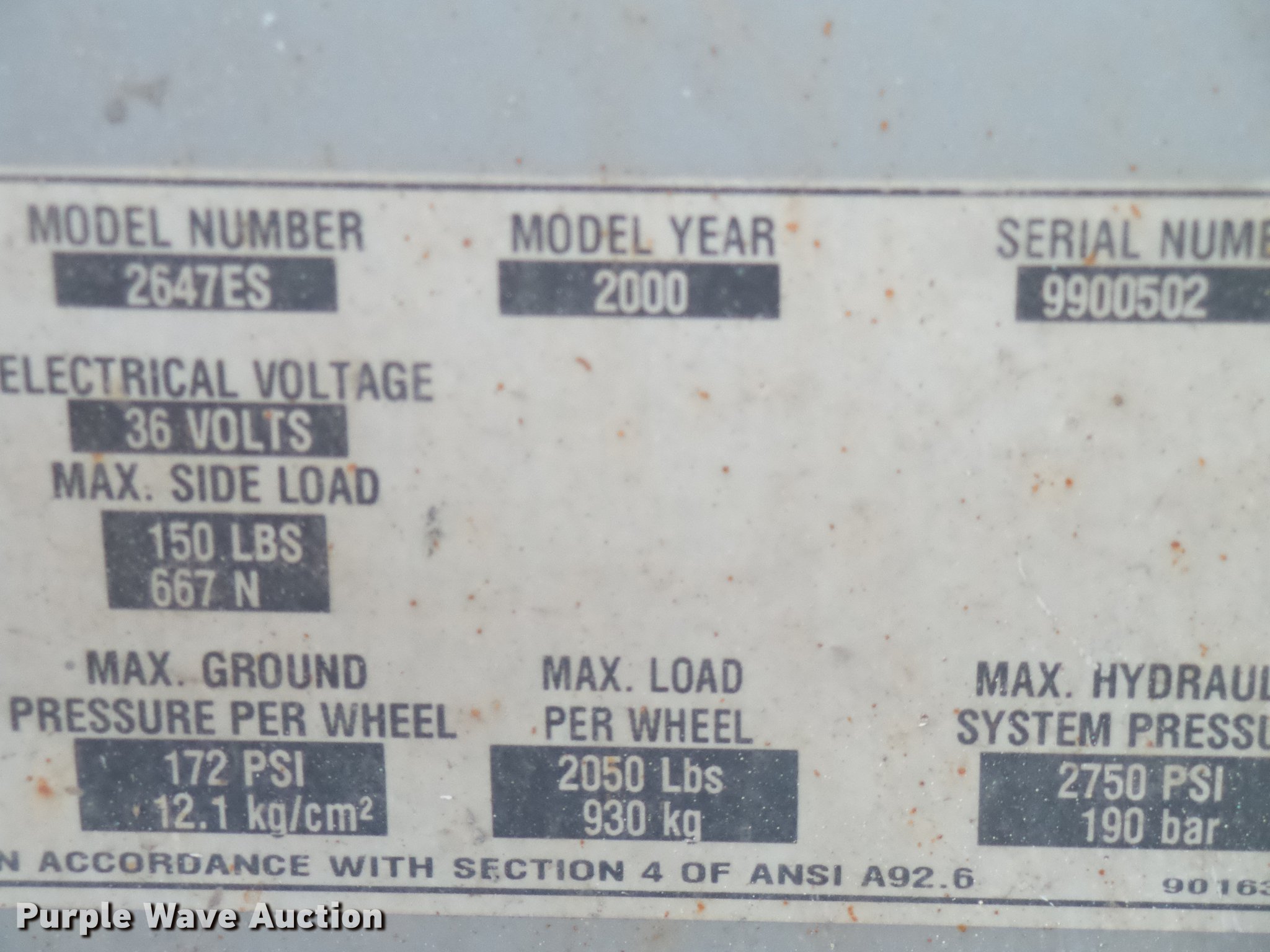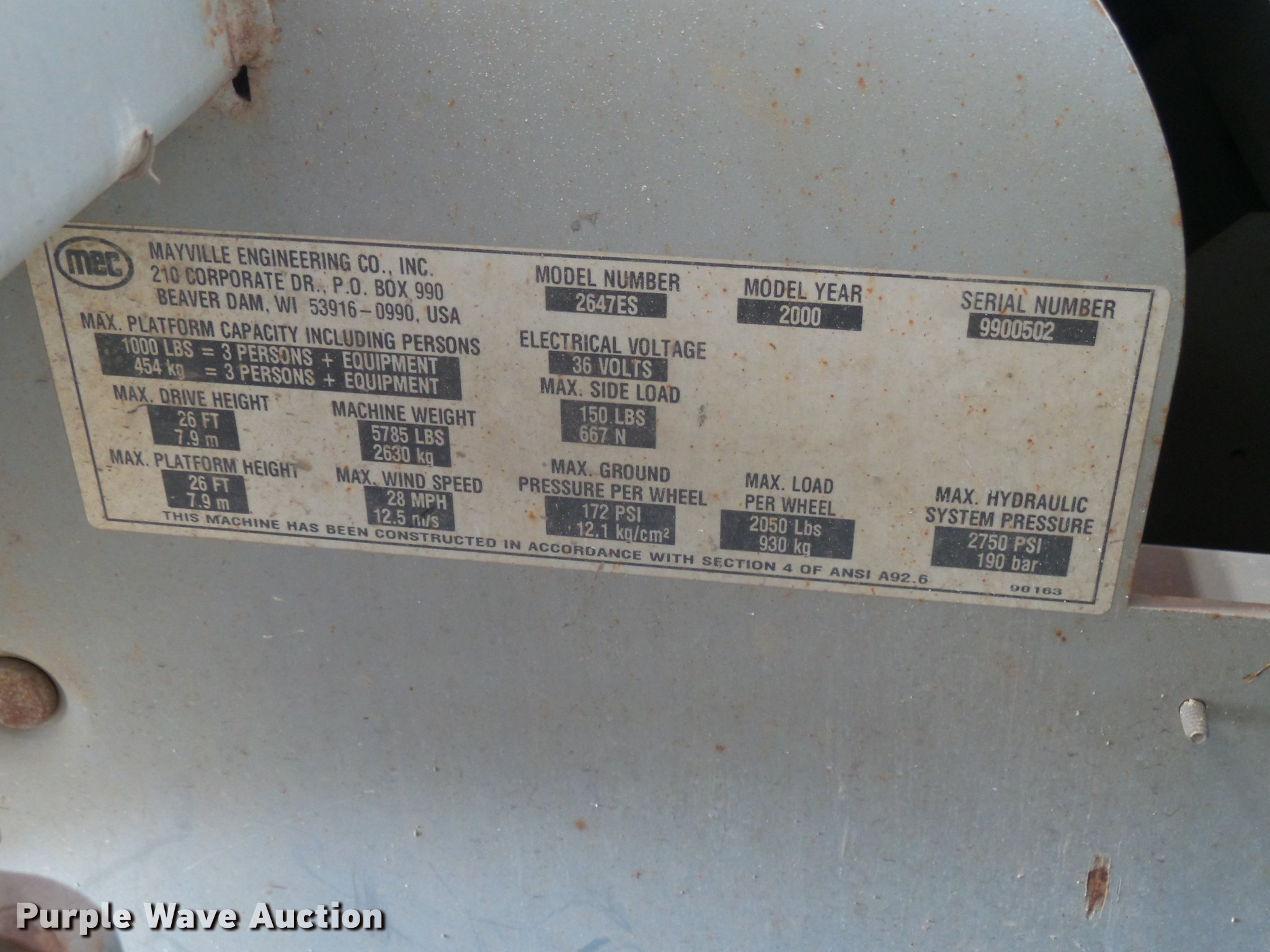 2000 Mec 2647ES scissor lift. 1,053 hours on meter, 36V operation, 1,000 lbs maximum lift capacity, 26' maximum lift height, Platform and ground controls, AC power outlet, Manual platform extensions, Safety alarm, 16 x 5 x 12 solid non-marking tires, 5,785 lbs. base operating weight, Serial 9900502. Muth Electric. 730 N Kimball St. Mitchell, SD 57301