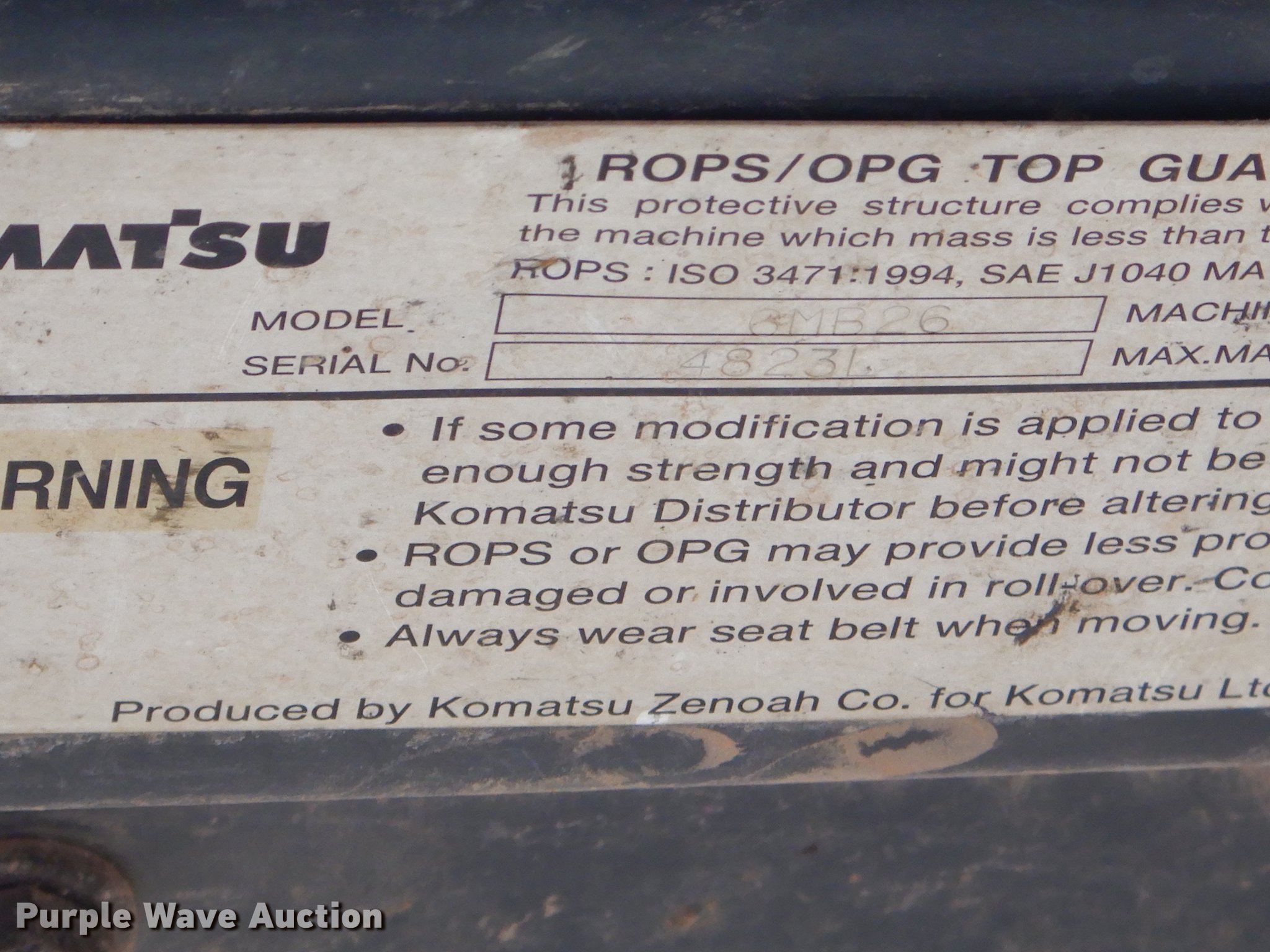 Purple Wave is selling a used Mini Excavator in Oklahoma. This item is a 2006 Komatsu PC35MR-2 mini excavator with the following: 1,297 hours on meter, Yanmar three cylinder diesel engine, Hydrostatic transmission, OROPS, Suspension seat, Front work lights, Standard boom, 63" stick length, 16"W bucket, (4) bolt-on teeth, Auxiliary hydraulics, 68"W backfill blade, 12"W rubber tracks, Non-operational two speed switch, Hydraulic leak, Serial KMTPC096L05006287, Unit# 20.012L