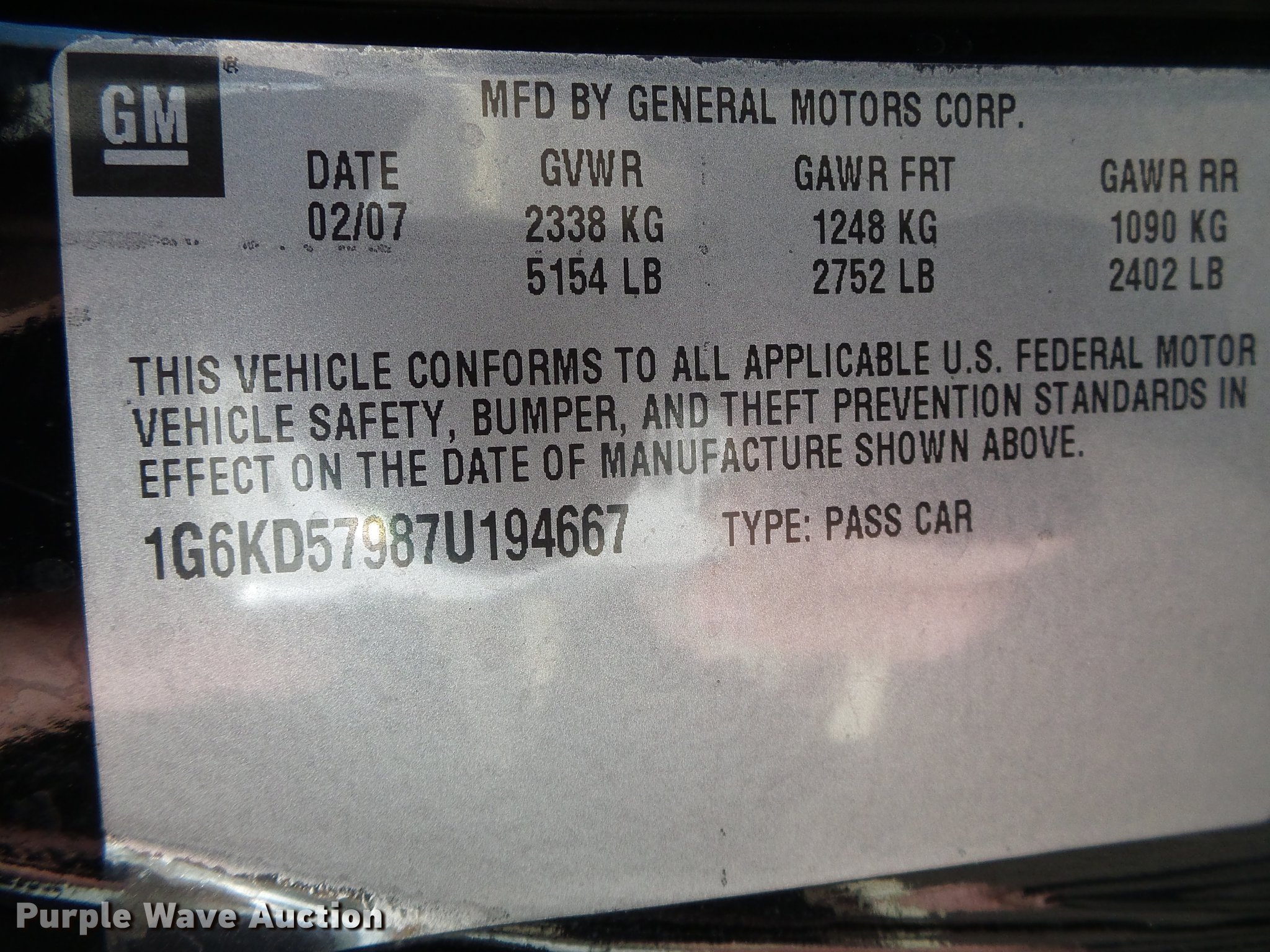 2007 Cadillac DTS. 157,075 miles on odometer, 4.6L V8 DOHC 32V gas engine, Automatic transmission, AC and heat, Tilt, Cruise, AM/FM, Power windows, locks, mirrors, and seats, Heated seats, Leather interior, Bomb sound system, Fog lights, 245/30ZR22 tires, Passenger front wheel bent. Kansas title. Title history is unknown. Seized vehicle. Condition and history are unknown. No additional information is available. 1G6KD57987U194667. Liberal Police Department. 301 N Washington Ave. Liberal, KS 67901