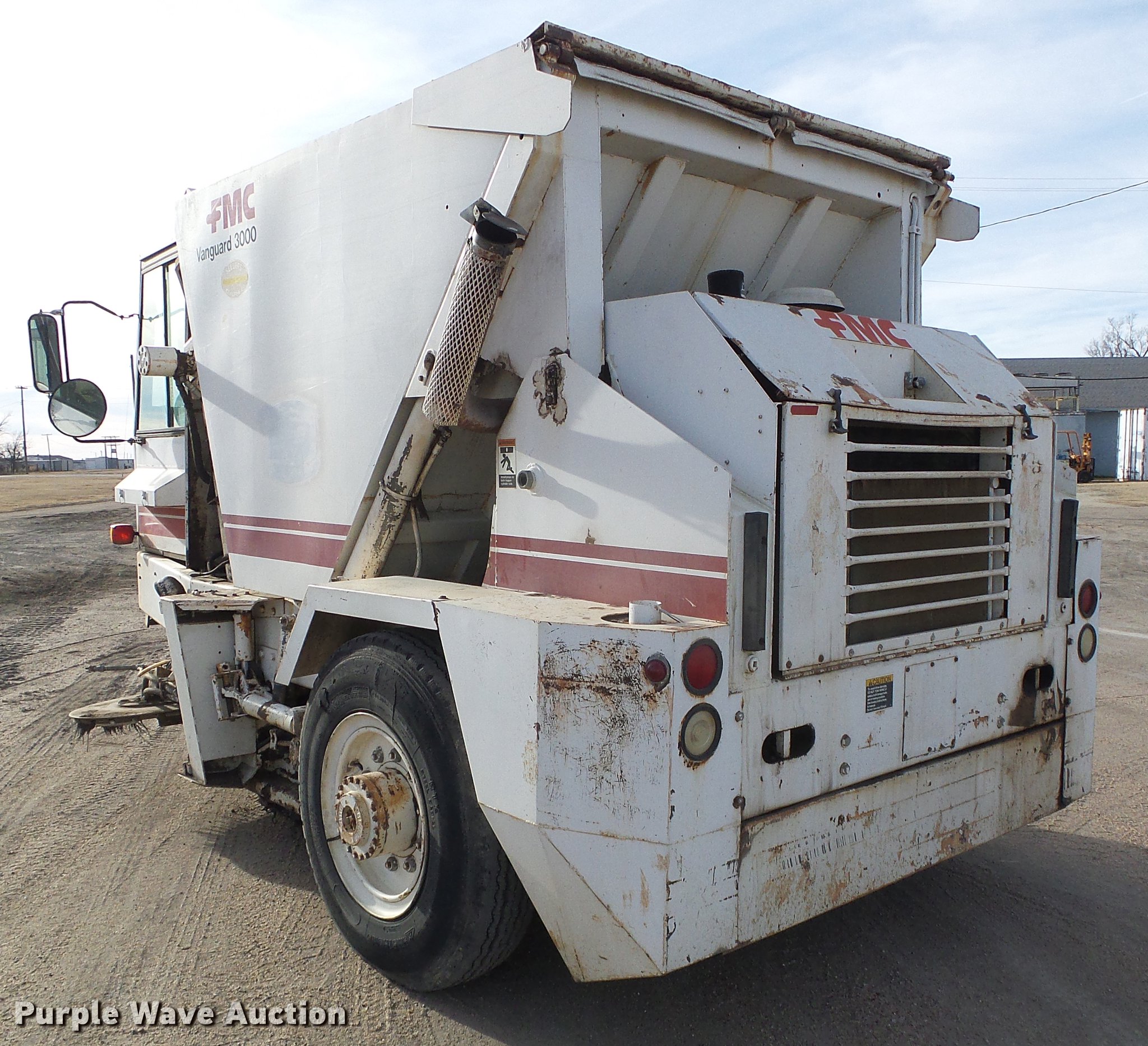 Purple Wave is selling a used Sweeper in Kansas. This item is a 1986 FMC Vanguard 3000 street sweeper with the following: 77,743 miles on odometer, 2,521 hours on meter, Detroit Diesel 40877100 8.2L eight cylinder diesel engine, Two speed hydrostatic transmission, Wipers, Work lights, 10.00R15 TR front tires, 10.00R20 rear tires, Batteries weak, Bearings and brushes need replaced, Oil leaks