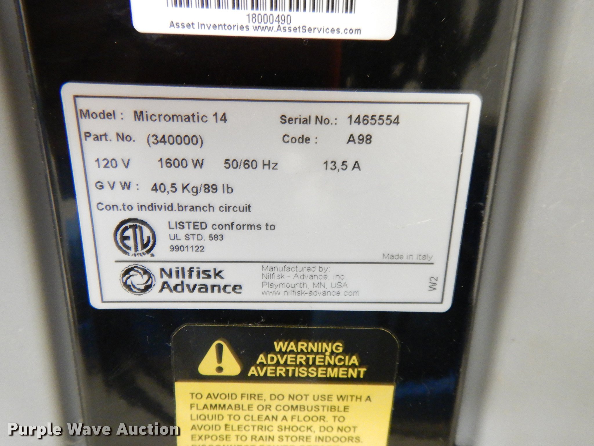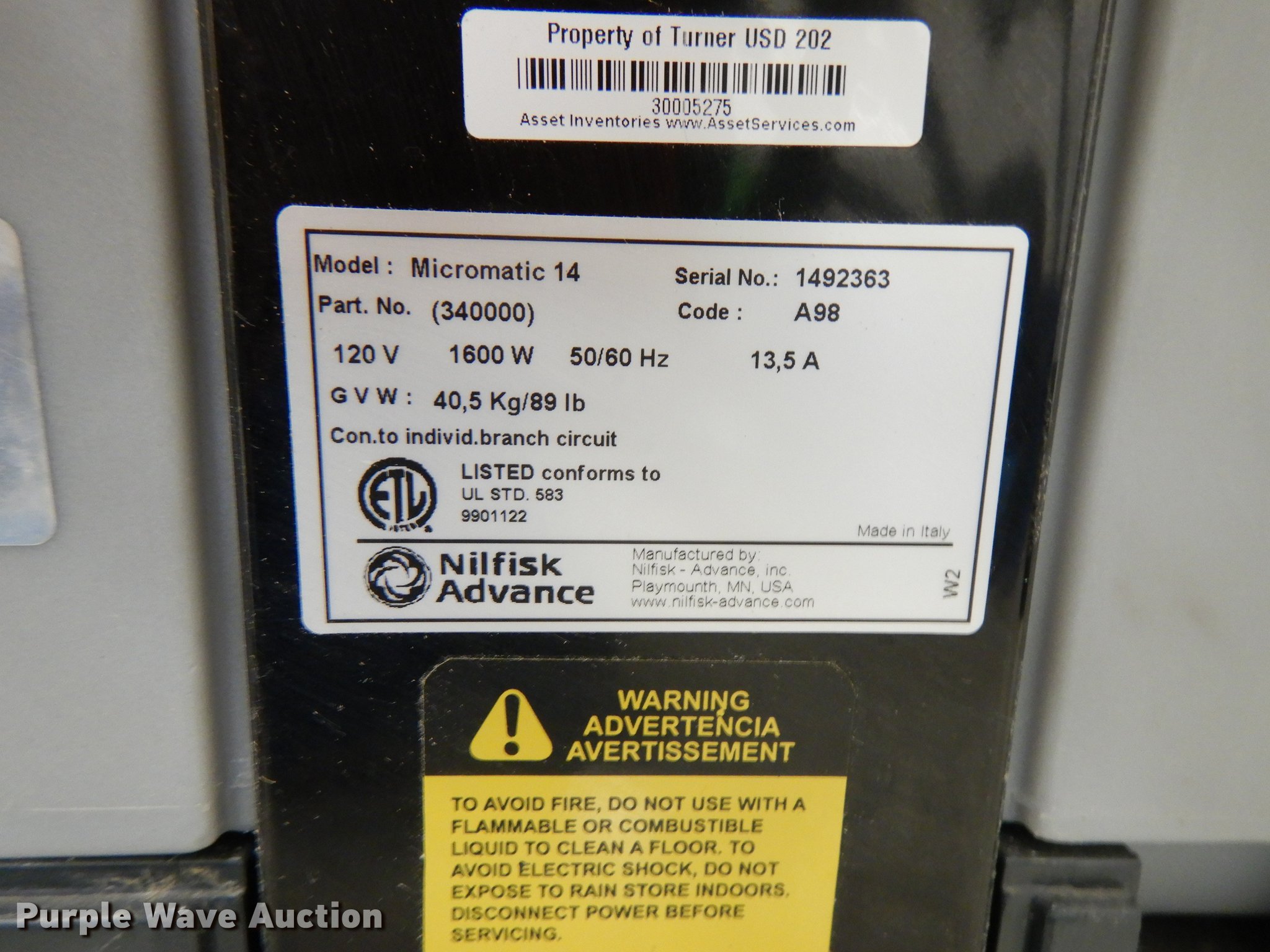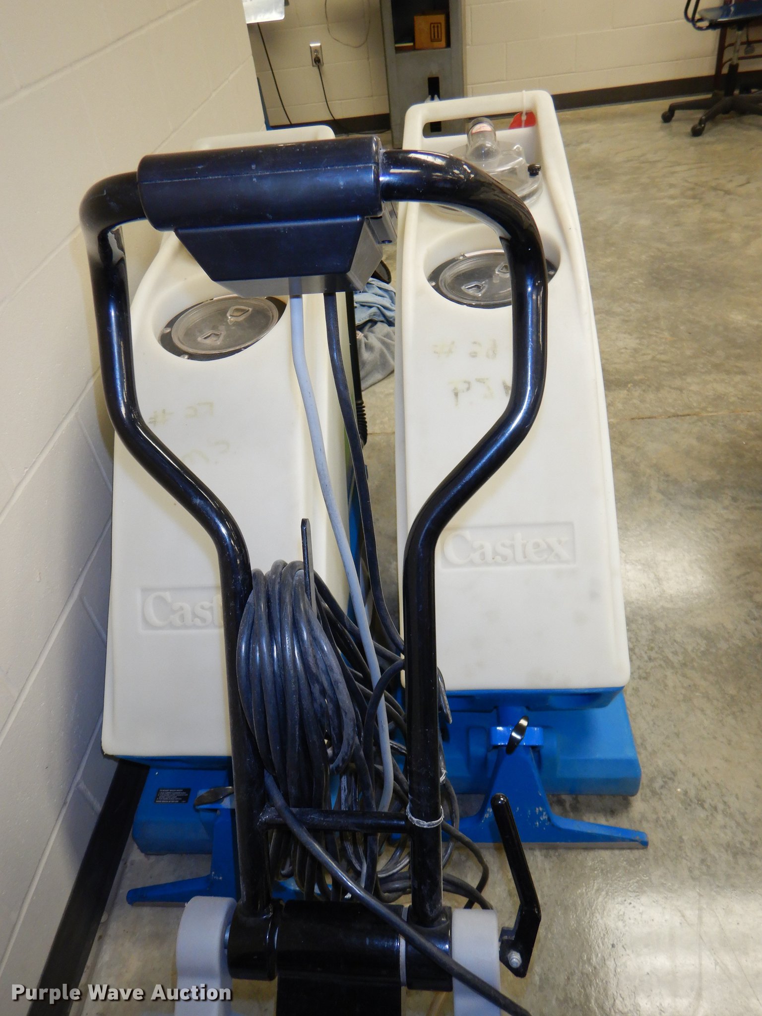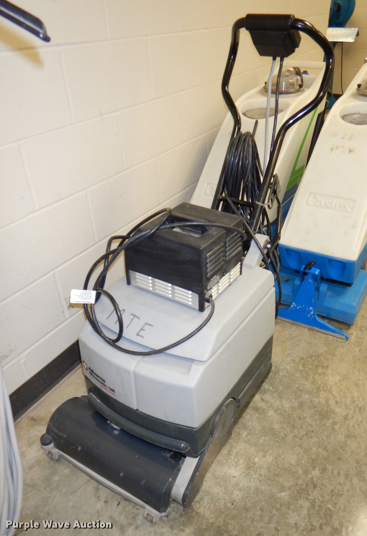 Purple Wave is selling a used All Other Household Items in Kansas. This item is a (2) Advance Micromatic 14E floor scrubbers with the following: Chargers, Serial 1465554, 1492363