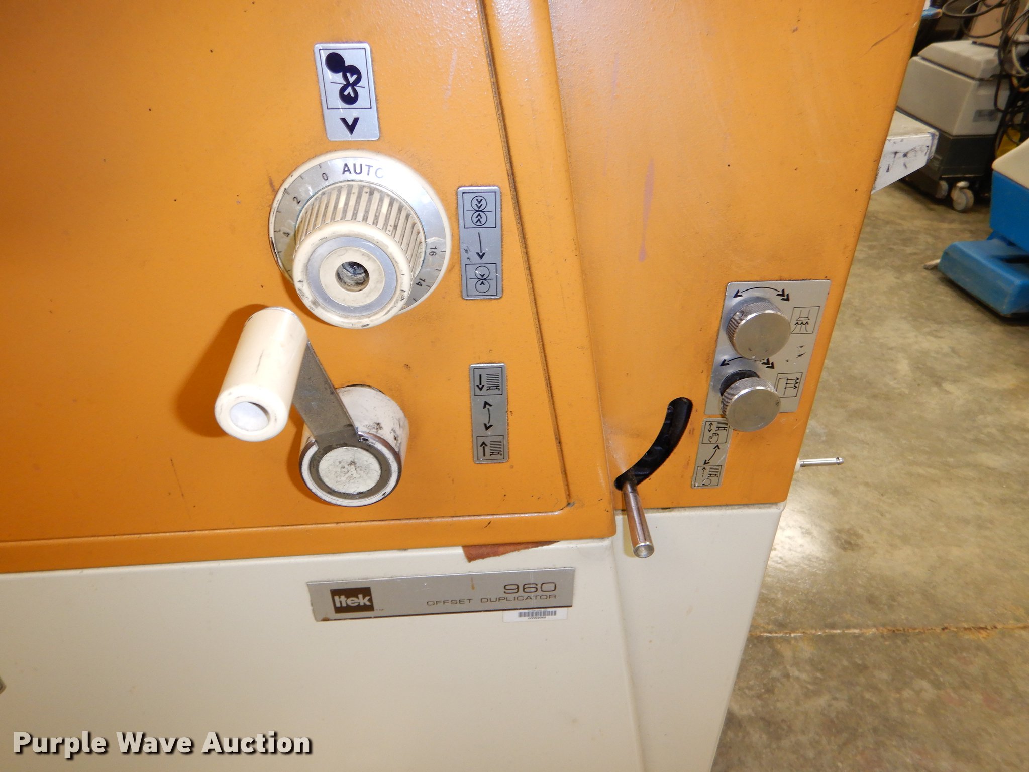 Itek 960 offset duplicator press has sold in Kansas City, Kansas for $165. Item EA9119 sold on January 22nd, 2019.
