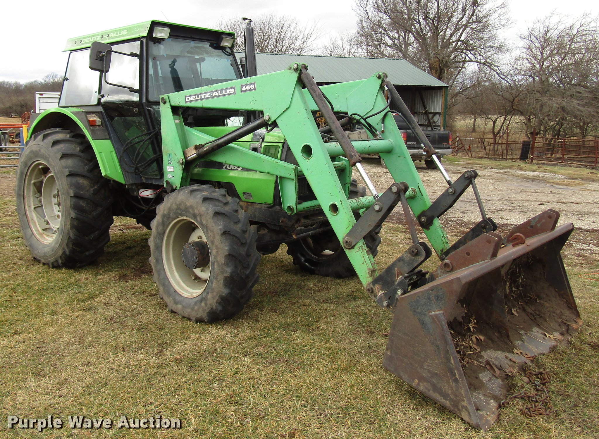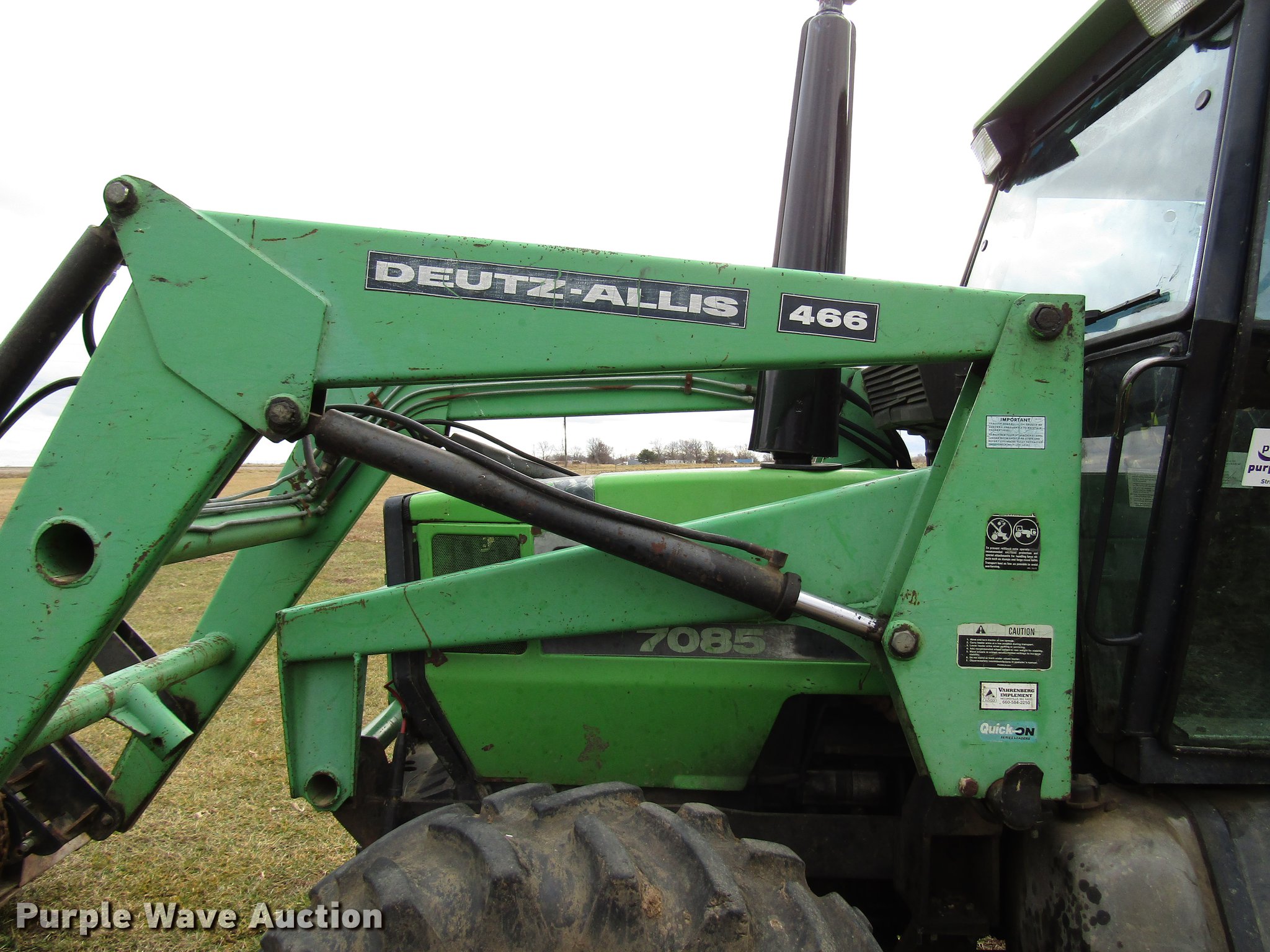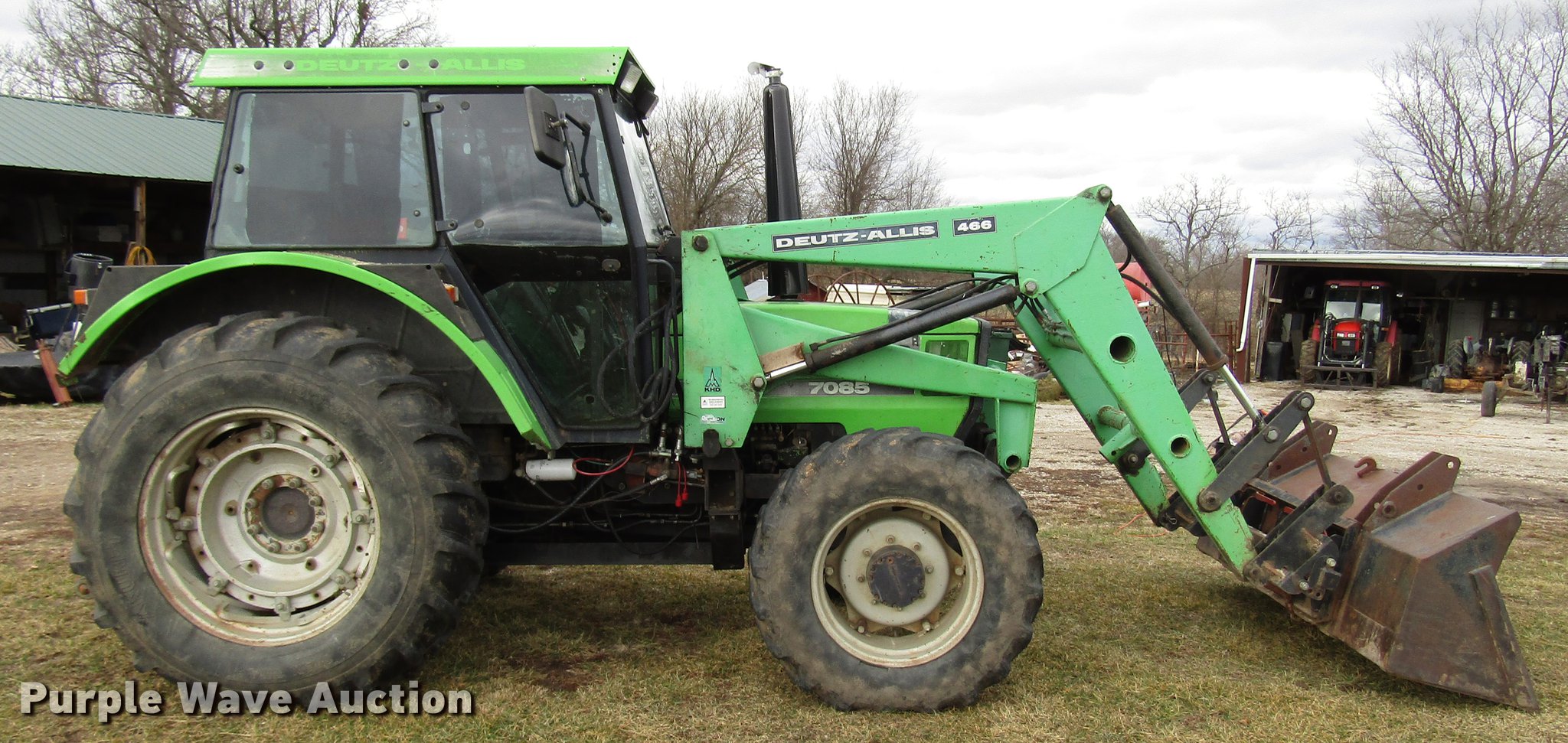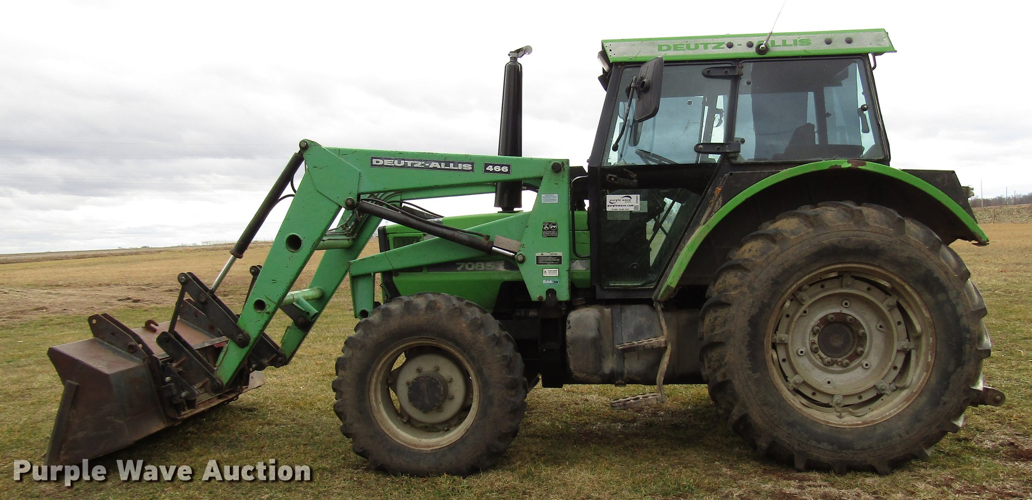 Purple Wave is selling a used Tractor in Missouri. This item is a Deutz Allis 7085 MFWD tractor with the following: 8,466 hours on meter, Deutz four cylinder turbo diesel engine, Serial BF4L913, Synchro transmission, 20F-5R, Differential lock, AC and heat, Tilt steering wheel, AM/FM, Suspension seat, Block heater, Deutz Allis 466 loader, 83"W bucket, Quick attach, Joystick controls, Three point, 540/1000 PTO, (2) rear hydraulic remote sets, 97" wheelbase, 13.6-24 front tires, 18.4-34 rear tires, Possible transmission issues, Weak battery, Steering cylinder hydraulic leak, Serial 7435464