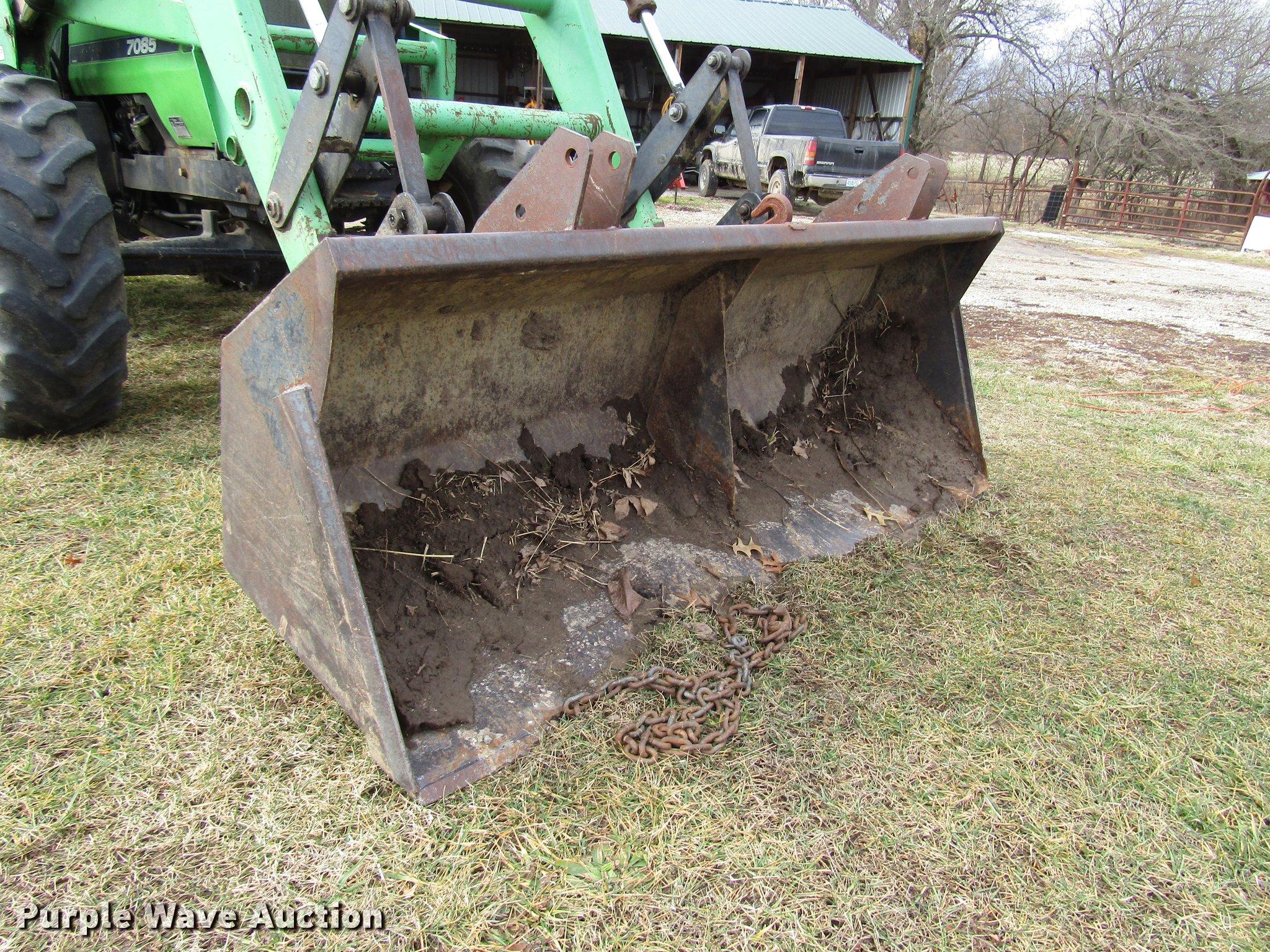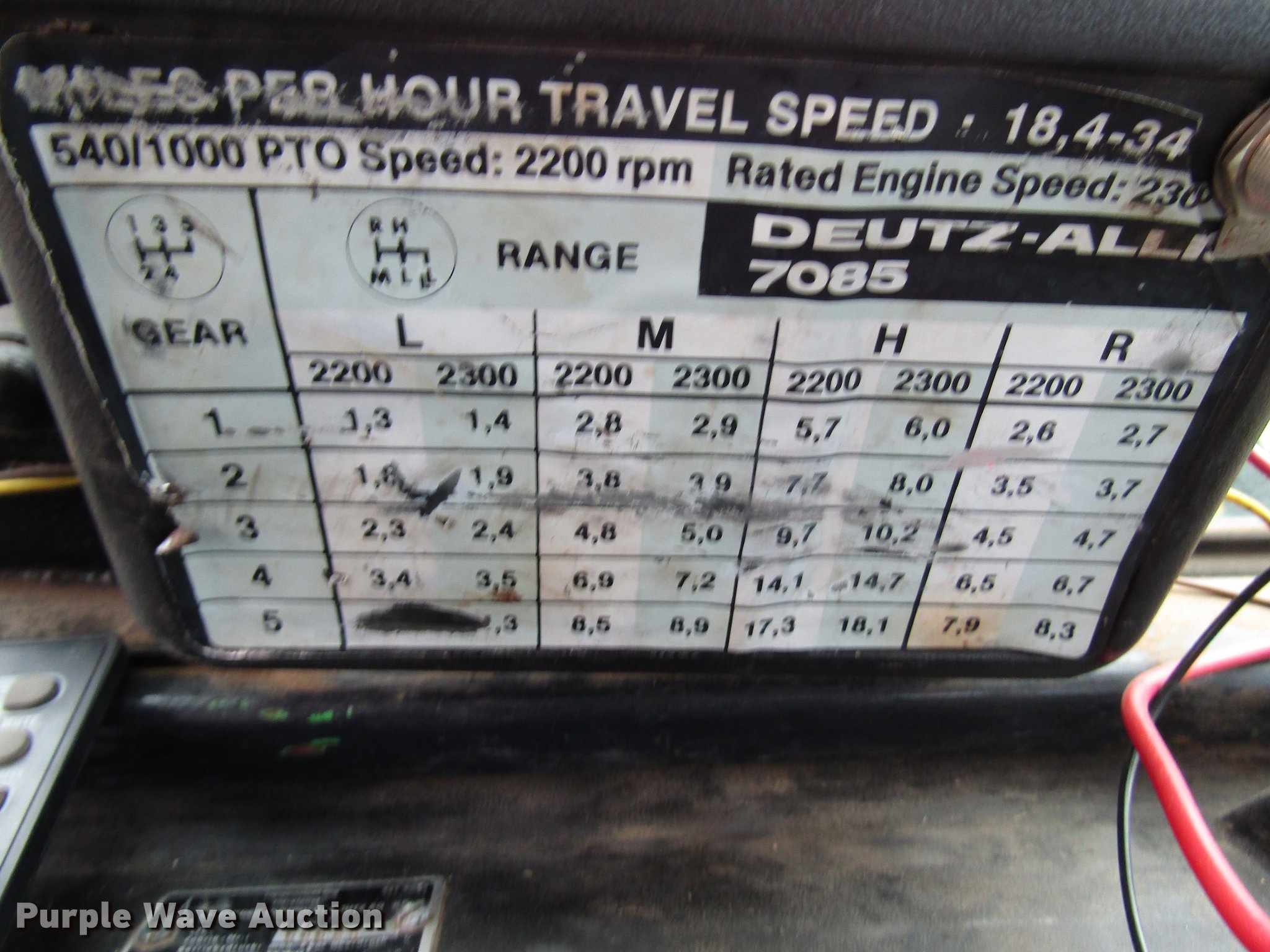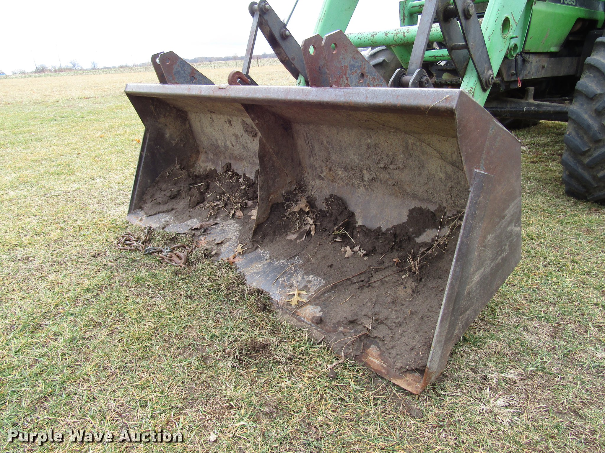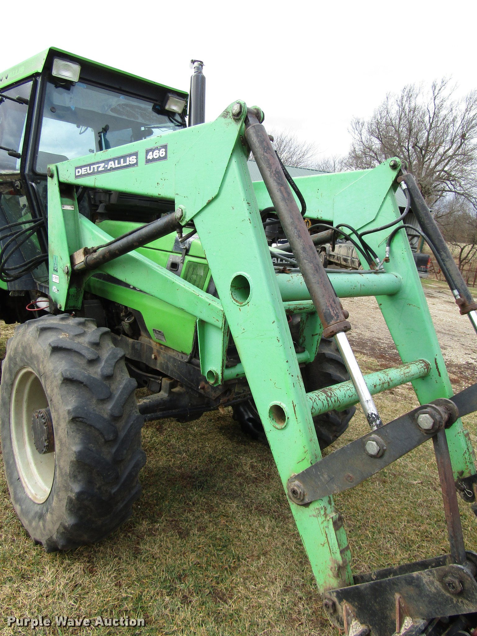 Purple Wave is selling a used Tractor in Missouri. This item is a Deutz Allis 7085 MFWD tractor with the following: 8,466 hours on meter, Deutz four cylinder turbo diesel engine, Serial BF4L913, Synchro transmission, 20F-5R, Differential lock, AC and heat, Tilt steering wheel, AM/FM, Suspension seat, Block heater, Deutz Allis 466 loader, 83"W bucket, Quick attach, Joystick controls, Three point, 540/1000 PTO, (2) rear hydraulic remote sets, 97" wheelbase, 13.6-24 front tires, 18.4-34 rear tires, Possible transmission issues, Weak battery, Steering cylinder hydraulic leak, Serial 7435464