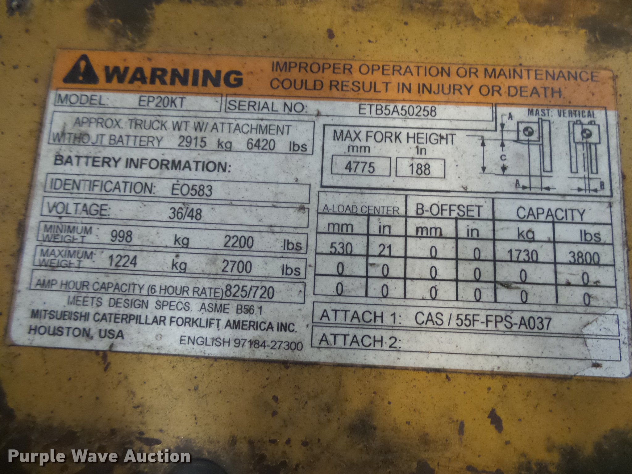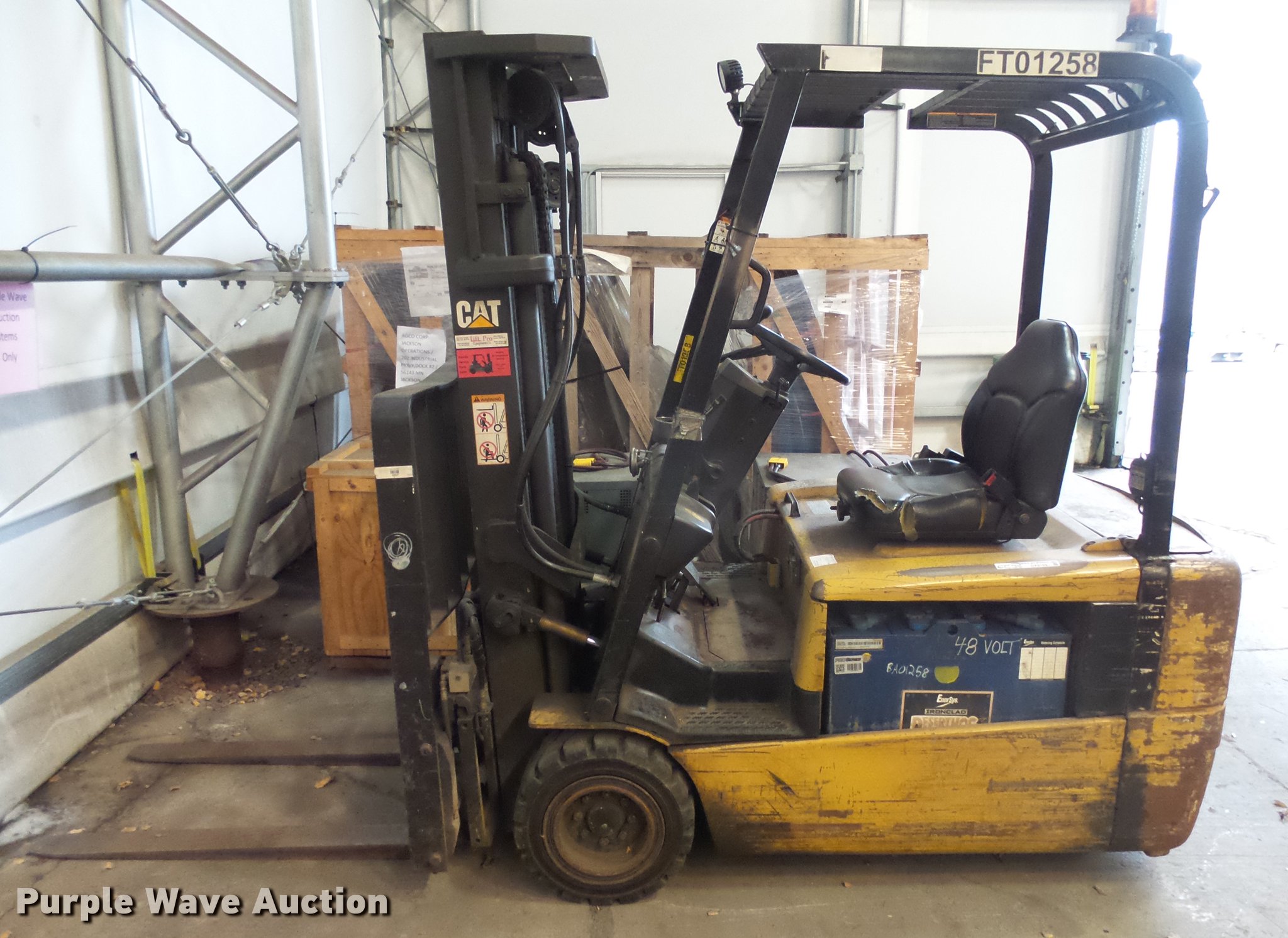 Purple Wave is selling a used Warehouse Forklift in Minnesota. This item is a Caterpillar EP20KT forklift with the following: 682 hours on meter, 48V electric operation, 1F-1R, Work lights, Backup alarm, 4,000 lbs max. lift capacity, 15' max. lift height, Three stage mast, Side shift, Mast tilt, 42" fork length, 18x7x12.1 solid front tires, 15x5x11.2 solid rear tires, Battery-Mate charger, Dead battery, Serial ETB5A50258