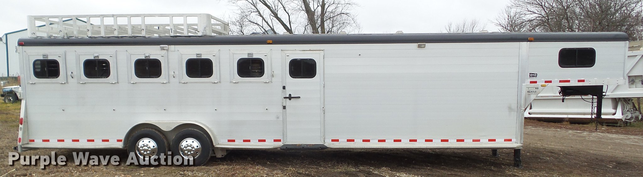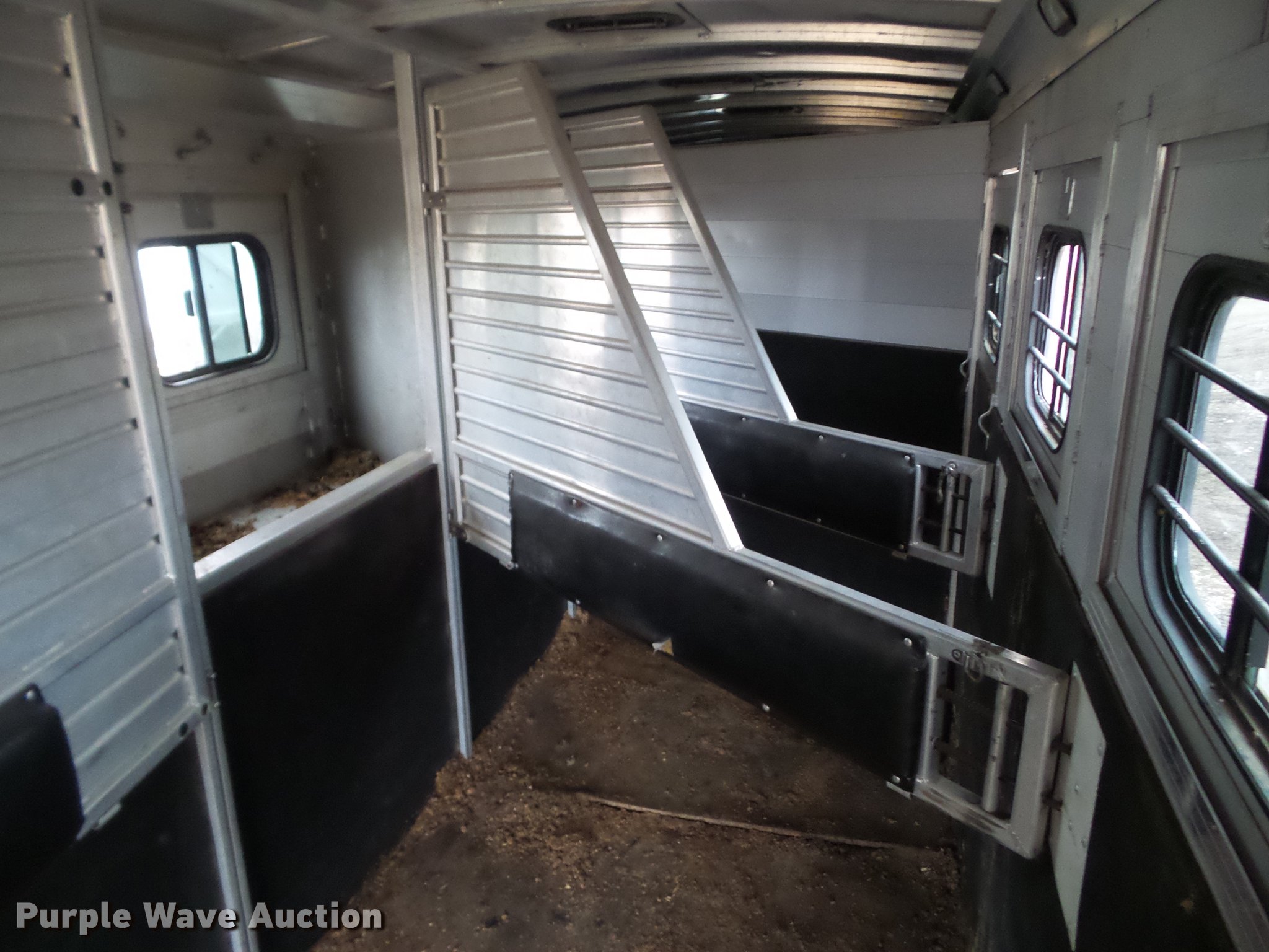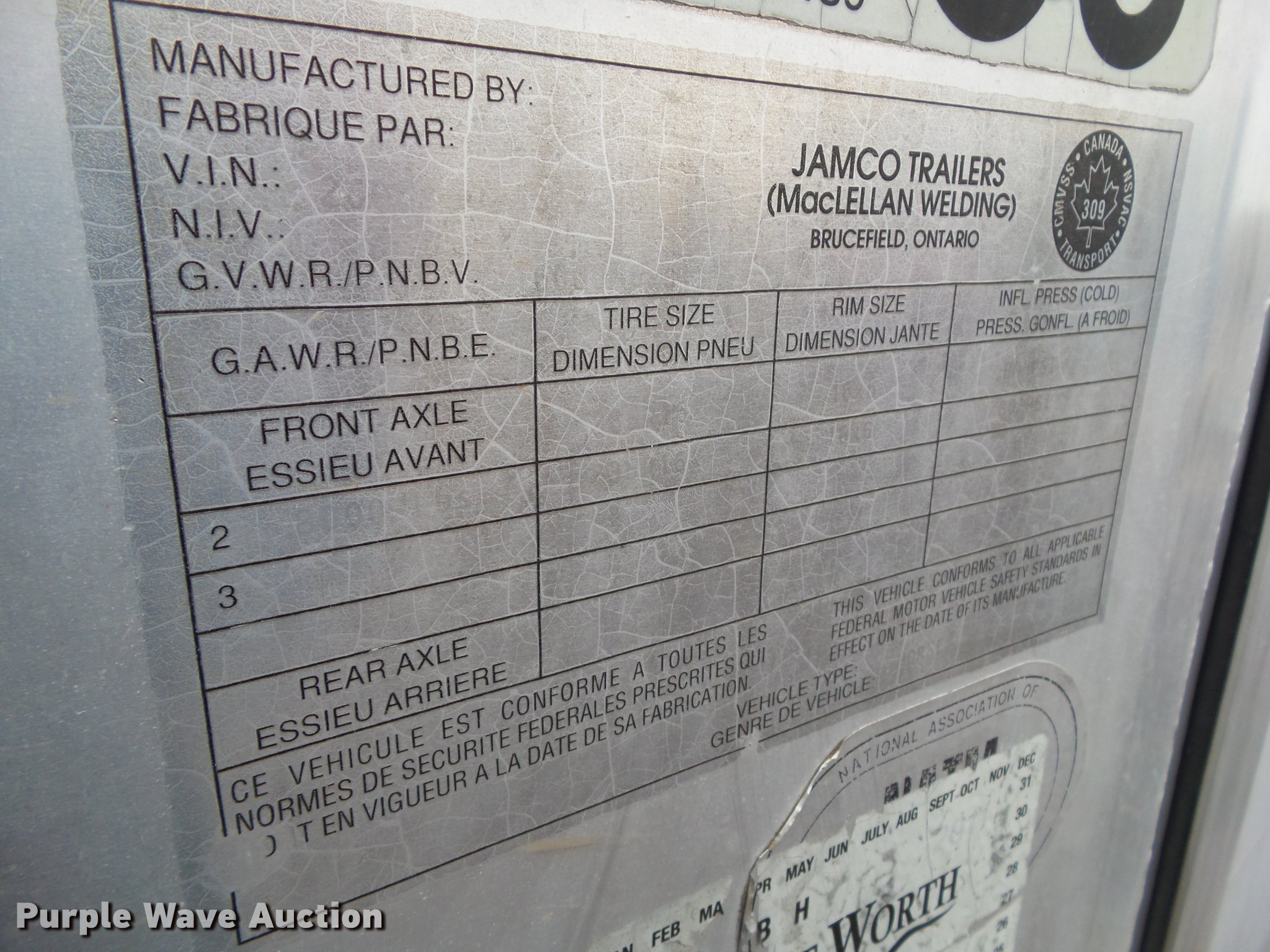 Purple Wave is selling a used Livestock Trailer in Iowa. This item is a 1995 Jamco livestock trailer with the following: 40.5'L x 100"W overall, Aluminum construction, Gooseneck hitch, Dual leg landing gear, (6) horse capacity, Tack room/area, Side door, Full swing rear door, Dock bumper, Rubber floor mat, Interior lighting, Rear ladder, Hay platform, Air suspension, Electric brakes, ST225/90R16 tires