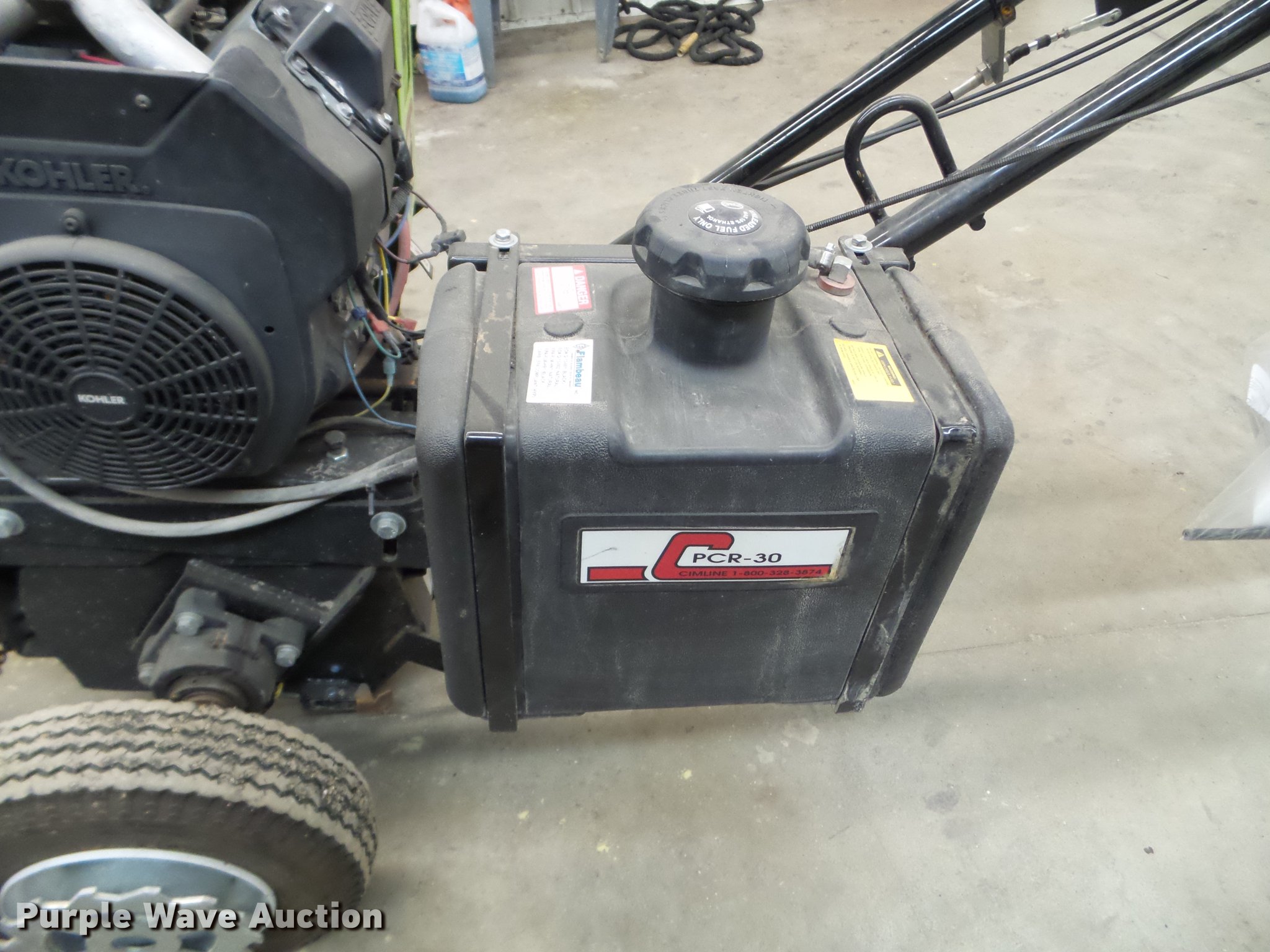 Cimline PCR-30 crack sealer router. Kohler Command Pro single cylinder gas engine 27 HP, 4.80/4.00-8 tires, Serial 17-3509. Precision Roadway Services. 602 3rd Ave E. Osakis, MN 56360