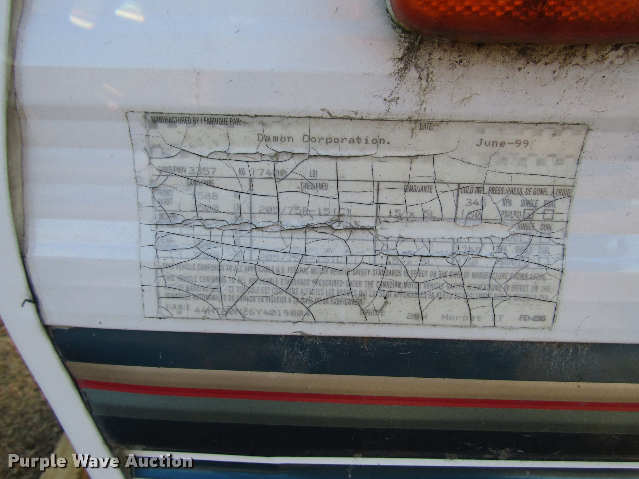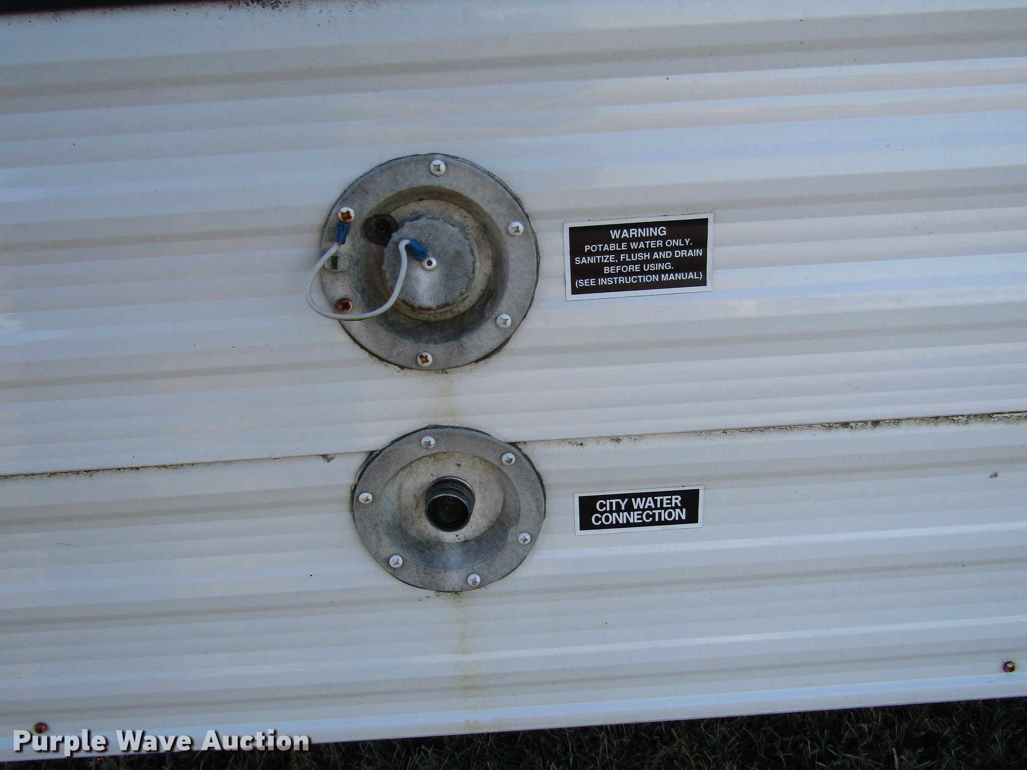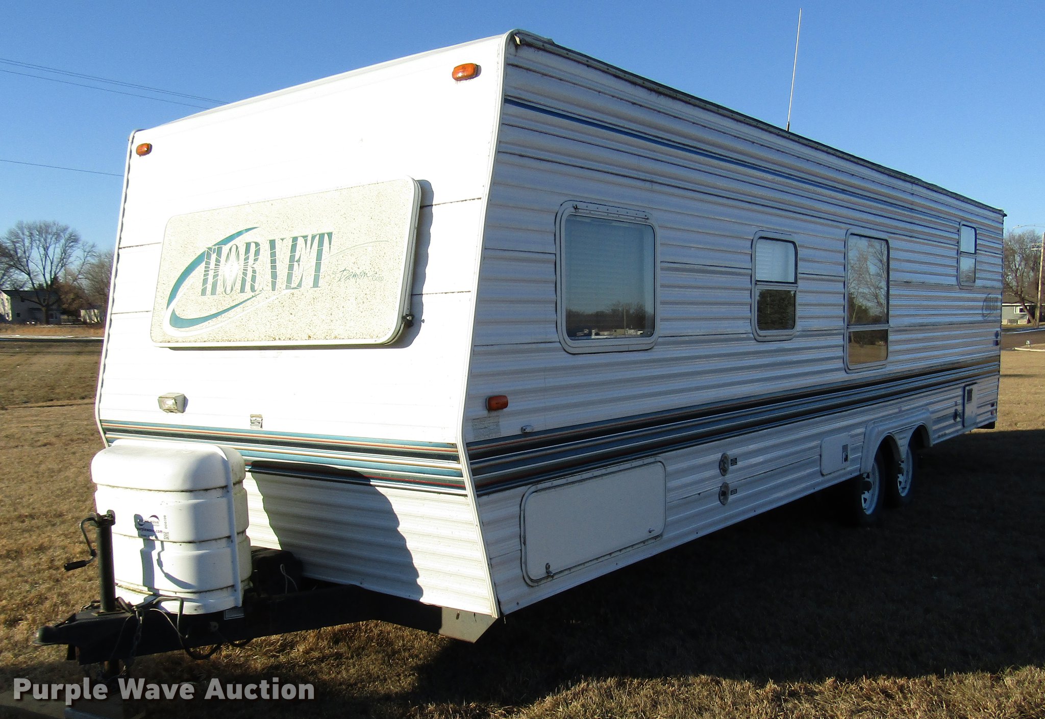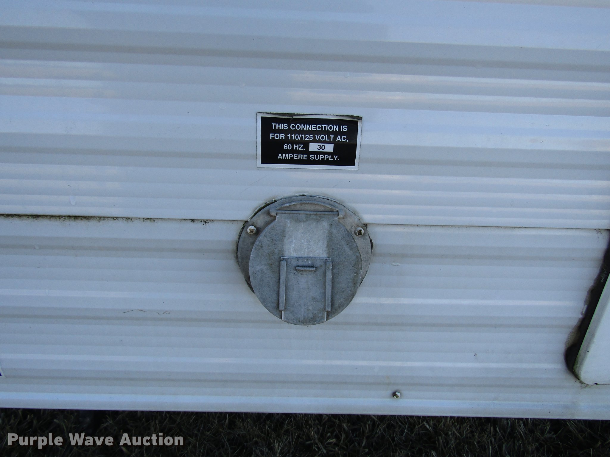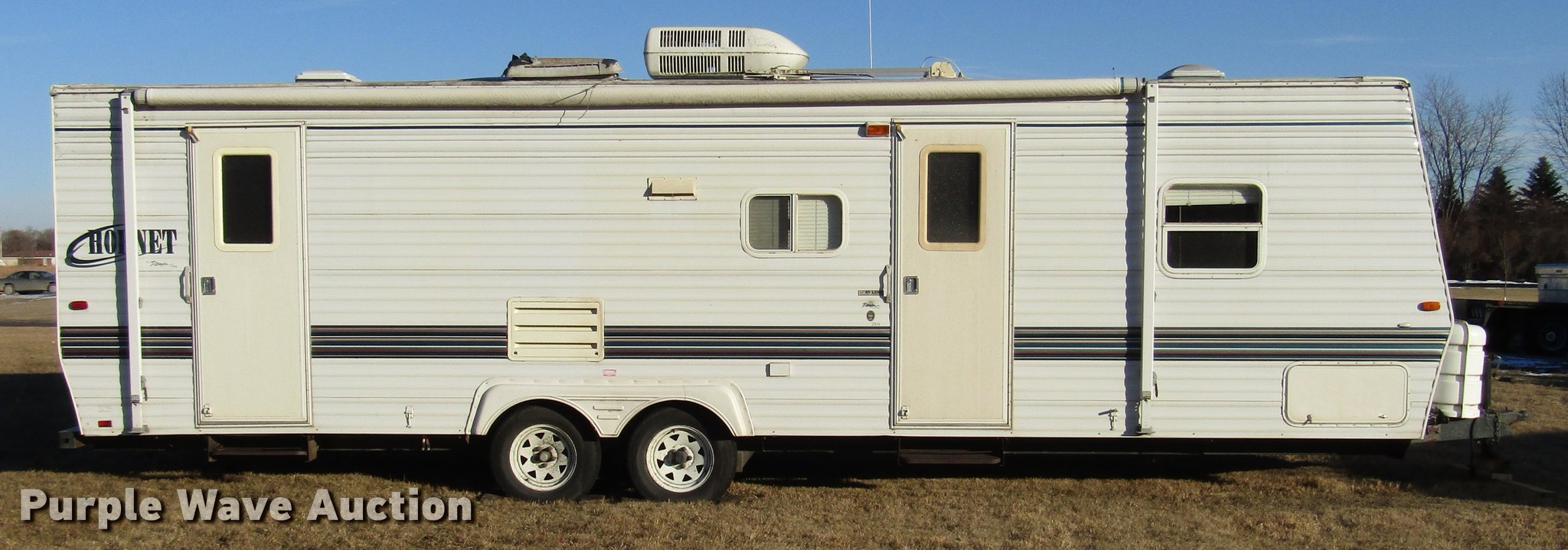Purple Wave is selling a used RV in Minnesota. This item is a 2000 Hornet camper with the following: 27'L, Awning, (2) entrance doors, Kitchen, Sink, Refrigerator/freezer, Microwave, Oven, Stove, Table, Pull-out couch, Bathroom, Bedroom, Queen bed, Central AC unit, Storage compartments, Ball hitch, Single leg landing gear, Spring suspension, Electric brakes, 205/75R15 tires, Unit# 04-114