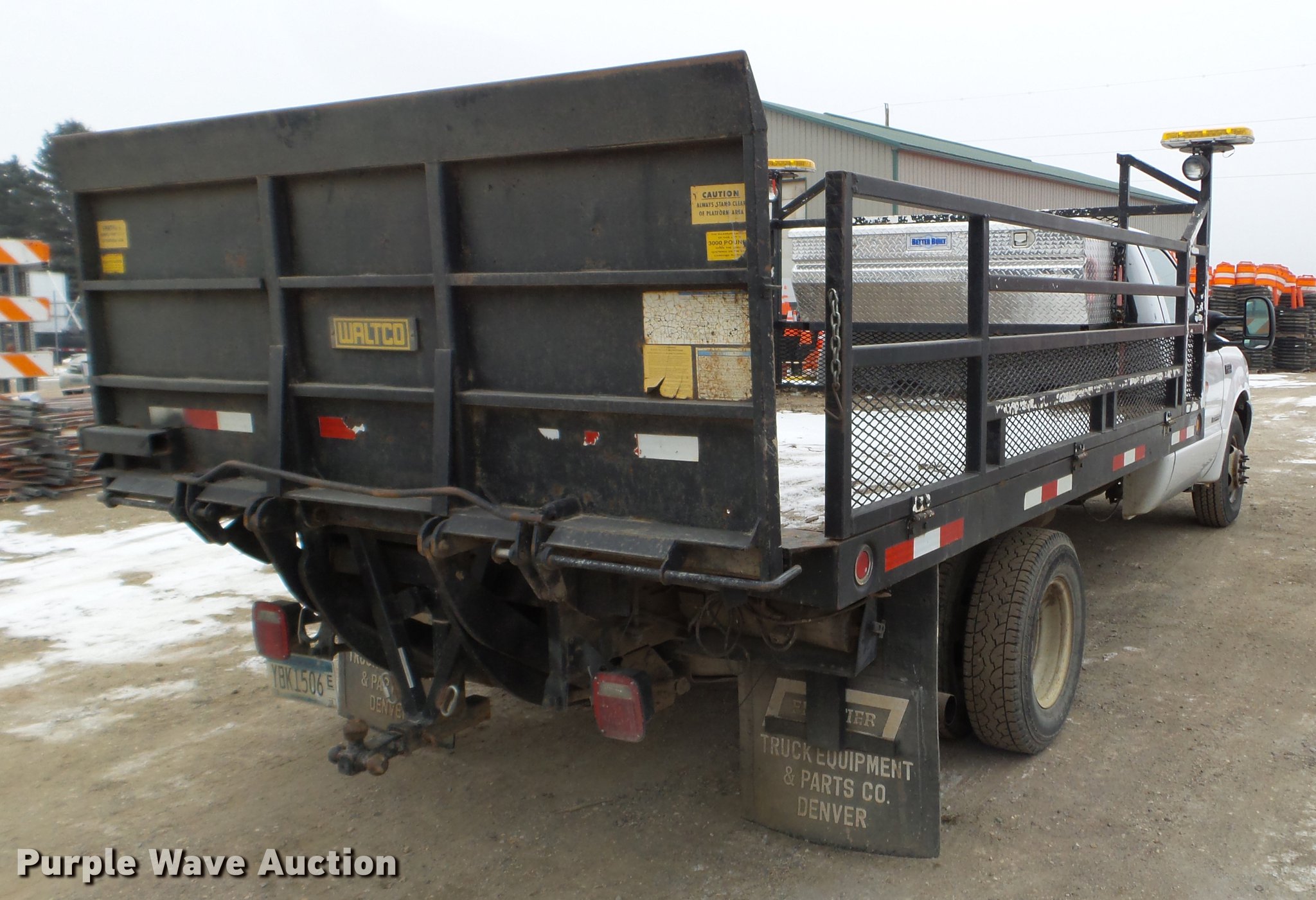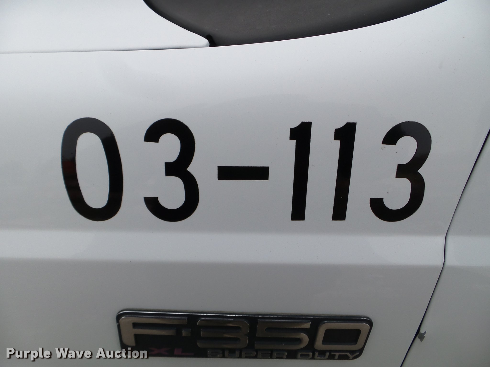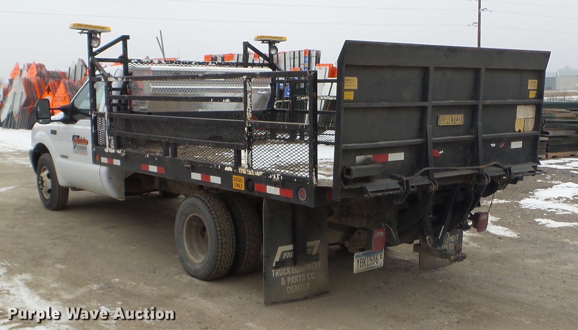 2004 Ford F350 Super Duty flatbed pickup truck. 109,200 miles on odometer, 6.0L V8 OHV 32V turbo diesel engine, Automatic transmission, AC and heat, Tilt, Cruise, Vinyl interior, Front tow hook, 12.5'L x 94"W flatbed 30" side height, Walco 90"W end gate lift, 215/85R16 tires, Unit# 03-113. Minnesota title. Title has a lien that will be released following the close of the auction. Title distribution may be delayed up to 30 days from verification of funds. 1FDWF36P44EC86714. Precision Roadway Services. 602 3rd Ave E. Osakis, MN 56360