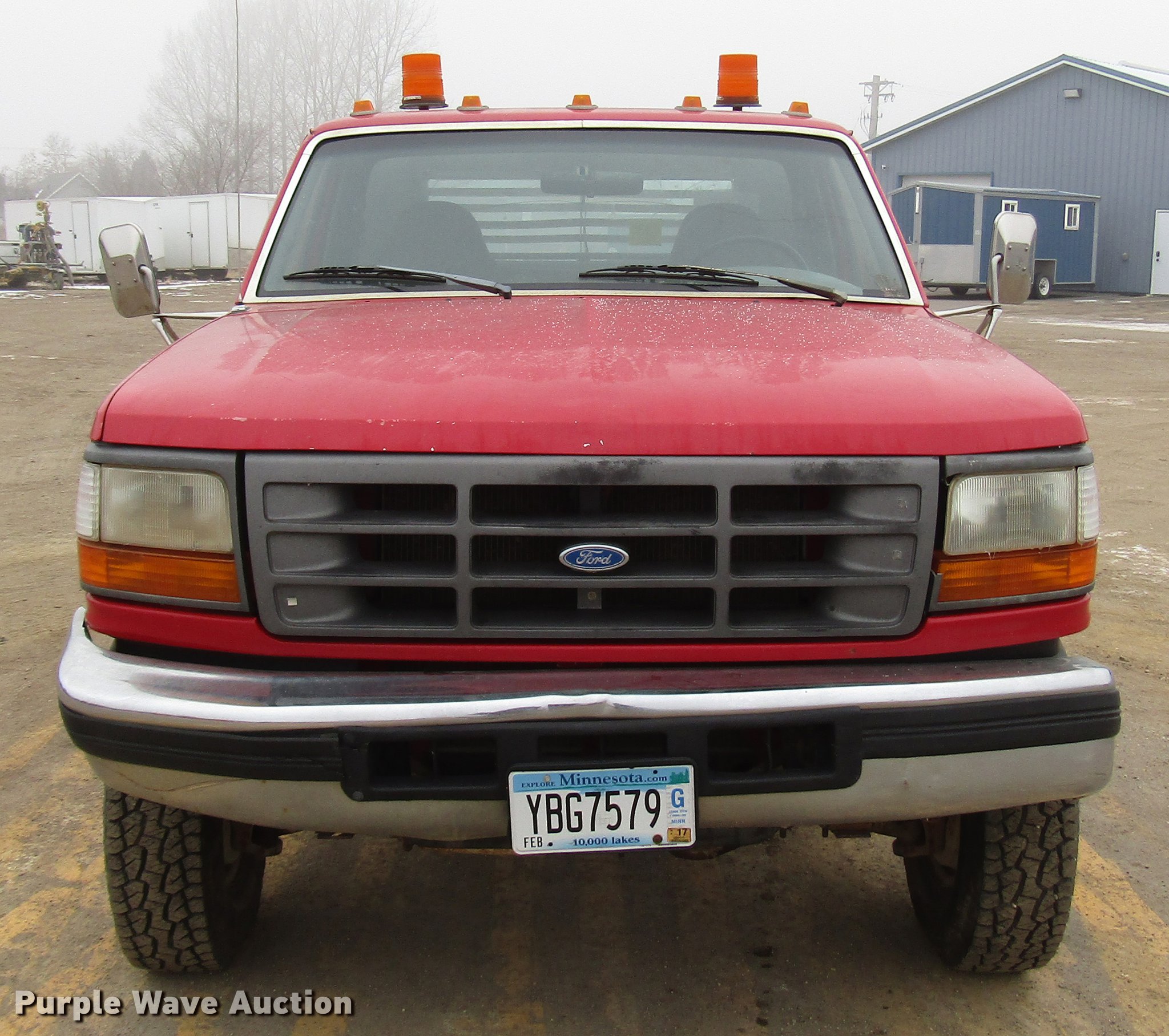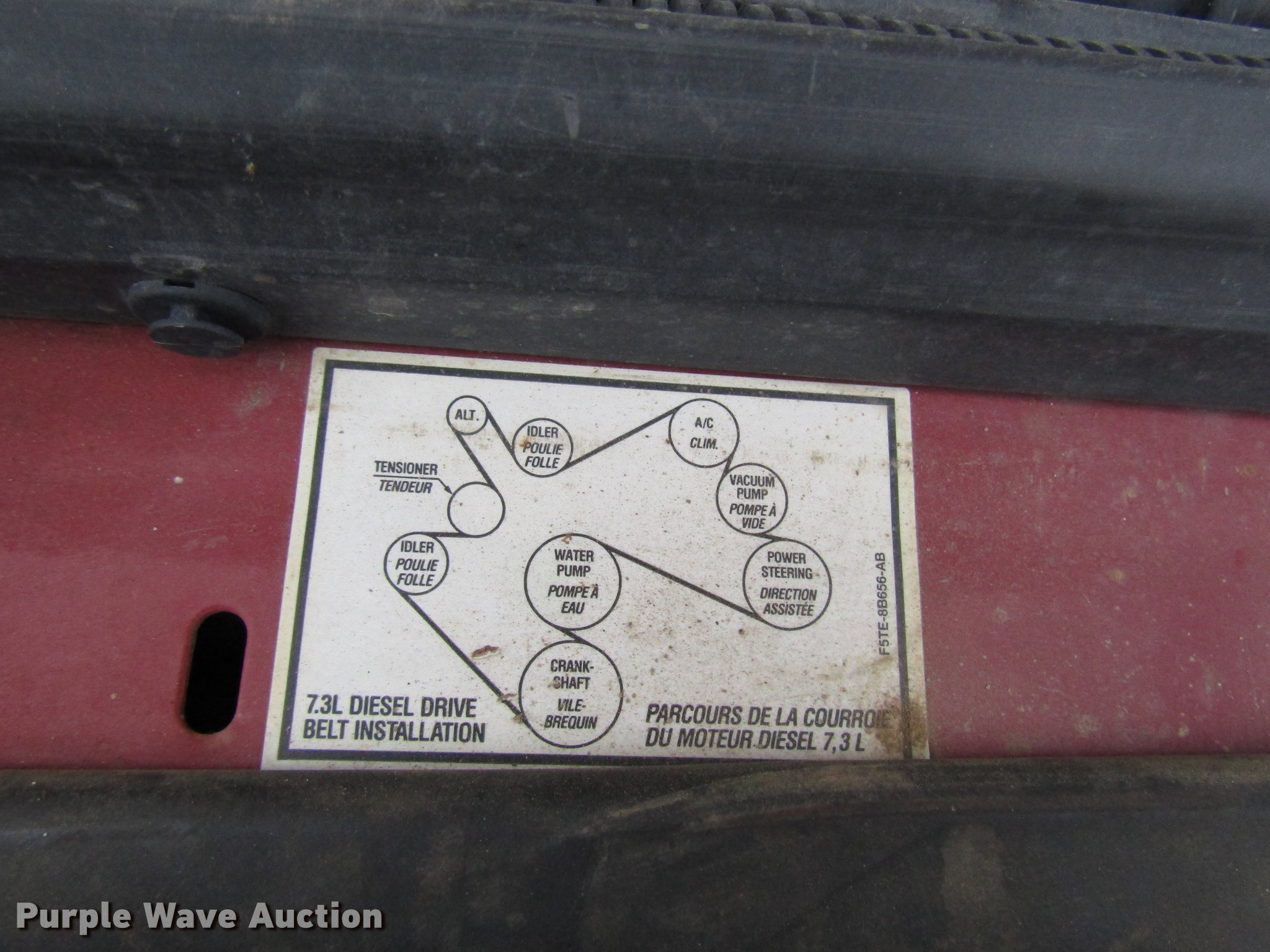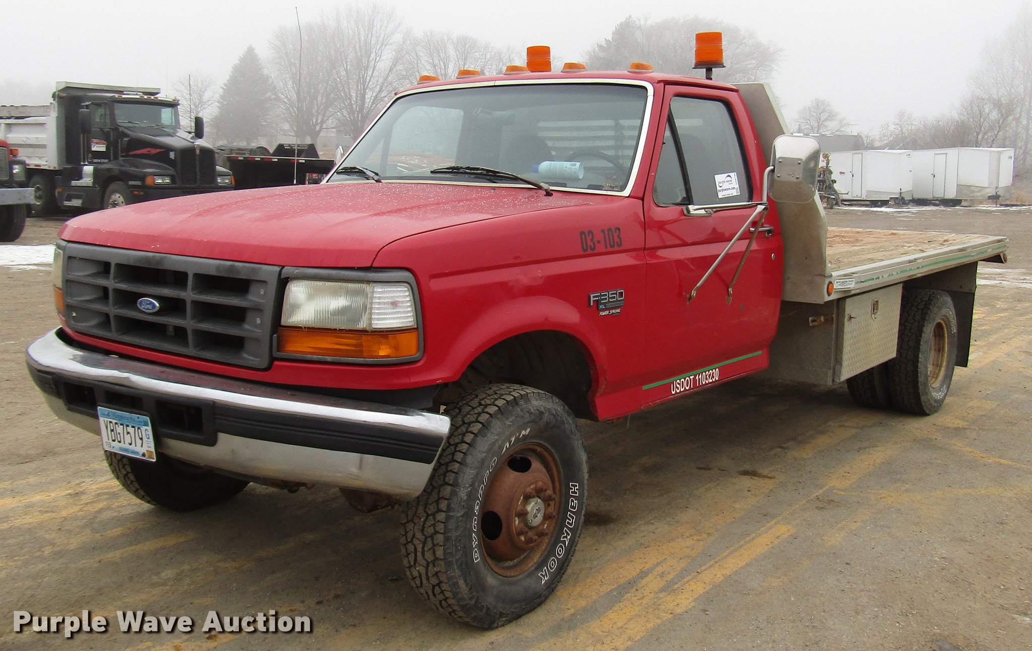 Purple Wave is selling a used 3/4 or 1 Ton Pickup or Van in Minnesota. This item is a 1997 Ford F350 flatbed pickup truck with the following: 276,680 miles on odometer, 7.3L V8 OHV 16V diesel engine, Five speed manual transmission, Four wheel drive, AC and heat, Tilt, Cruise, Cloth interior, Front tow hooks, 11'L x 94"W flatbed, Toolbox, Gooseneck ball, Receiver hitch, Trailer wiring, 235/85R16 tires, Cracked windshield, Unit# 03-103