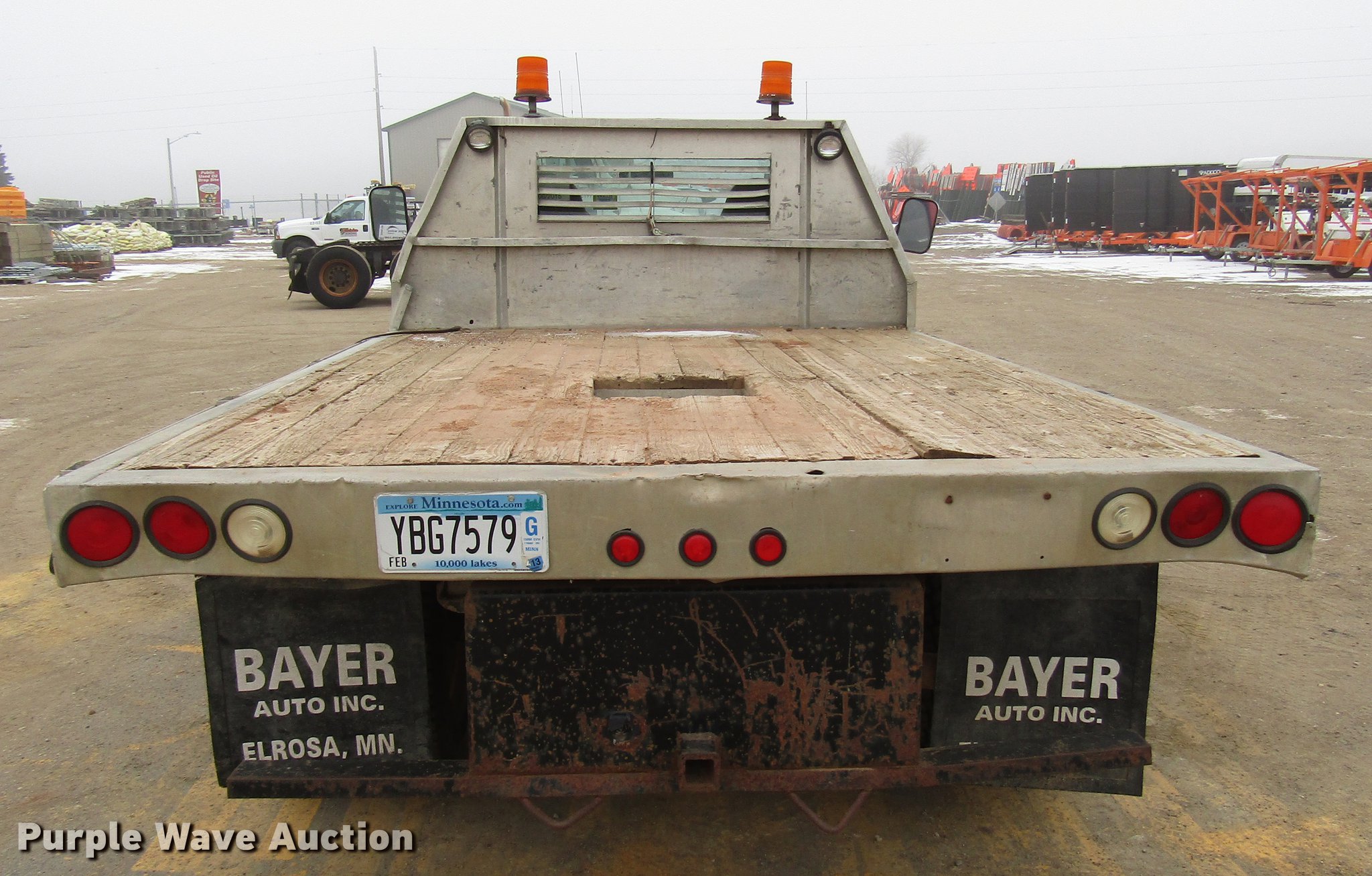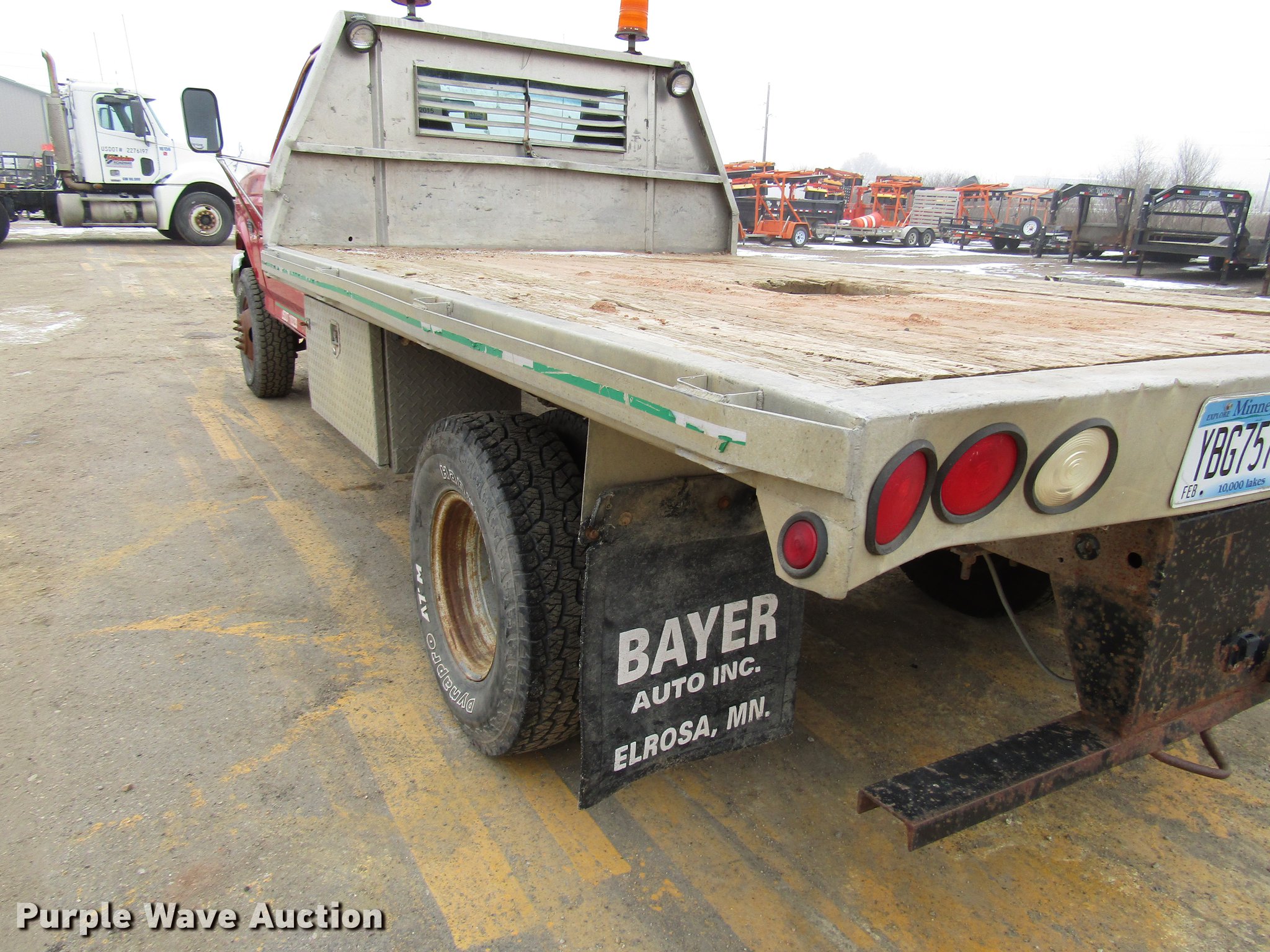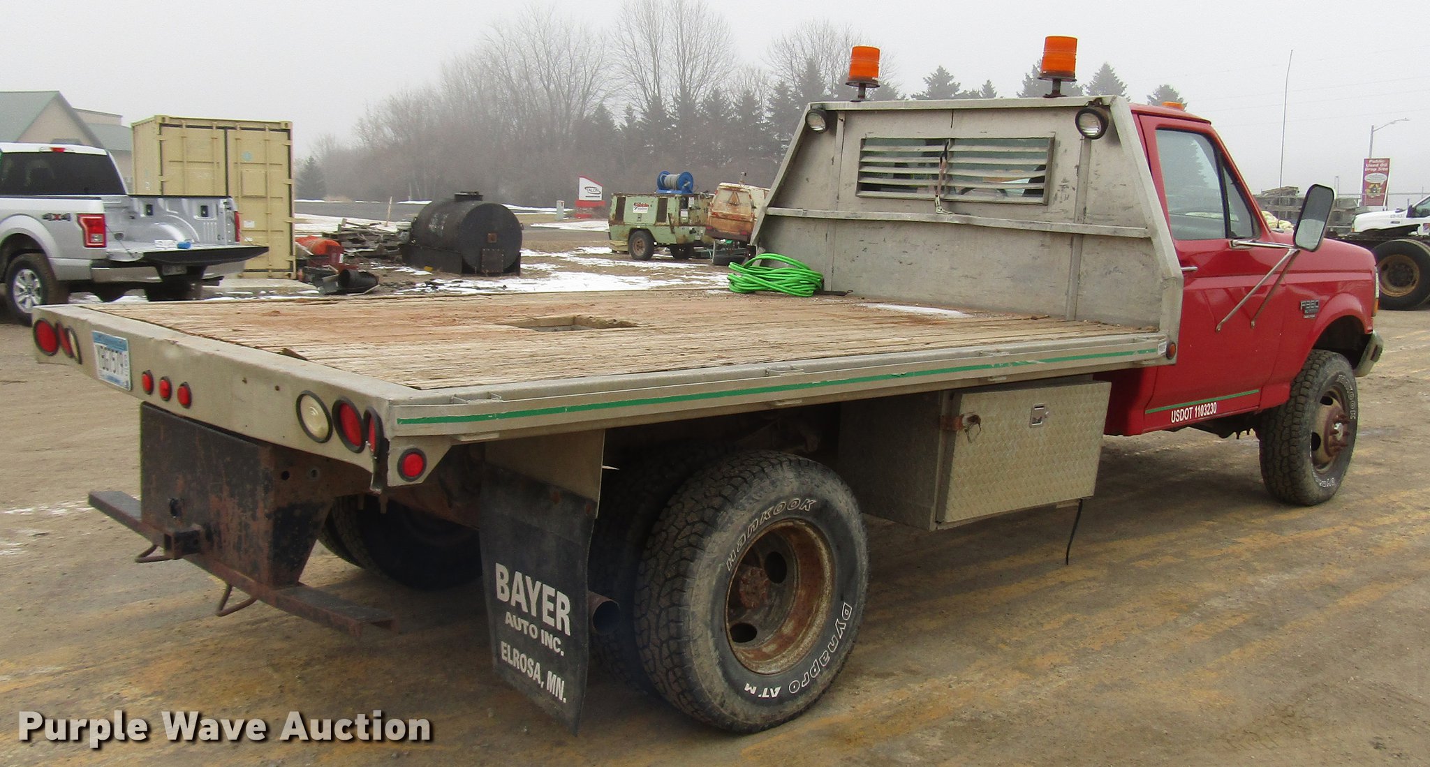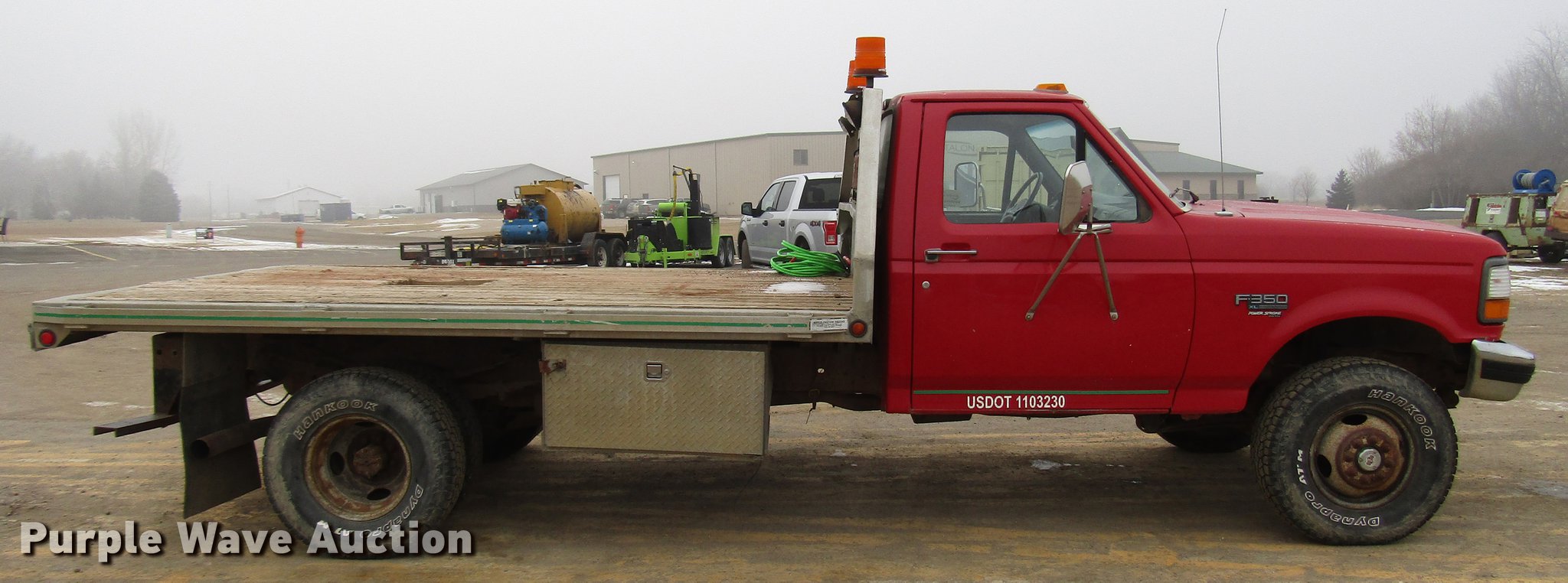1997 Ford F350 flatbed pickup truck. 276,680 miles on odometer, 7.3L V8 OHV 16V diesel engine, Five speed manual transmission, Four wheel drive, AC and heat, Tilt, Cruise, Cloth interior, Front tow hooks, 11'L x 94"W flatbed Toolbox, Gooseneck ball, Receiver hitch, Trailer wiring, 235/85R16 tires, Cracked windshield, Unit# 03-103. Minnesota title. 1FDKF38F5VED02567. Precision Roadway Services. 602 3rd Ave E. Osakis, MN 56360