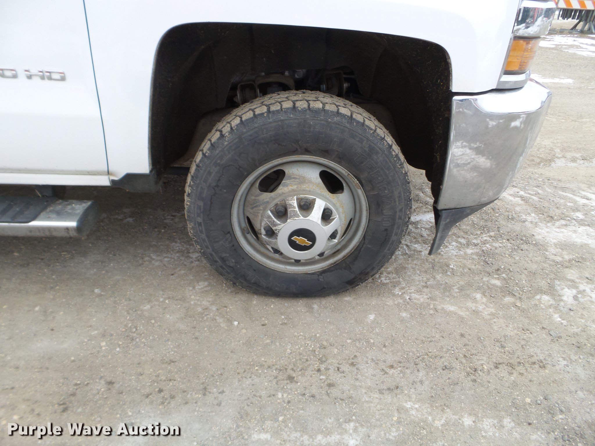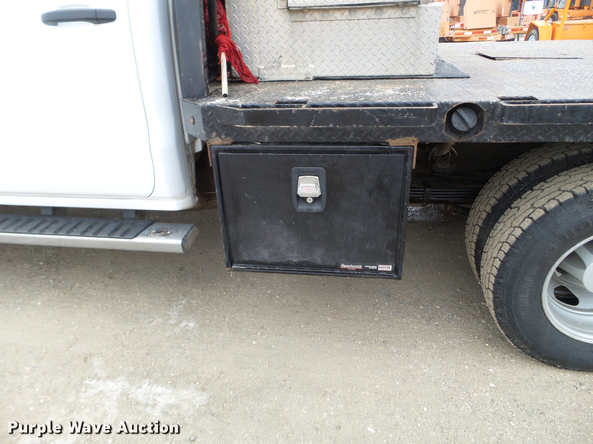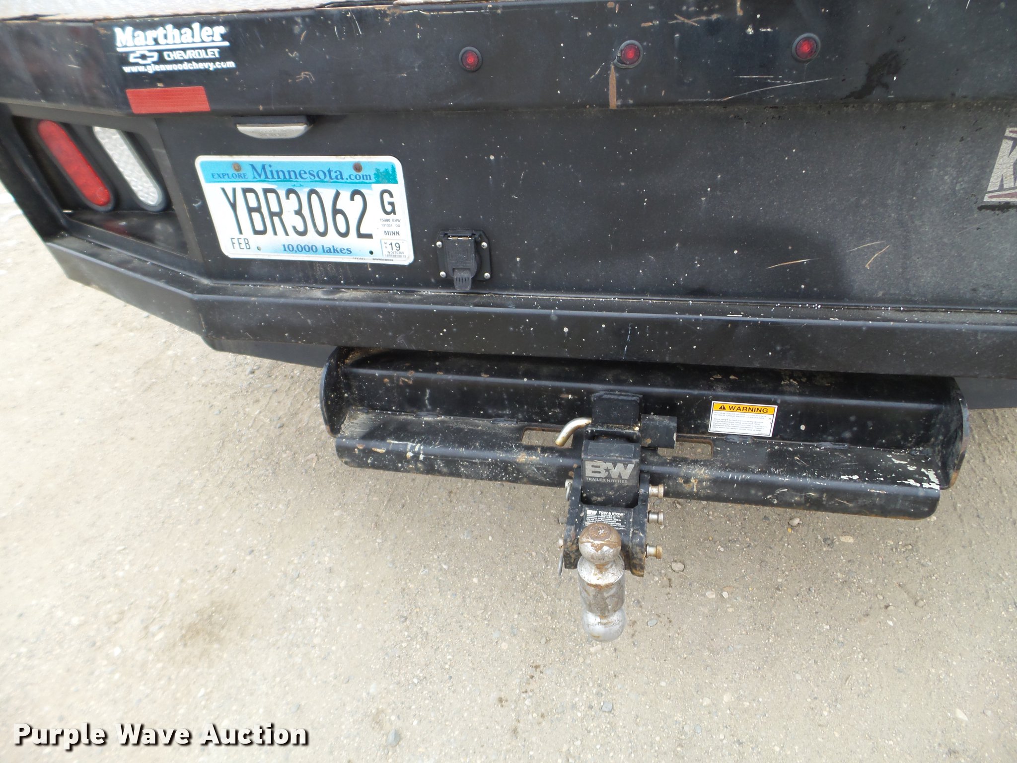 Purple Wave is selling a used 3/4 or 1 Ton Pickup or Van in Minnesota. This item is a 2015 Chevrolet Silverado 3500HD Crew Cab flatbed pickup truck with the following: 82,741 miles on odometer, 6.0L V8 OHV 16V FFV gas engine, Automatic transmission, Four wheel drive, AC and heat, Tilt, Cruise, AM/FM/CD, Power windows, locks, and mirrors, Cloth interior, Running boards, Front tow hook, Knapheide flatbed, 9.5'L x 96"W, Toolbox, Auxiliary two compartment fuel tank, Pump, Hose,, Gooseneck hitch, Receiver hitch, Trailer wiring, 235/80R17 tires, Unit# 03-126