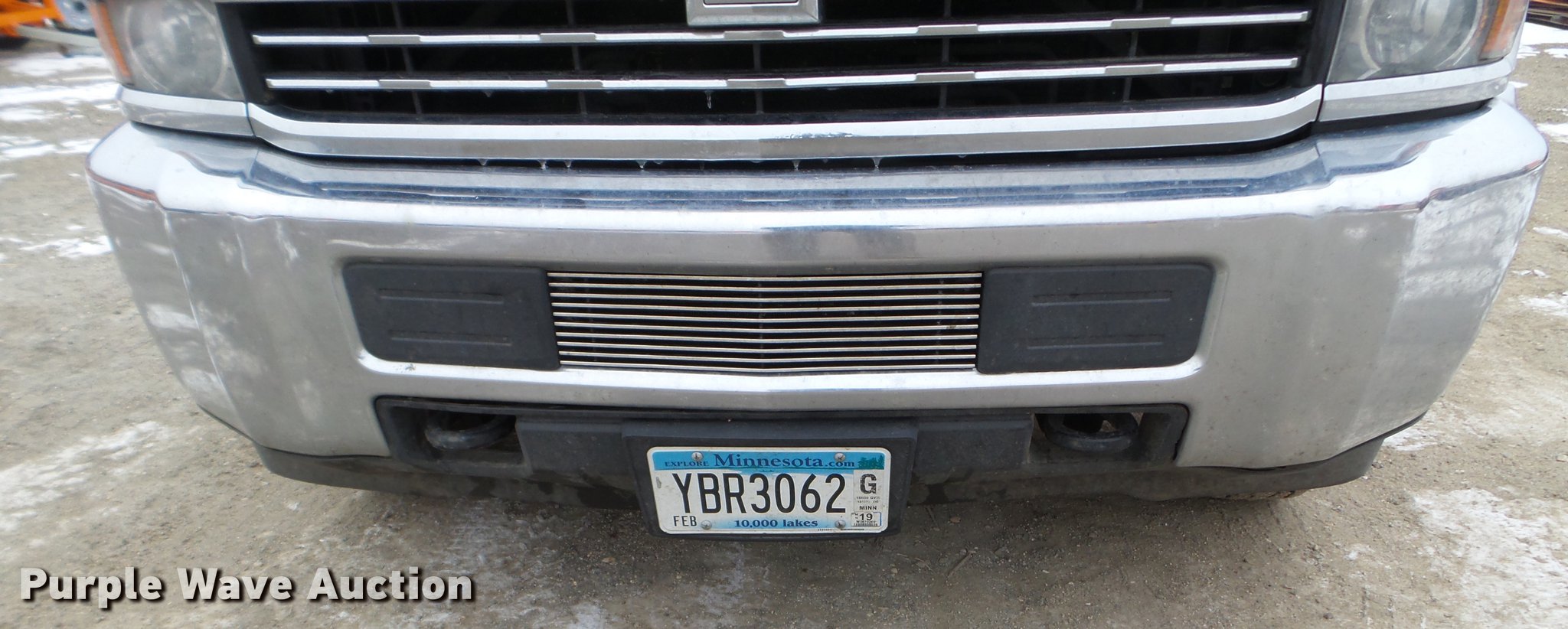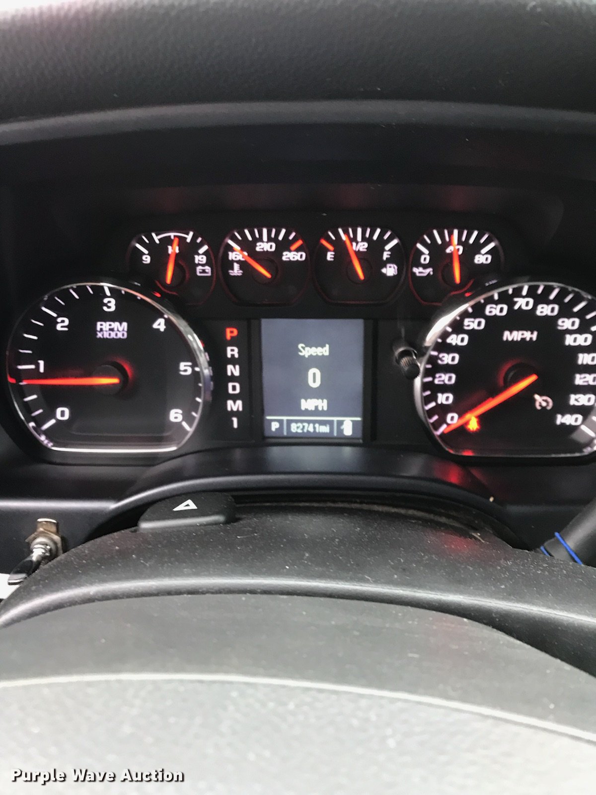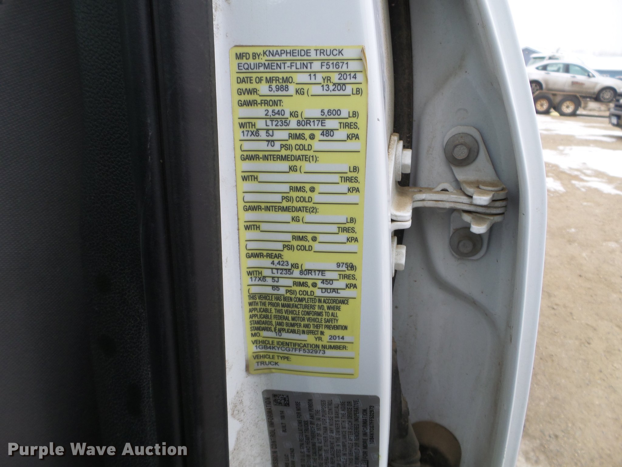 Purple Wave is selling a used 3/4 or 1 Ton Pickup or Van in Minnesota. This item is a 2015 Chevrolet Silverado 3500HD Crew Cab flatbed pickup truck with the following: 82,741 miles on odometer, 6.0L V8 OHV 16V FFV gas engine, Automatic transmission, Four wheel drive, AC and heat, Tilt, Cruise, AM/FM/CD, Power windows, locks, and mirrors, Cloth interior, Running boards, Front tow hook, Knapheide flatbed, 9.5'L x 96"W, Toolbox, Auxiliary two compartment fuel tank, Pump, Hose,, Gooseneck hitch, Receiver hitch, Trailer wiring, 235/80R17 tires, Unit# 03-126