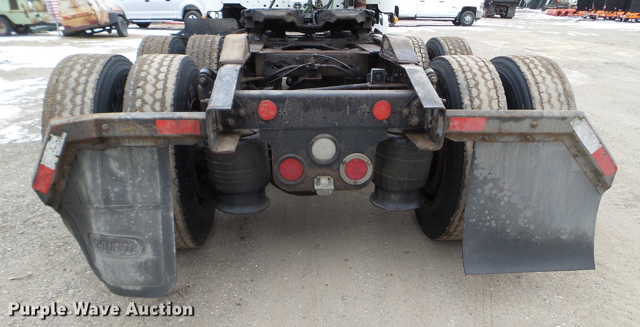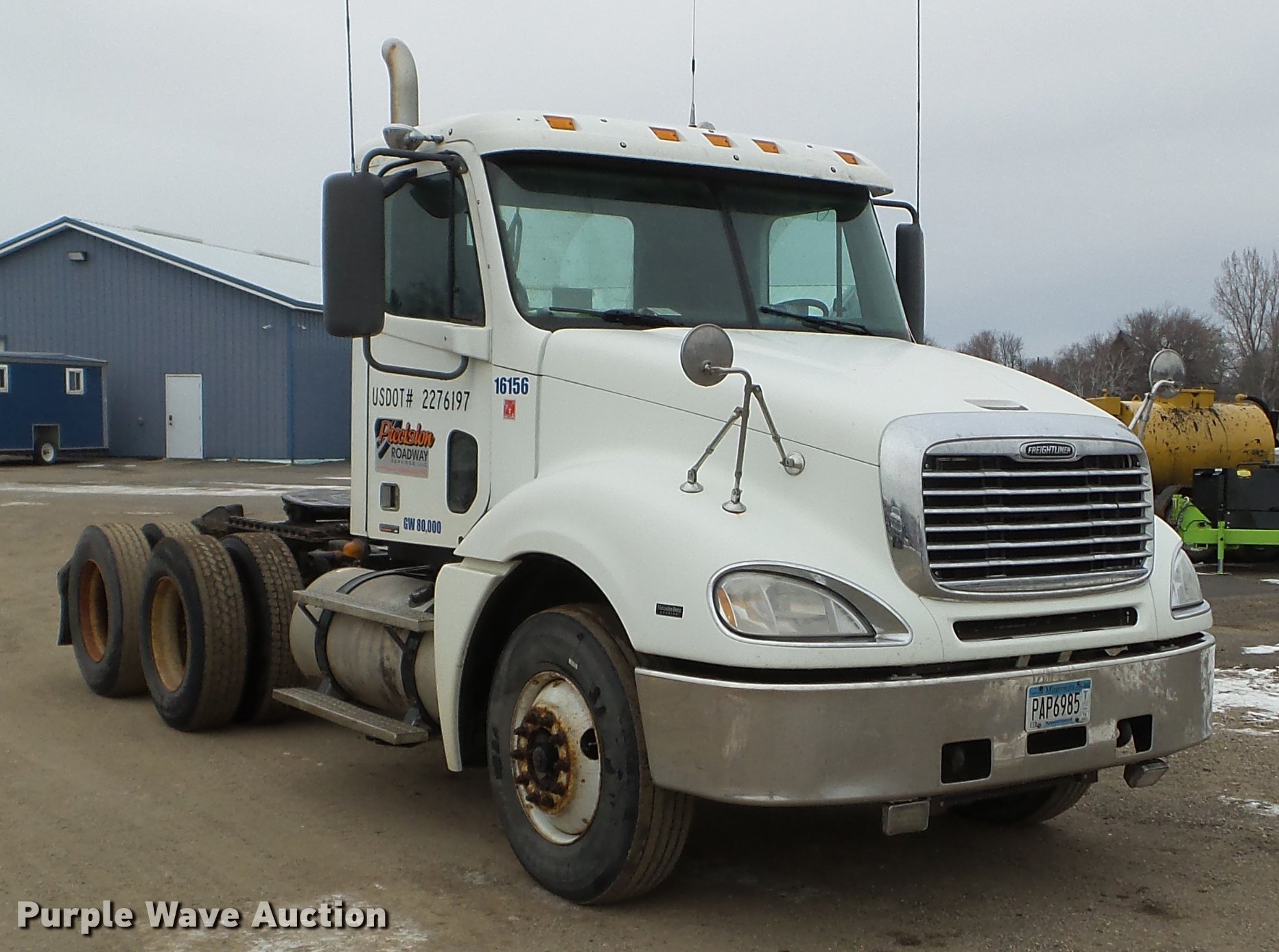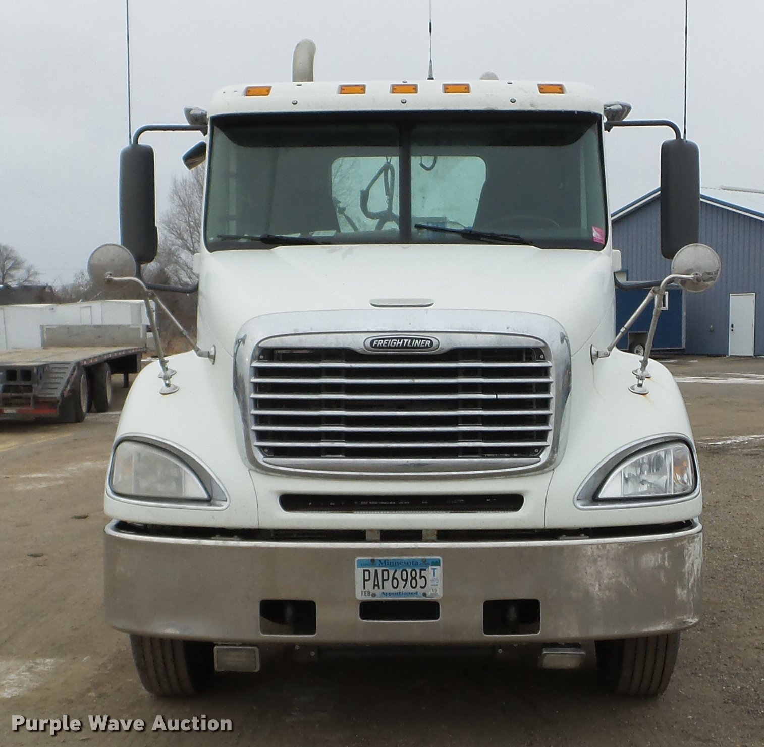 Purple Wave is selling a used Truck Tractor in Minnesota. This item is a 2007 Freightliner Columbia semi truck with the following: 463,414 miles on odometer, 10,506 hours on meter, Mercedes Benz MBE 4000 12.8L L6 turbo diesel engine, 10 speed manual transmission, Tandem axle, Inter-axle differential lock, AC and heat, Tilt, Cruise, AM/FM/CD, Power windows, Power and heated mirrors, Air suspension seat, Air ride cab, Block heater, Front tow hooks, Exterior visor, Dump valves, Single rear exhaust stack, Aluminum deck plate, Air operated sliding fifth wheel plate, Dual fuel tanks, Air suspension, Air brakes, 11R22.5 front tires, 295/75R22.5 rear tires, Unit# 03-112