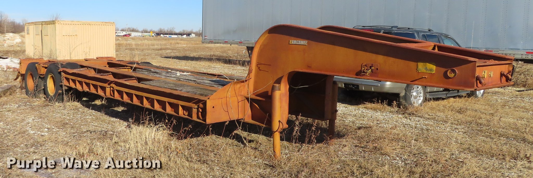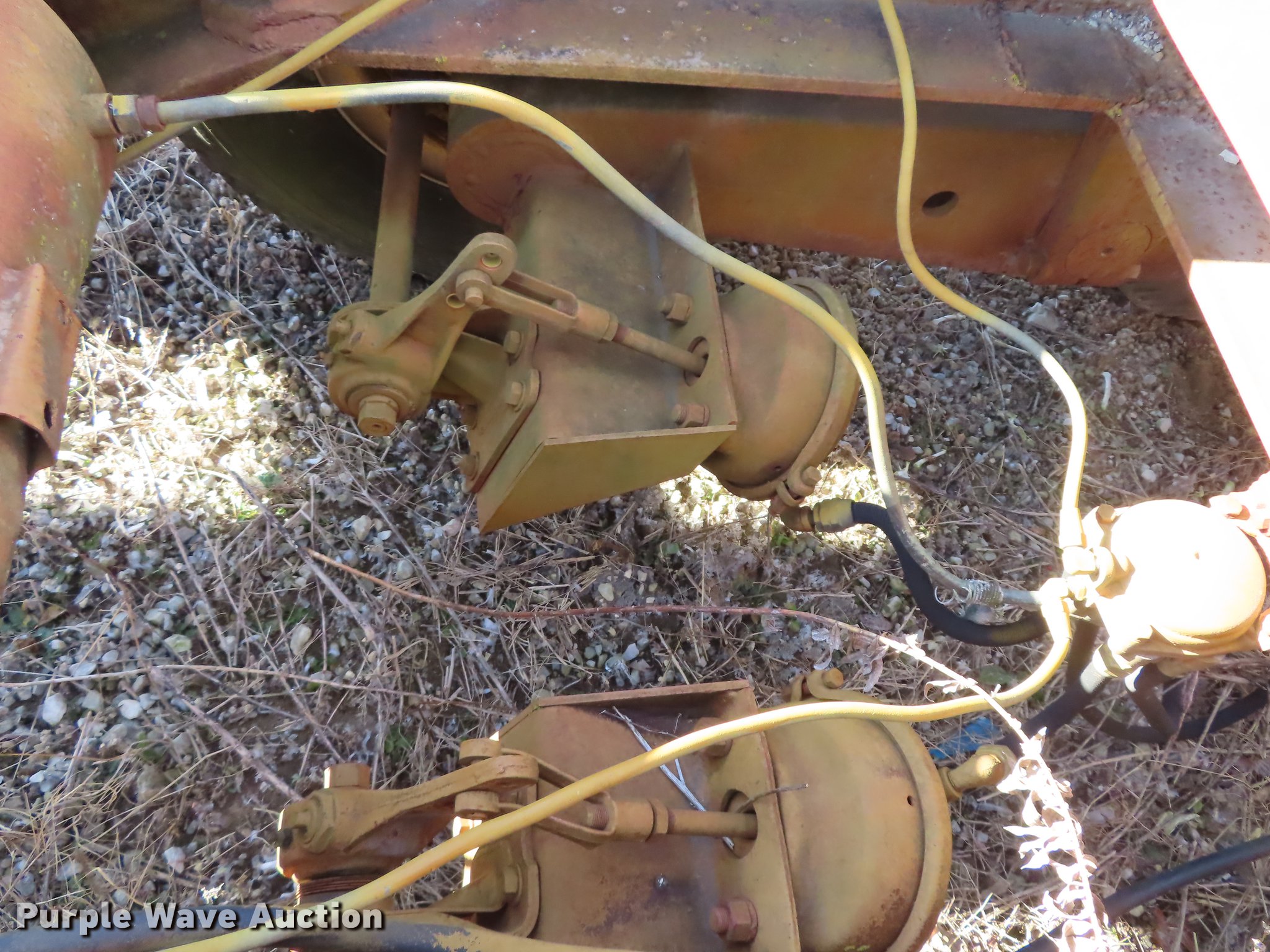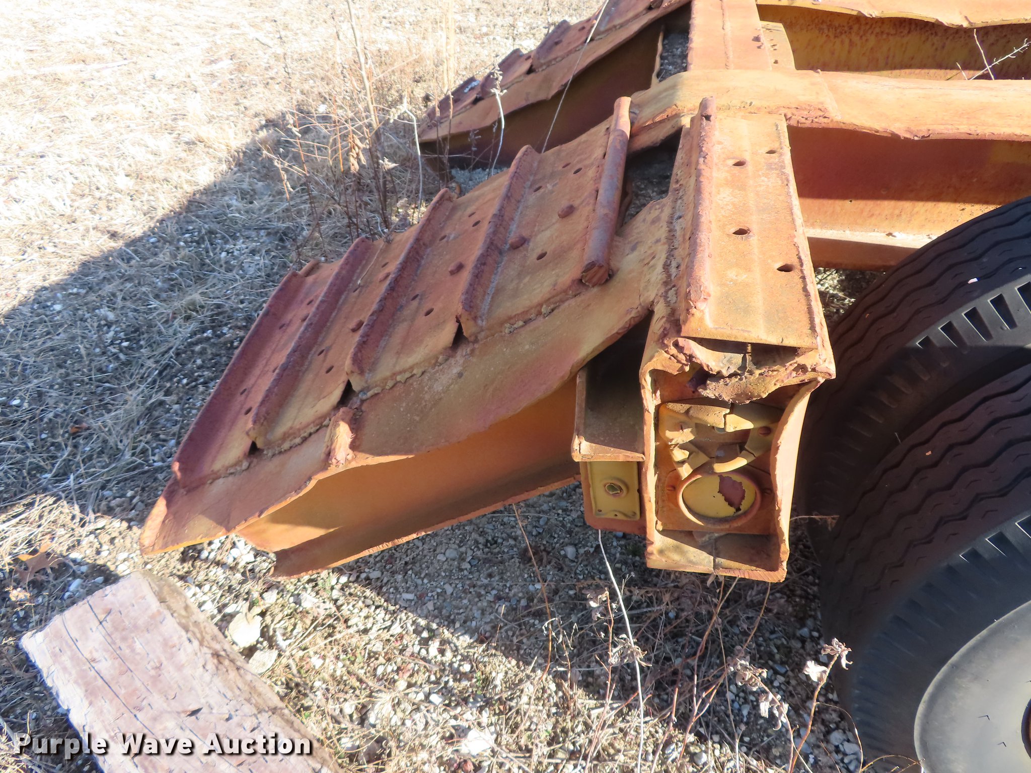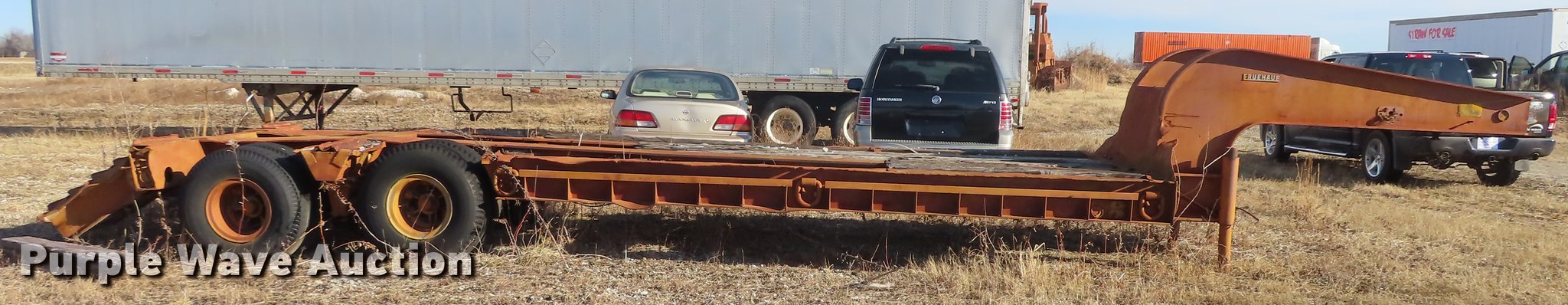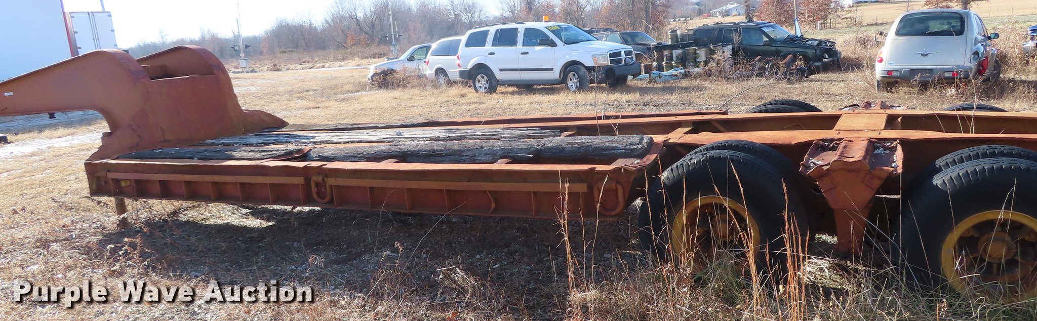 Purple Wave is selling a used Equip. Trailer in Missouri. This item is a 1955 Fruehauf equipment trailer with the following: 28'L x 96"W overall, 25'L wood deck, 3'L dove tail, D-ring tie downs, Dual leg landing gear, Fifth wheel plate, Tandem axle, Spring suspension, Air brakes, Steel wheels, 10.00-15 tires