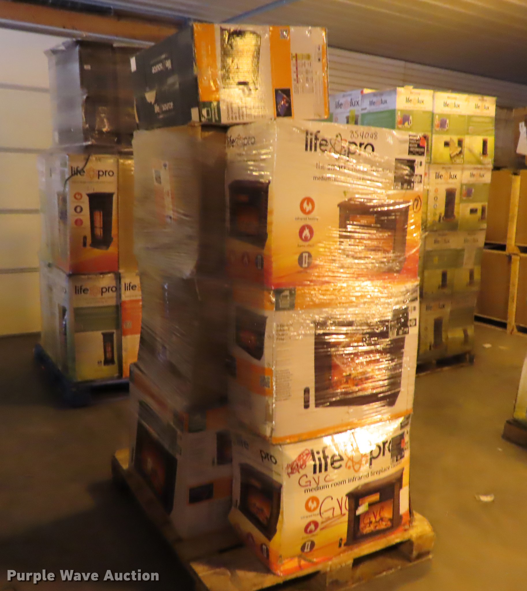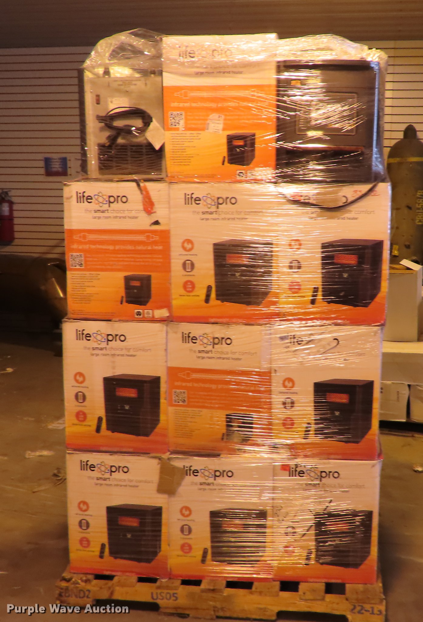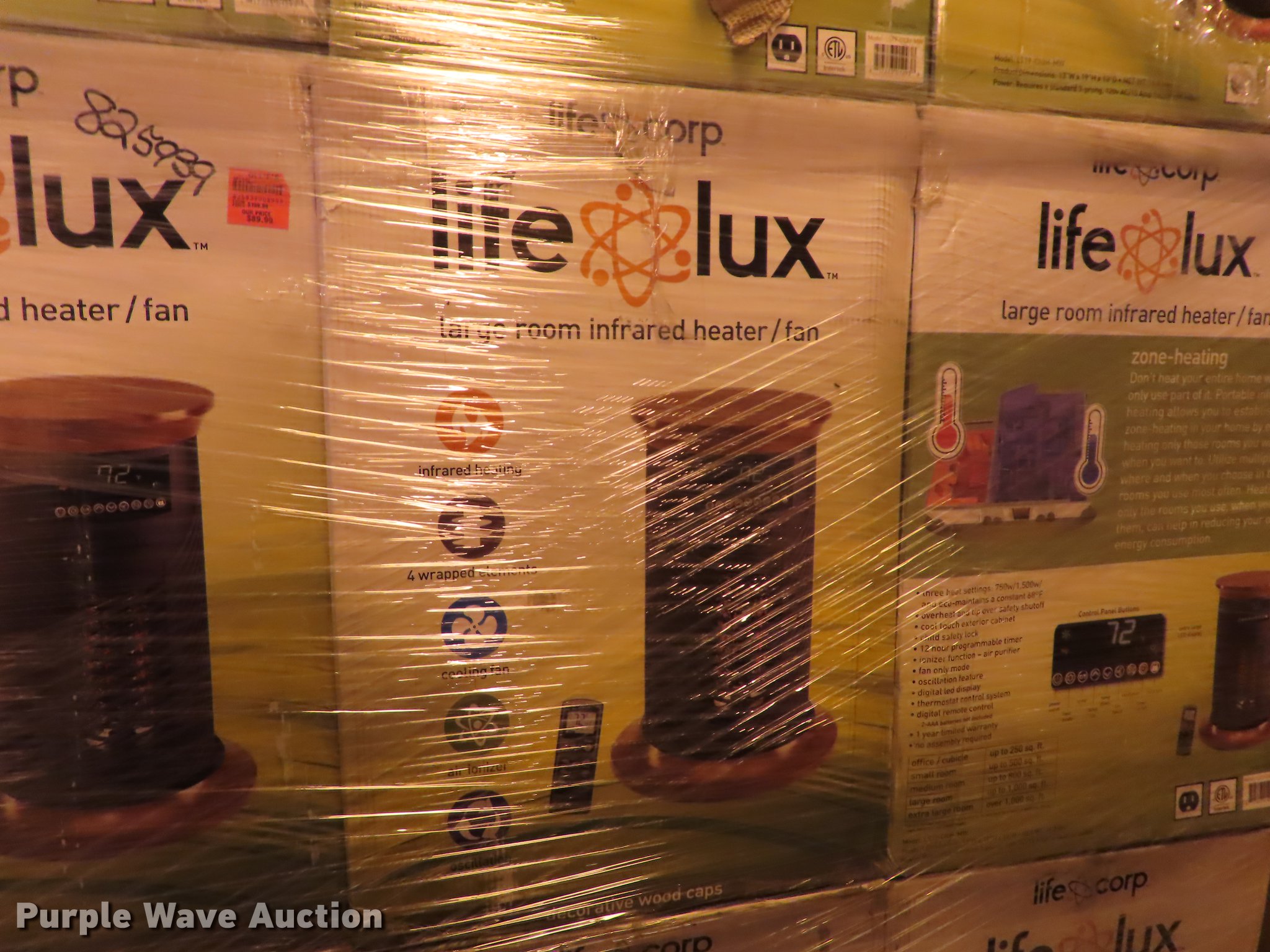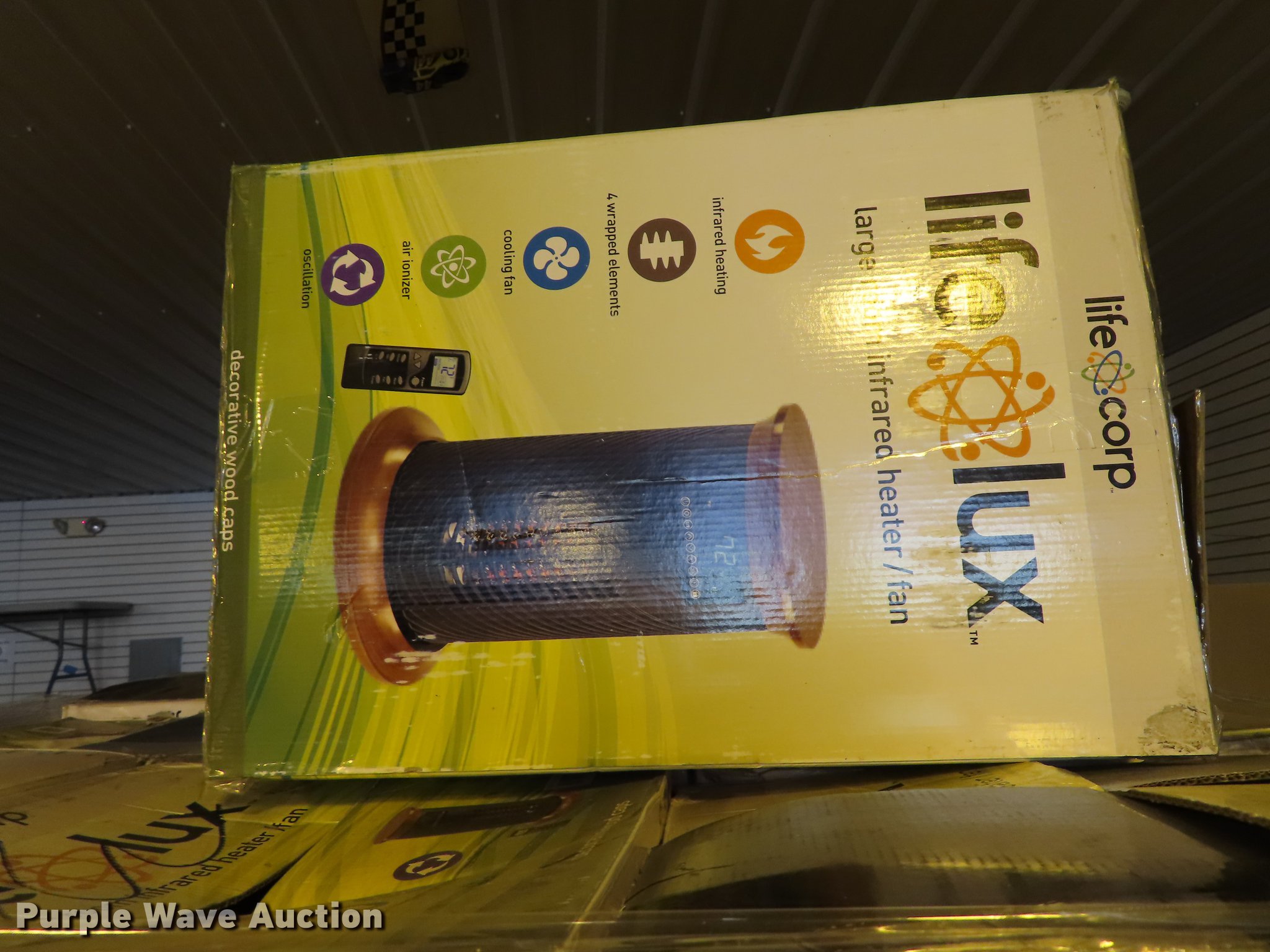 Approximately 169 electric heaters. Appox. 65 Life Lux large room infrared heater/fan, Approx. 46 Life Pro 4-in-1 infrared all season heater/fan 1,500W, Approx. 33 Life Pro large room infrared/quartz heater 1,500W, Approx. 13 Life Pro infrared fireplace 1,500W, Approx. 12 Warm Living infrared fireplace 1,500W, Unknown operating condition of all items. Surplus USA. 27227 Ivy Rd. Carl Junction, MO 64834