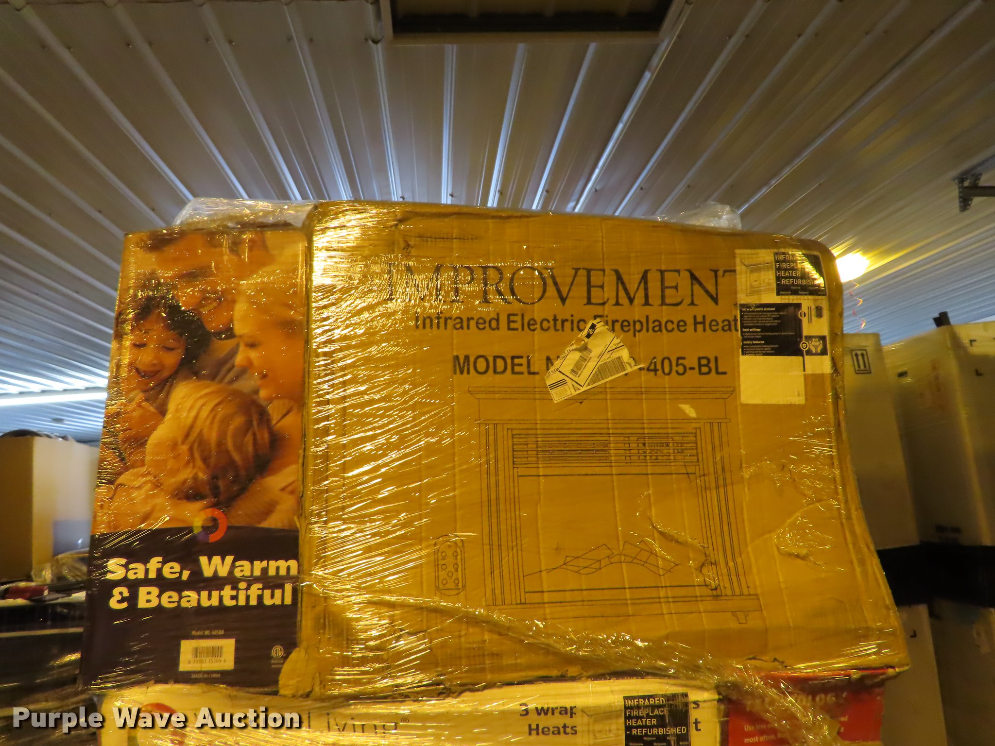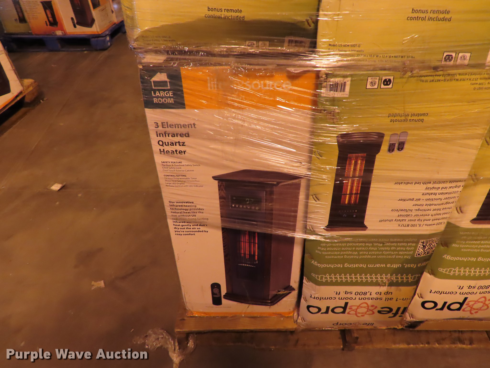 Purple Wave is selling a used Furniture in Missouri. This item is a Approximately 169 electric heaters with the following: Appox. 65 Life Lux large room infrared heater/fan, Approx. 46 Life Pro 4-in-1 infrared all season heater/fan, 1,500W, Approx. 33 Life Pro large room infrared/quartz heater, 1,500W, Approx. 13 Life Pro infrared fireplace, 1,500W, Approx. 12 Warm Living infrared fireplace, 1,500W, Unknown operating condition of all items