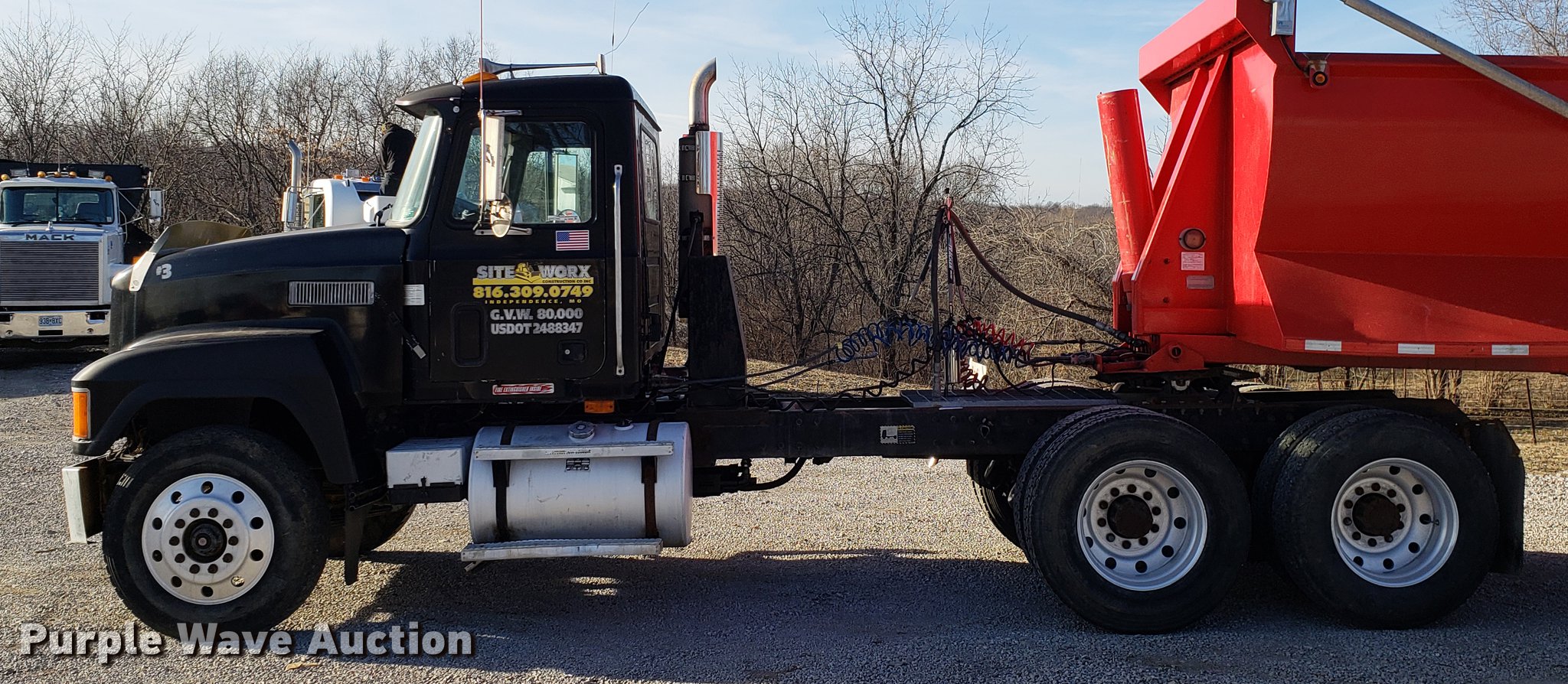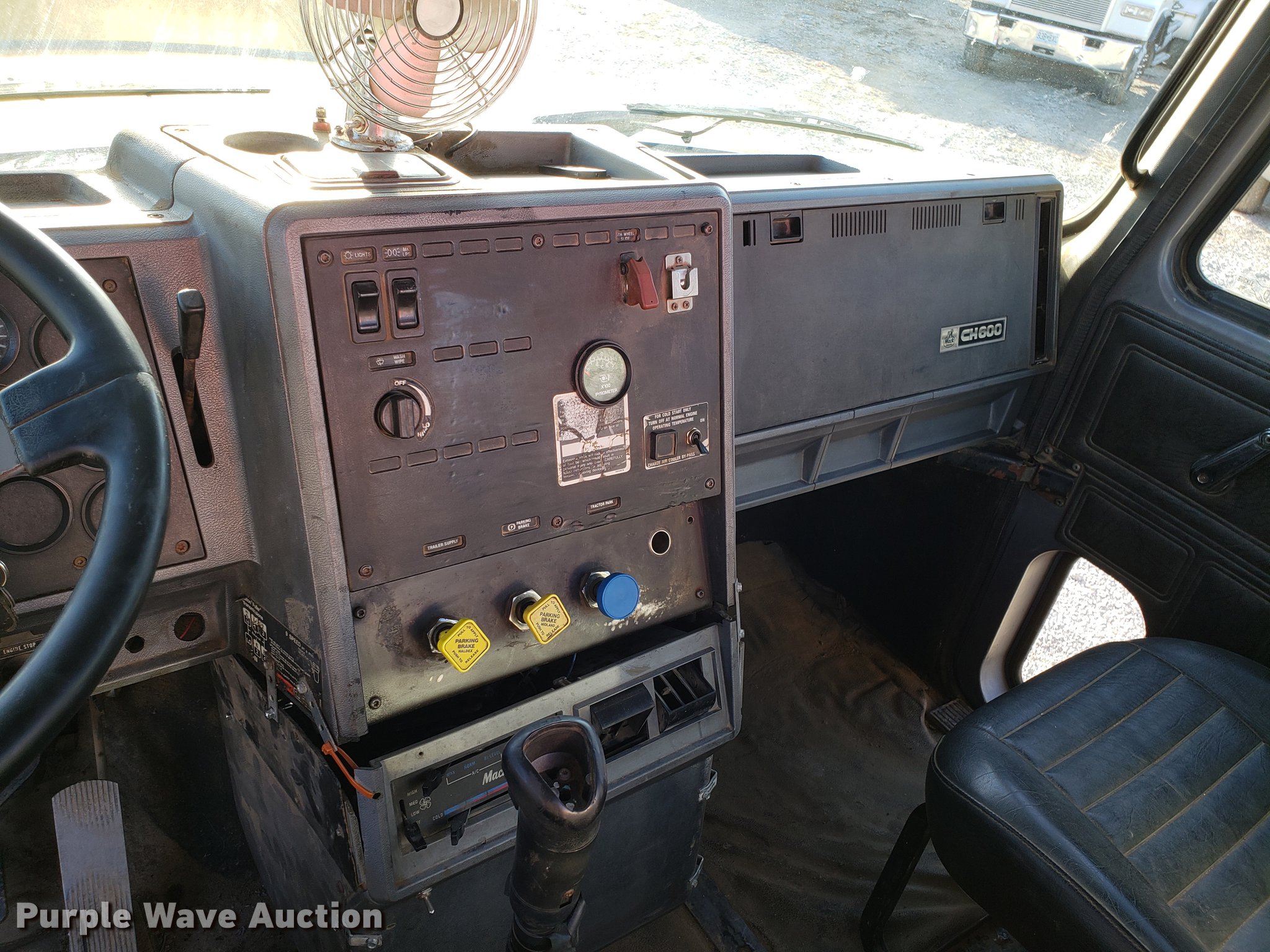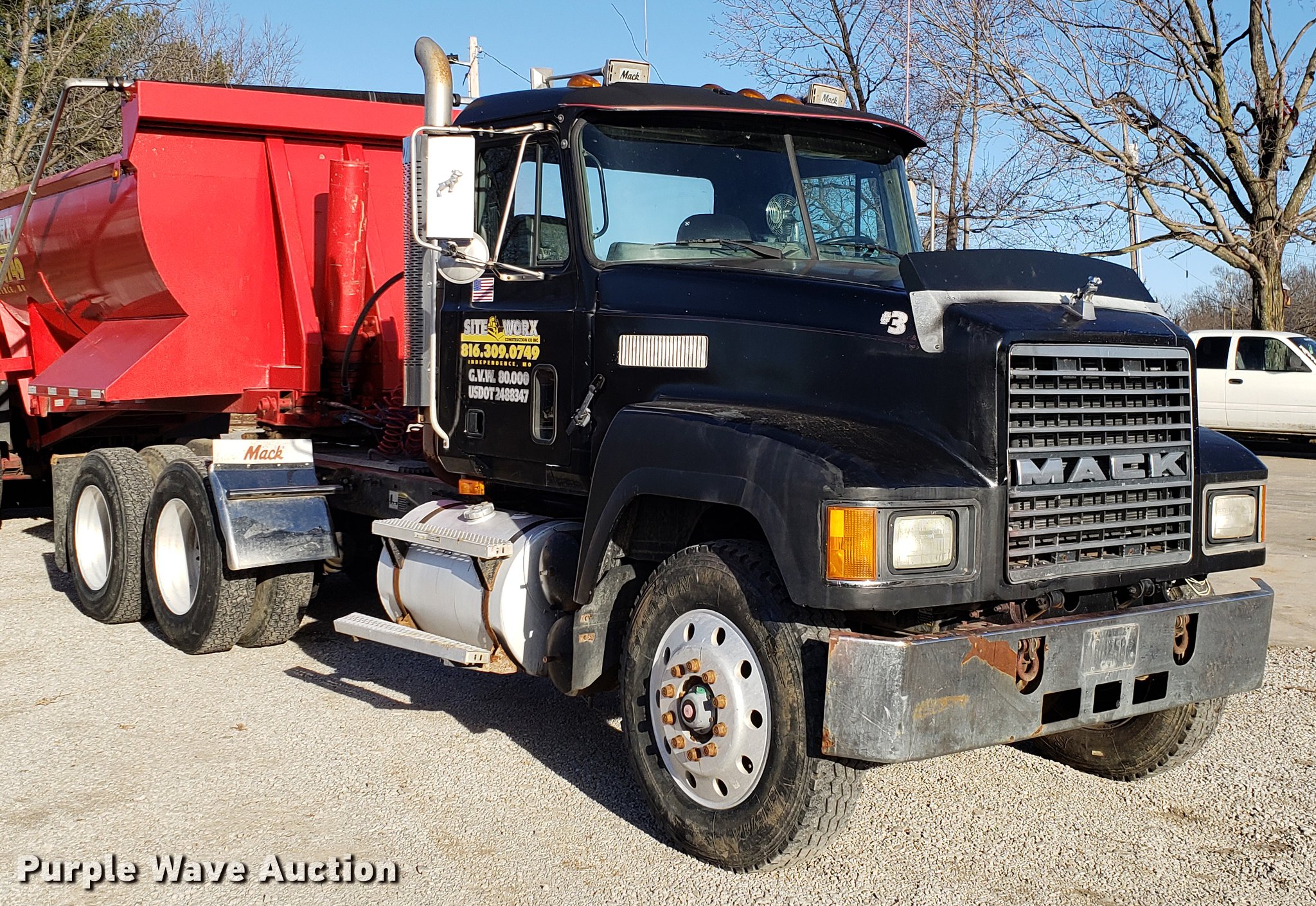 1995 Mack CH613 semi truck. 935,968 miles on odometer, 35,697 hours on meter, Mack 12.0L L6 turbo diesel engine, Eaton Fuller nine speed manual transmission, AC and heat, Air suspension seat, Wet kit, Single rear exhaust stack, Aluminum deck plate, Fixed fifth wheel plate, Dual fuel tanks, Quarter fenders, Camelback suspension, Air brakes, 11R24.5 tires. Missouri title. 1M2AA13Y4SW058116. Site Worx Construction. 19501 E Lippert Ln. Independence, MO 64056