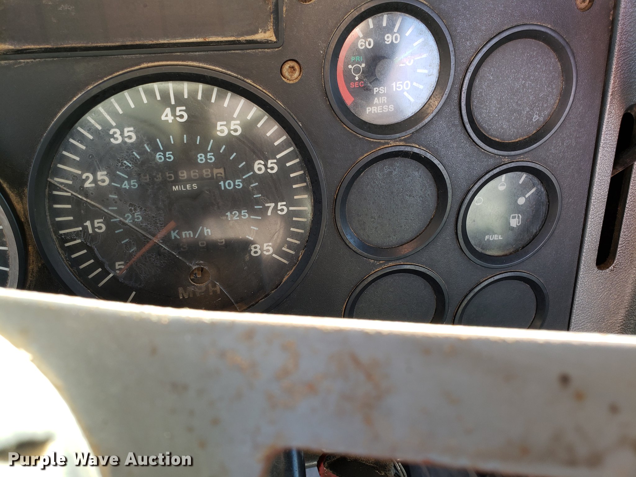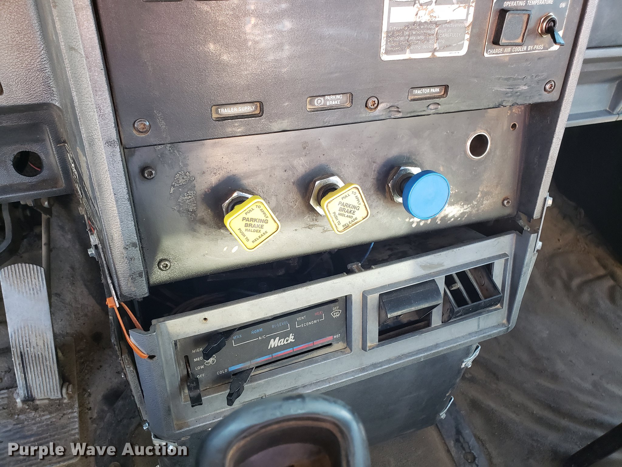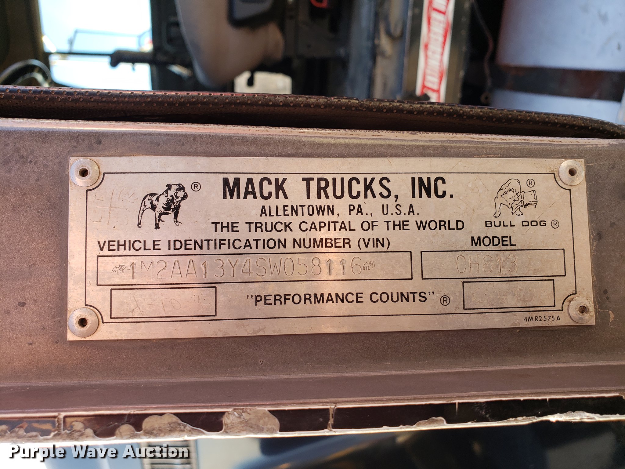 Purple Wave is selling a used Truck Tractor in Missouri. This item is a 1995 Mack CH613 semi truck with the following: 935,968 miles on odometer, 35,697 hours on meter, Mack 12.0L L6 turbo diesel engine, Eaton Fuller nine speed manual transmission, AC and heat, Air suspension seat, Wet kit, Single rear exhaust stack, Aluminum deck plate, Fixed fifth wheel plate, Dual fuel tanks, Quarter fenders, Camelback suspension, Air brakes, 11R24.5 tires