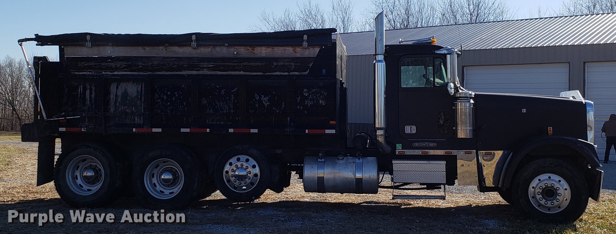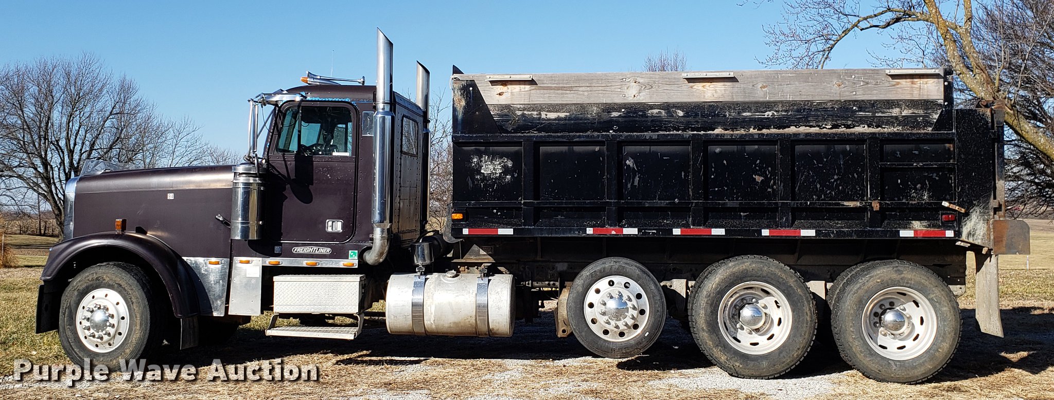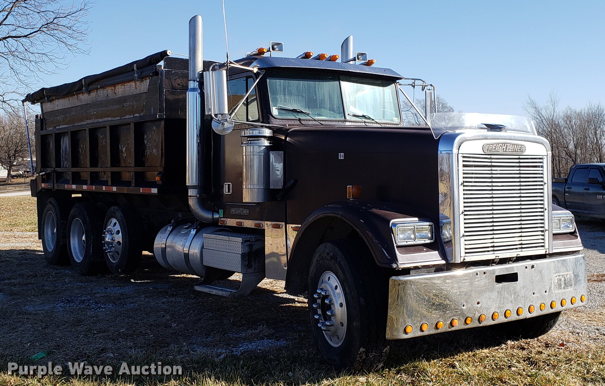Purple Wave is selling a used Construction Dump Truck in Missouri. This item is a 1994 Freightliner FLD 120 Classic dump truck with the following: 327,759 miles on odometer, Caterpillar 3406B 14.6L L6 turbo diesel engine, 13 speed manual transmission, Triple axle, Pusher axle, AC and heat, AM/FM/CD, Air suspension seat, PTO, 16'L x 8'W dump bed, 34" side height, 23" side board height, Air operated end gate, Roll tarp, Dual fuel tanks, Dual rear exhaust stack, Air suspension, Air brakes, 315/80R22.5 front tires, 255/70R22.5 lift axle tires, 11R24.5 rear tires