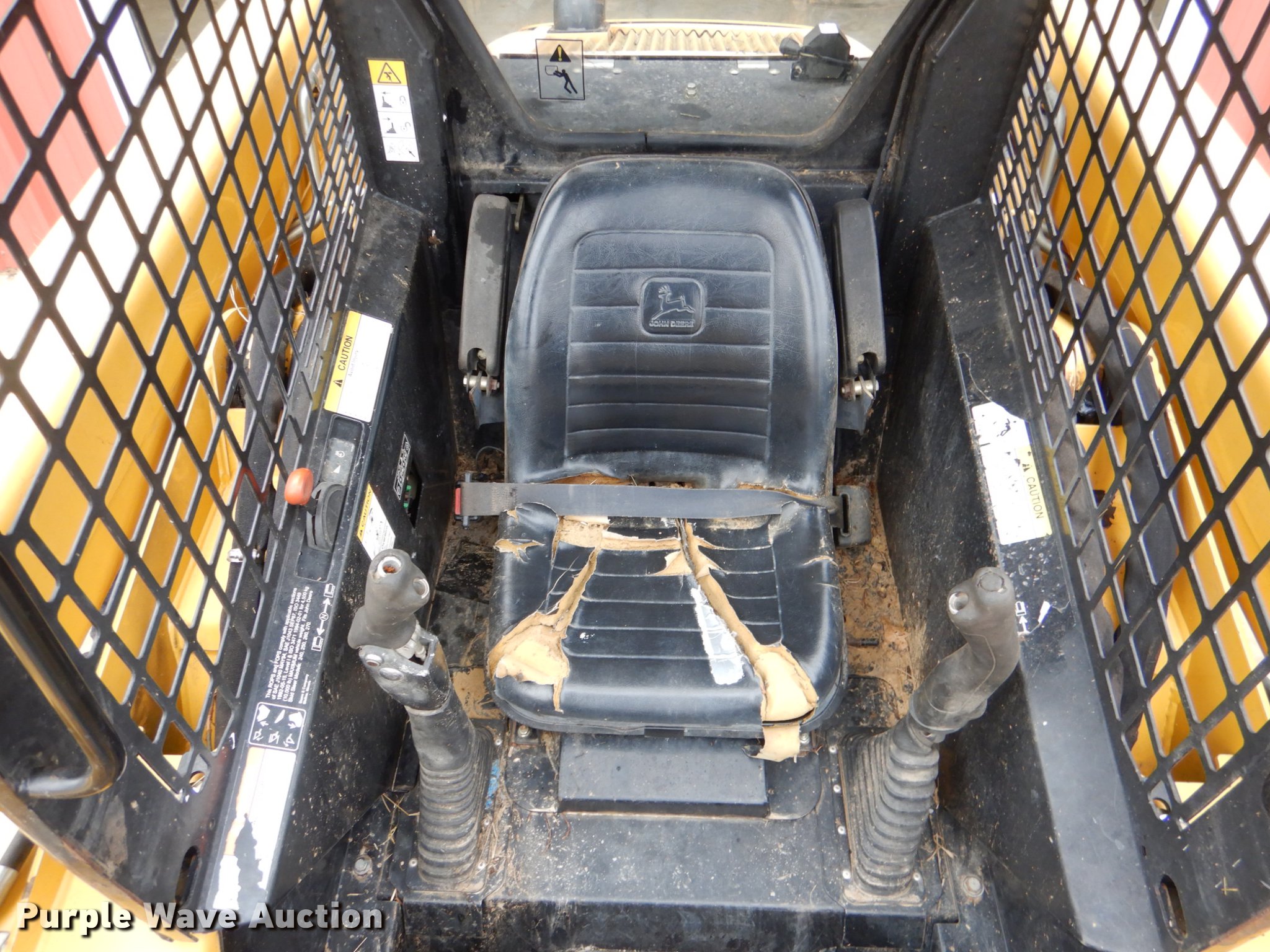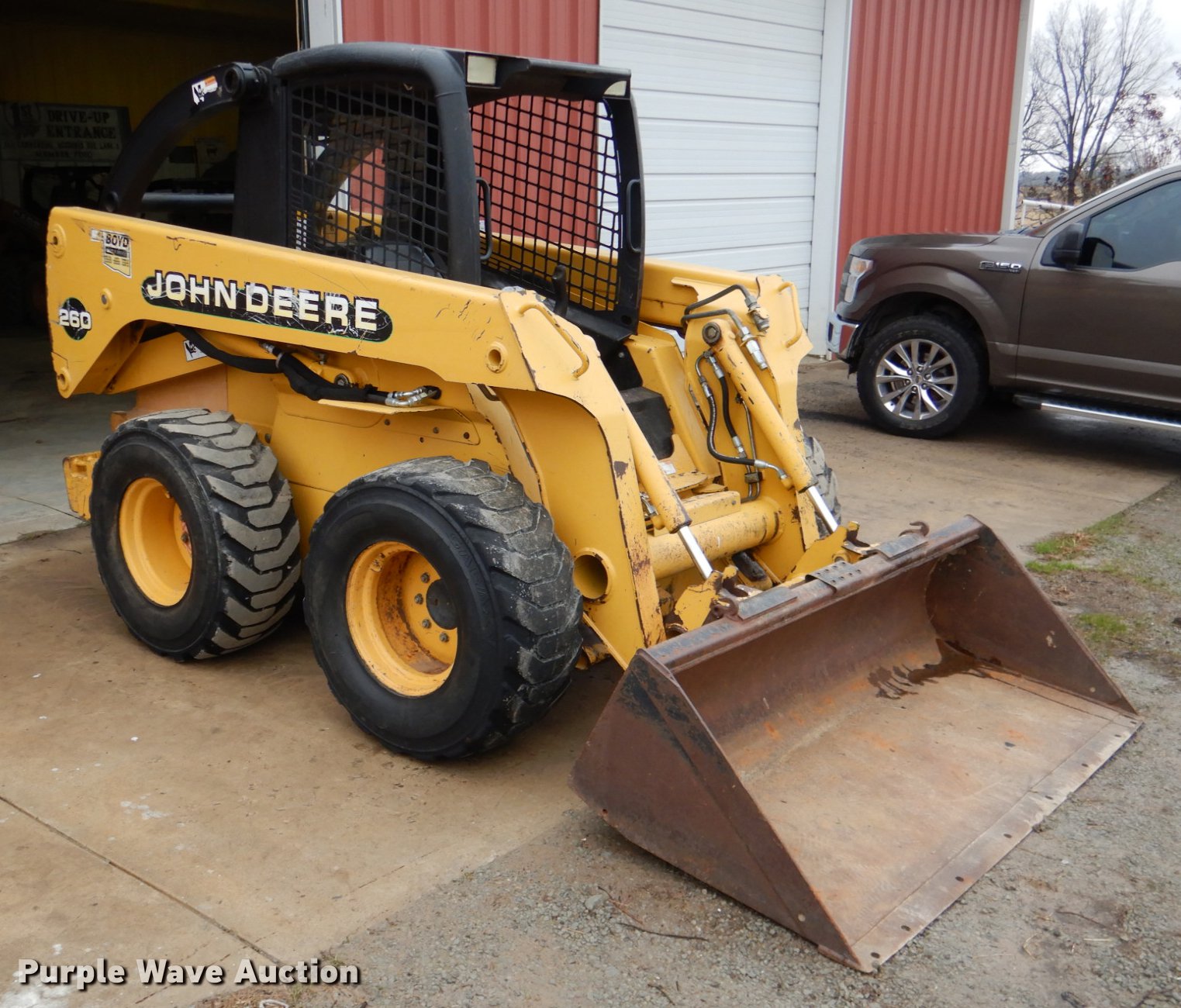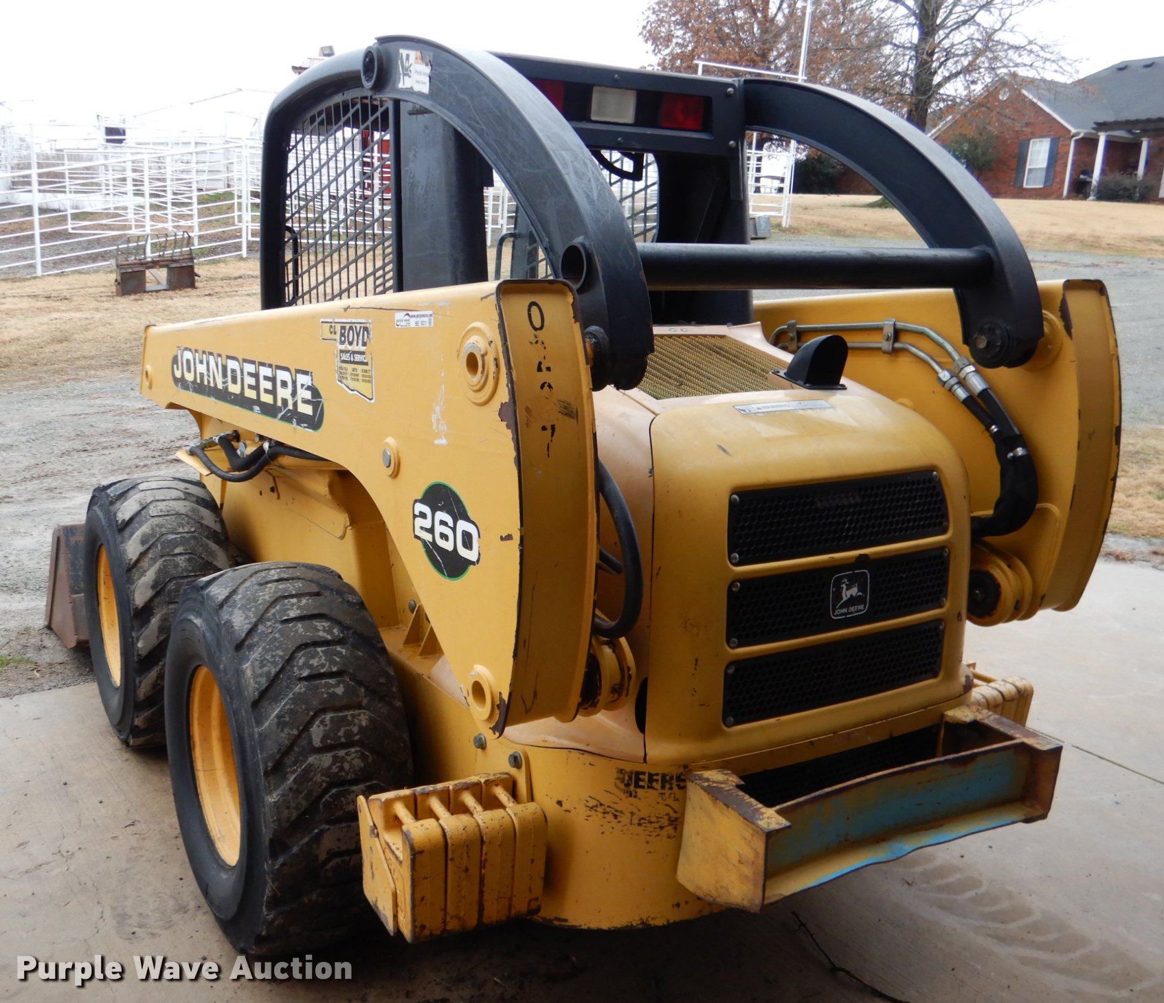 Purple Wave is selling a used Skid Steer Loader in Oklahoma. This item is a 2000 John Deere 260 skid steer with the following: 1,652 hours on meter, John Deere three cylinder diesel engine, Hydrostatic transmission, Open station/canopy, Hand and foot controls, Front and rear work lights, 72"W bucket, Hydraulic quick coupler, Auxiliary hydraulics, Counter weights, 14-17.5 tires, Right drive motor rebuilt 08/2017, Non-operational oil pressure gauge, Serial 260466