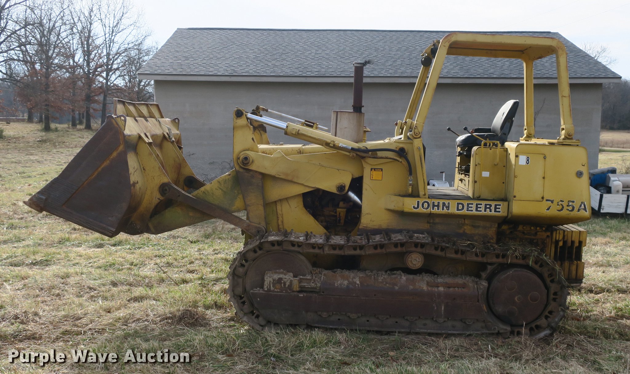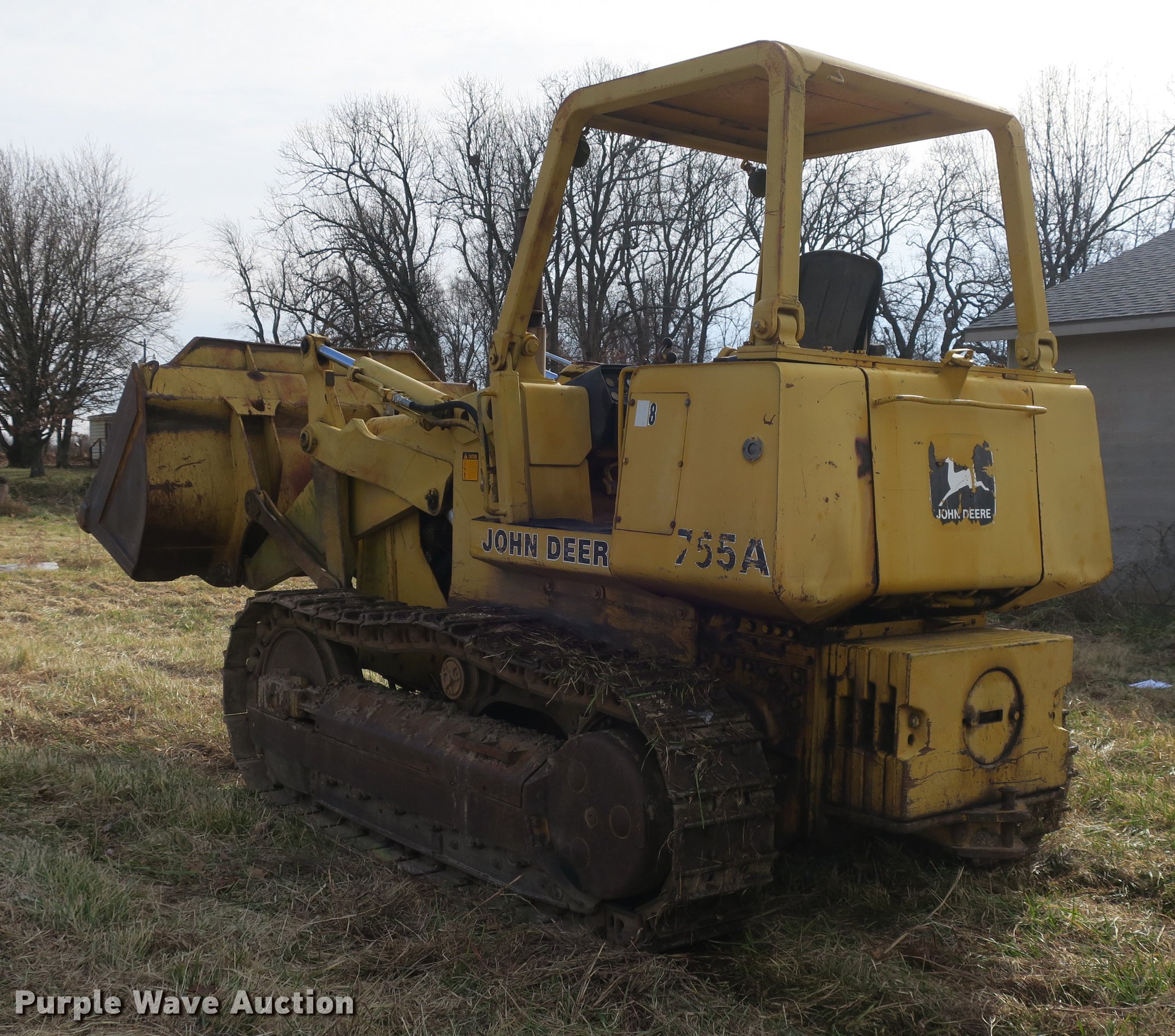 Purple Wave is selling a used Crawler Loader in Missouri. This item is a 1984 John Deere 755A track loader with the following: 4,532 hours on meter, John Deere six cylinder turbo diesel engine, Hydrostatic transmission, OROPS, Suspension seat, Joystick bucket controls, 86"W general purpose bucket, Bolt-on cutting edge, Front auxiliary hydraulics, Counterweights, 17"W double grouser track pads, Transmission issues, Lift cylinders leak, No bolt-on cutting edge, Serial T0755AX382747
