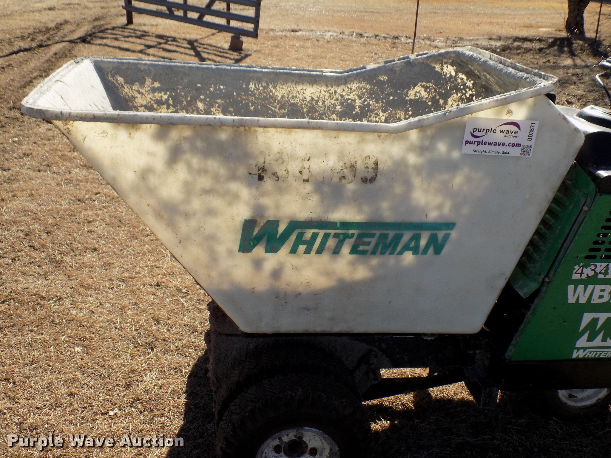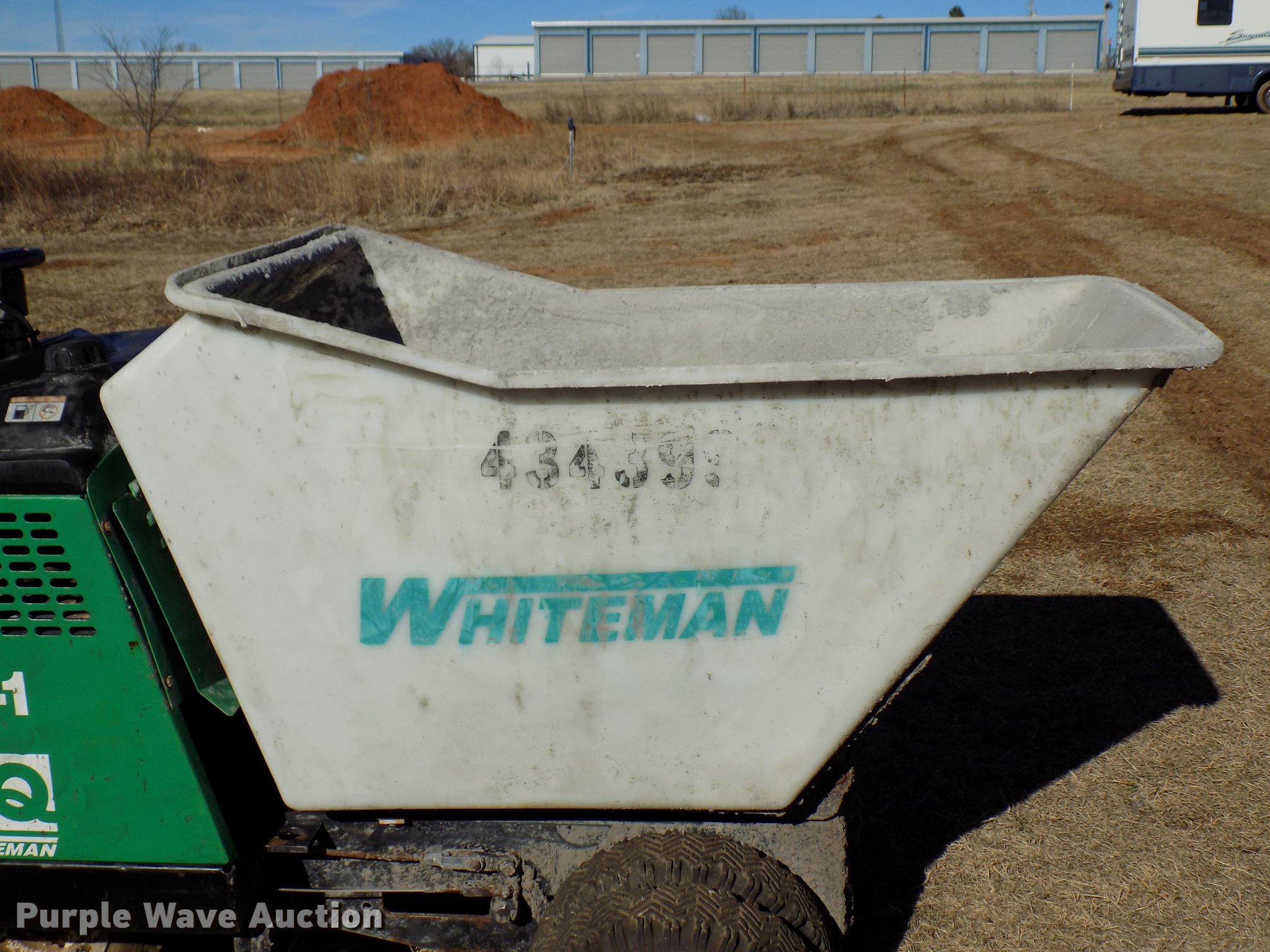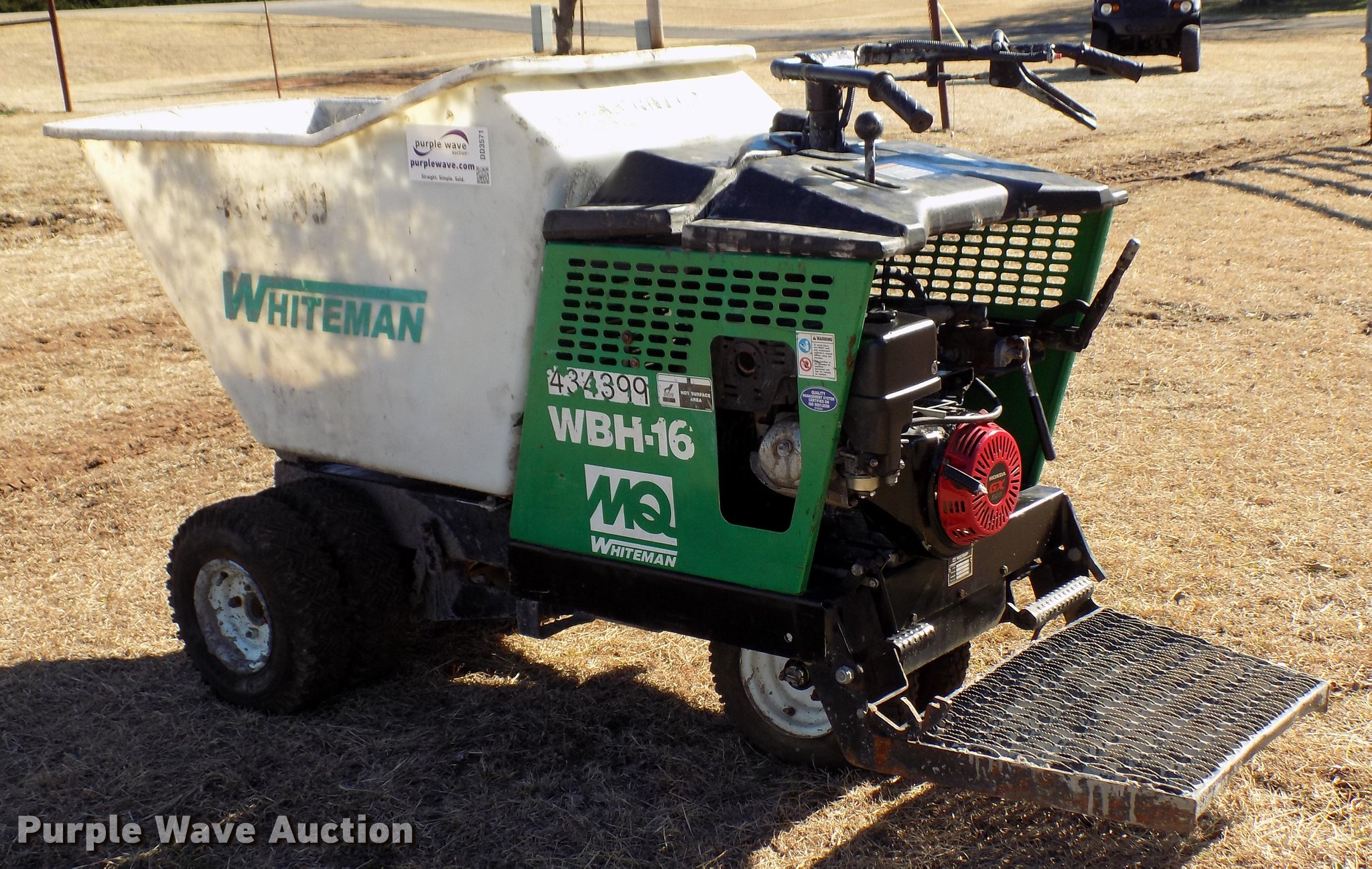 Purple Wave is selling a used Concrete Dispenser in Oklahoma. This item is a 2012 Whiteman WBH-16FSB power buggy with the following: Honda GX390 gas engine, 16 cu.ft. bucket capacity, 5.70-8 tires, Serial 120433