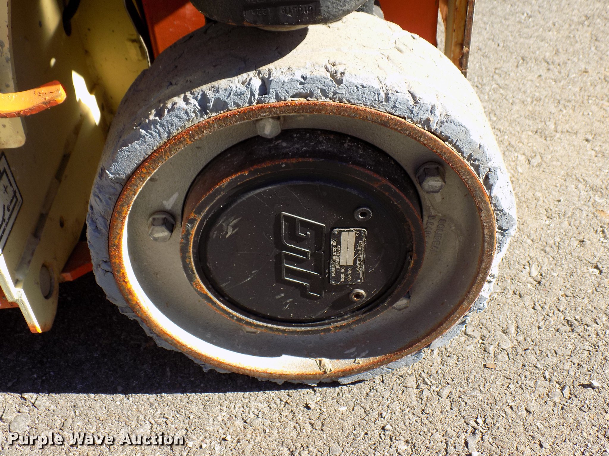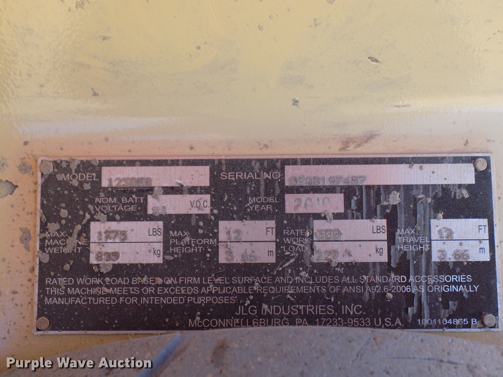 Purple Wave is selling a used Scissor or Vertical Lift in Oklahoma. This item is a 2010 JLG 1230ES scissor lift with the following: 258 hours on meter, 500 lbs maximum working load capacity, 12' maximum lift height, 323 x 100 tires, Serial 0200197457