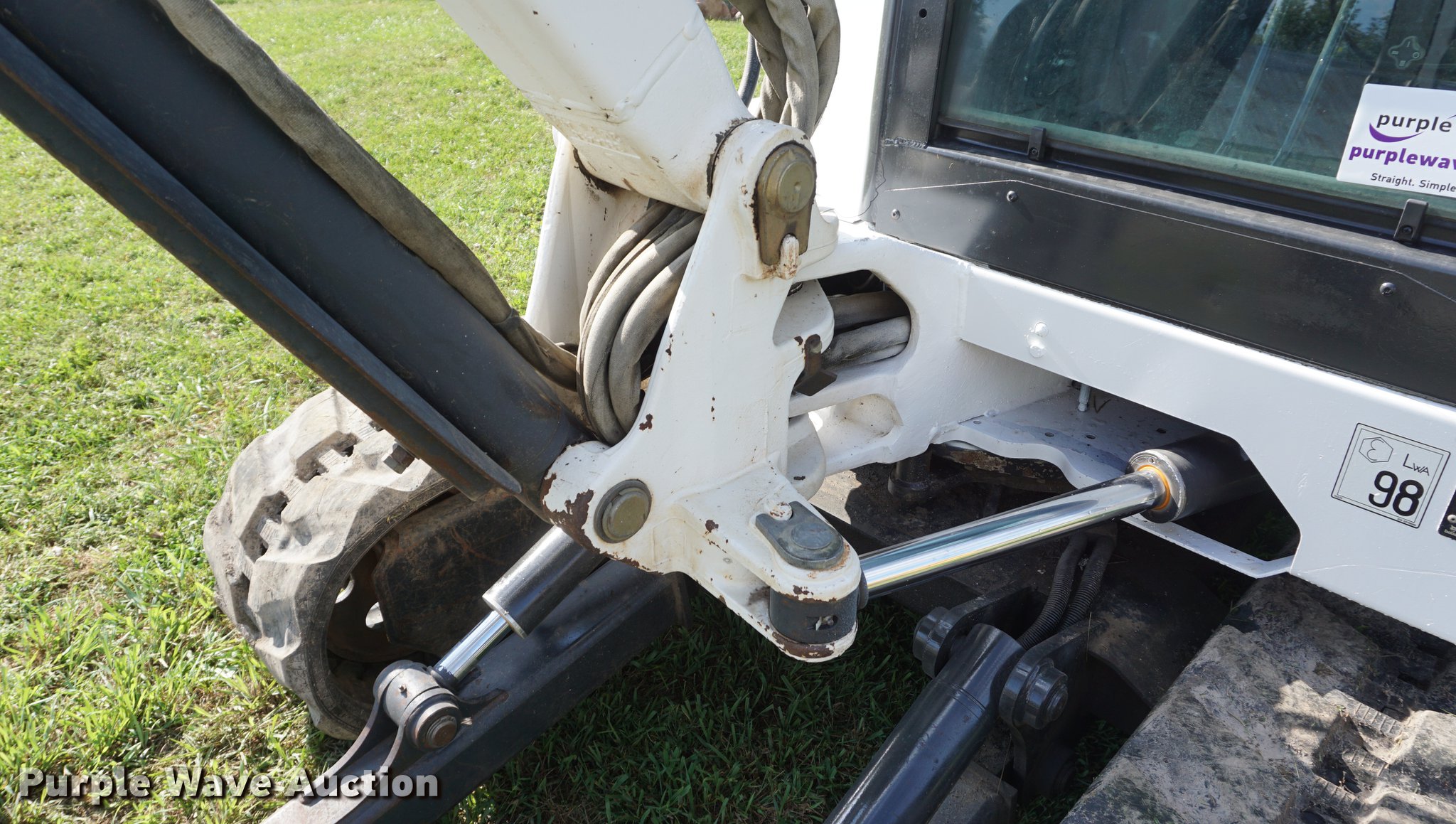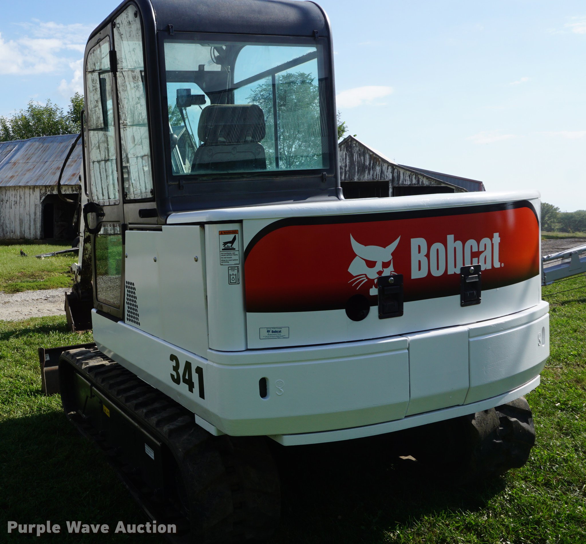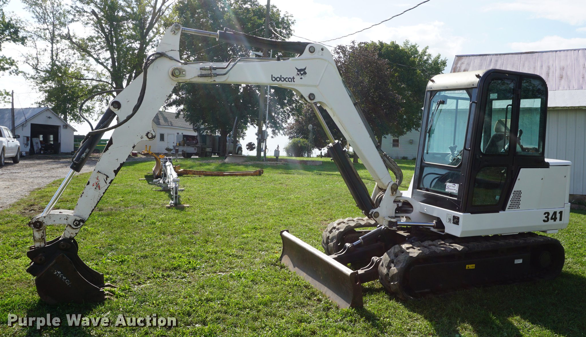 Purple Wave is selling a used Mini Excavator in Missouri. This item is a 2000 Bobcat 341 mini excavator with the following: 2,675 hours on meter, Kubota V2203 2.2L four cylinder diesel engine, 48 HP, Two speed hydrostatic transmission, Enclosed cab, Heat, Suspension seat, Wipers, 75"W backfill blade, Standard boom, 76" stick length, Two-way auxiliary hydraulics, Mechanical quick coupler, Bobcat 20"W bucket, (4) bolt-on teeth, 16"W tracks, Serial 230611278