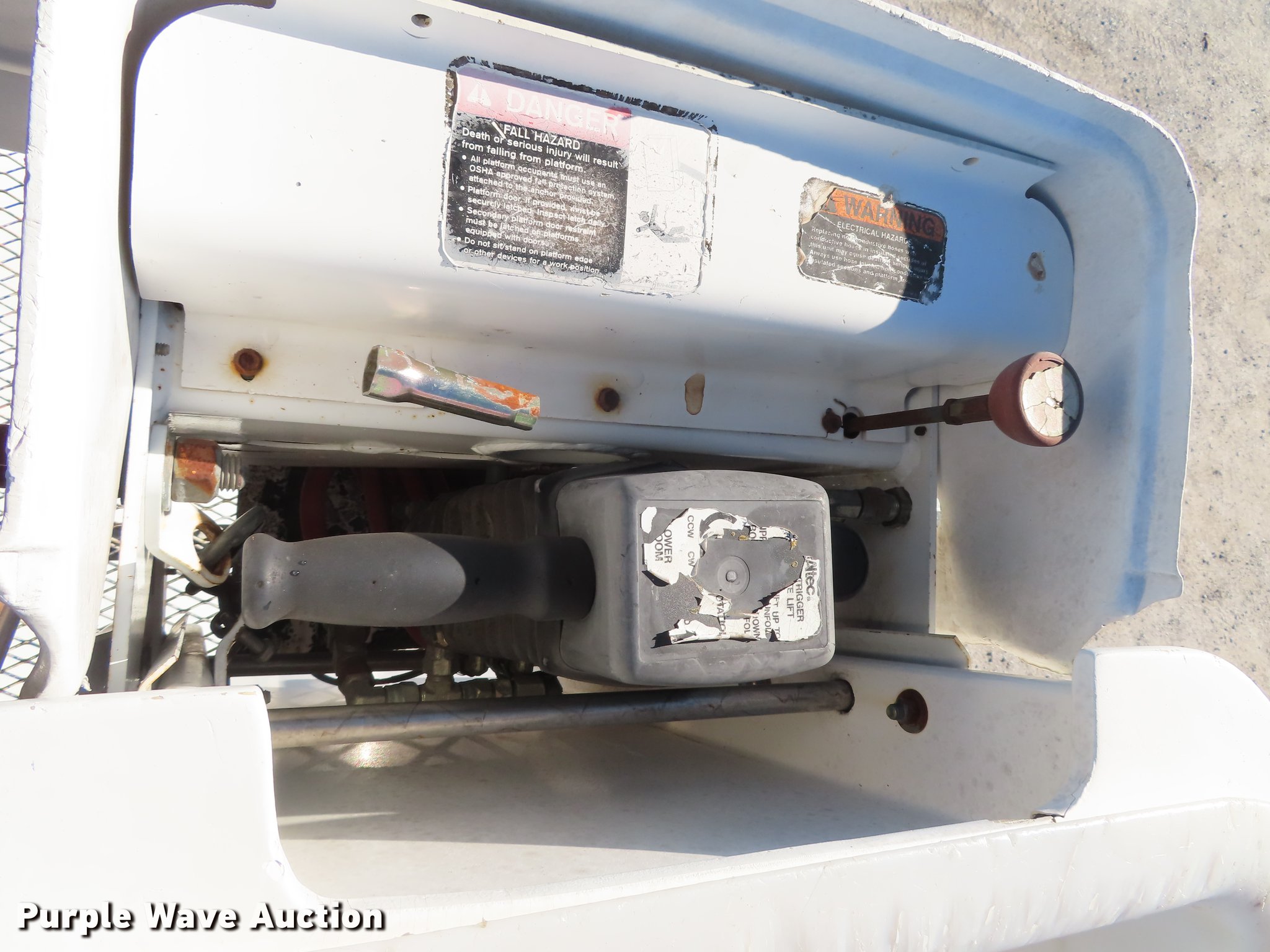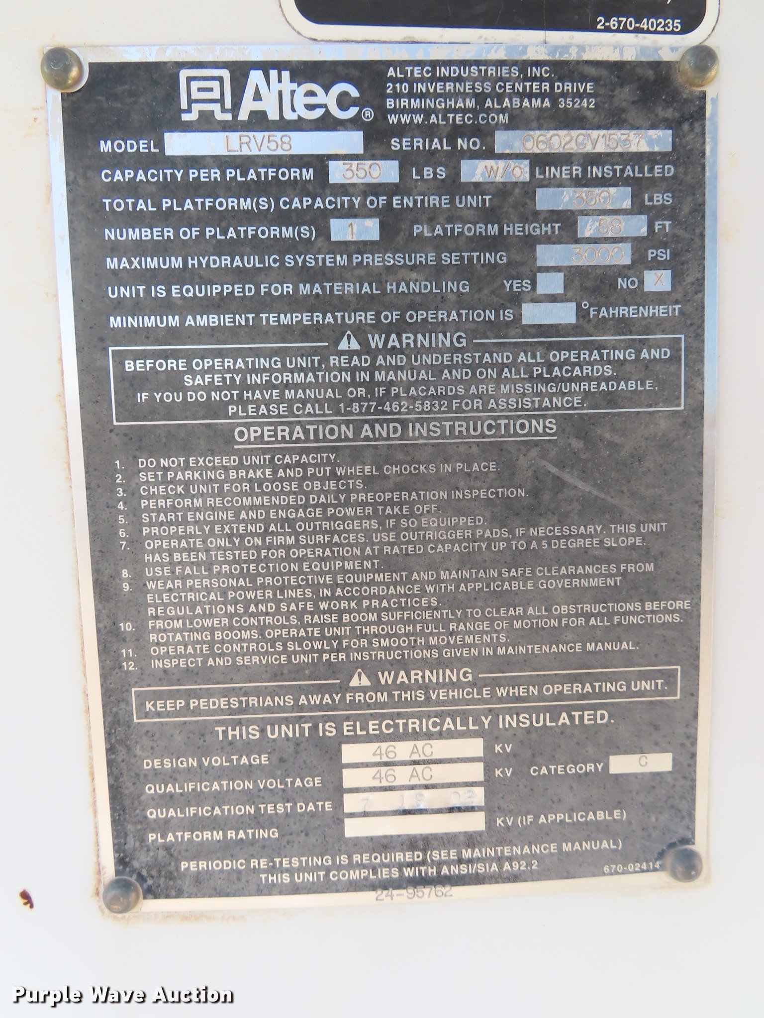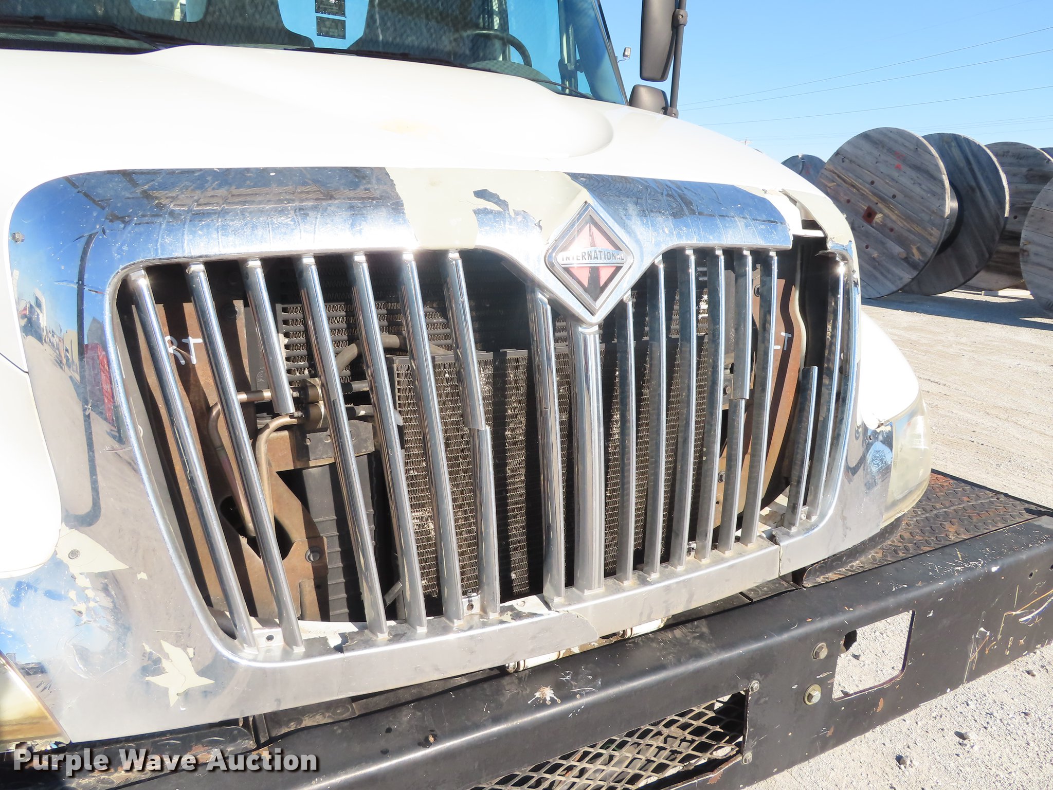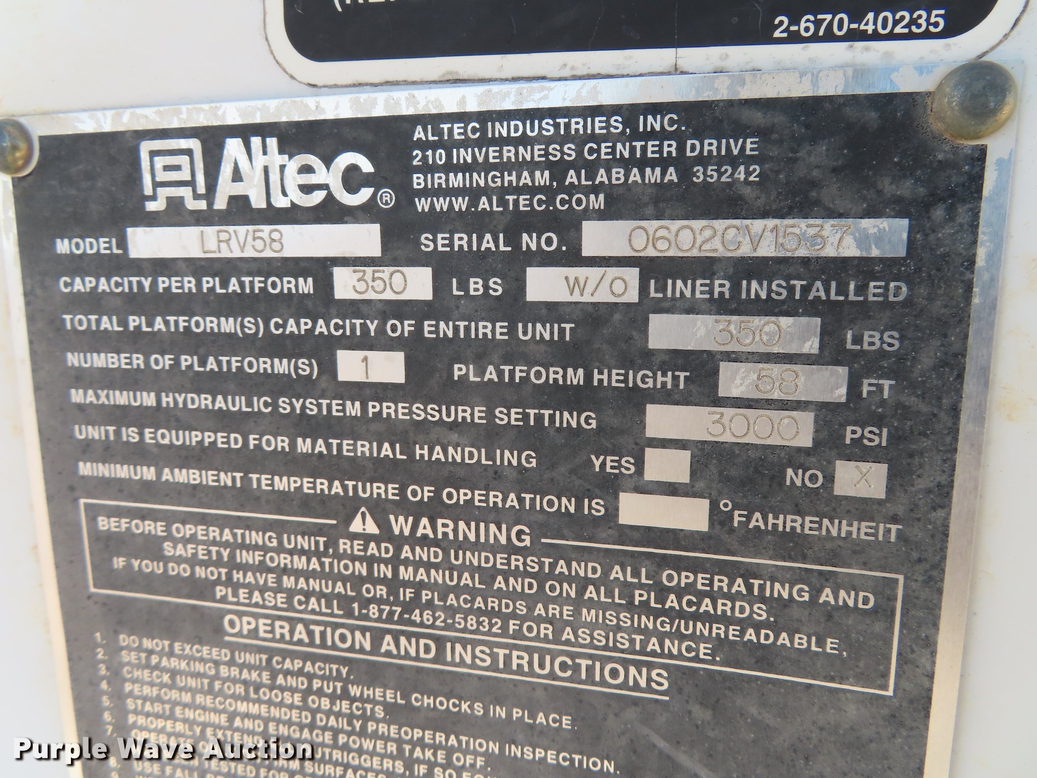 Purple Wave is selling a used Bucket Truck in Oklahoma. This item is a 2003 International 4300 bucket truck with the following: 56,768 miles on odometer, 10,224 hours on meter, International DT466 7.6L L6 turbo diesel engine, Eaton Fuller Synchro-6 six speed manual transmission, Single axle, AC and heat, AM/FM, Suspension seat, Block heater, Front tow hooks, PTO, Casco CFB flatbed, 11'L, Catwalk, Serial 02091763, Altec LRV58 boom, 58' max lift height, 350 lbs max lift capacity, Man basket, Boom rotation, Articulating and insulated boom, Serial 0602CV1537, Single fuel tank, Spring suspension, Air brakes, 11R22.5 tires, Unit# 274