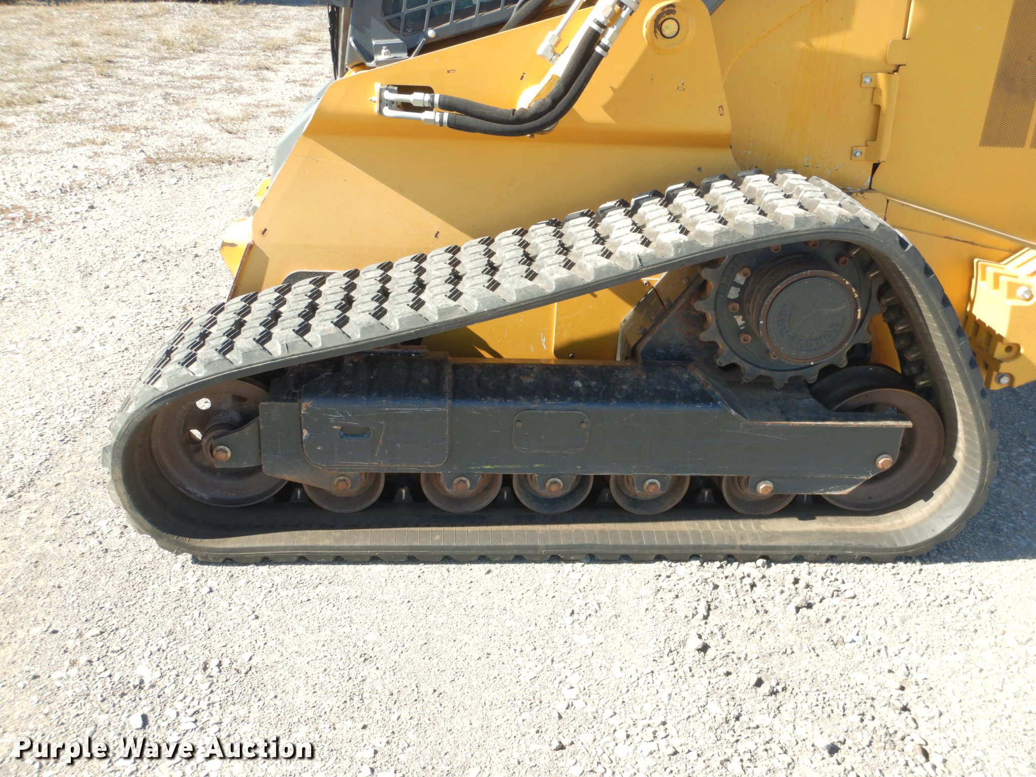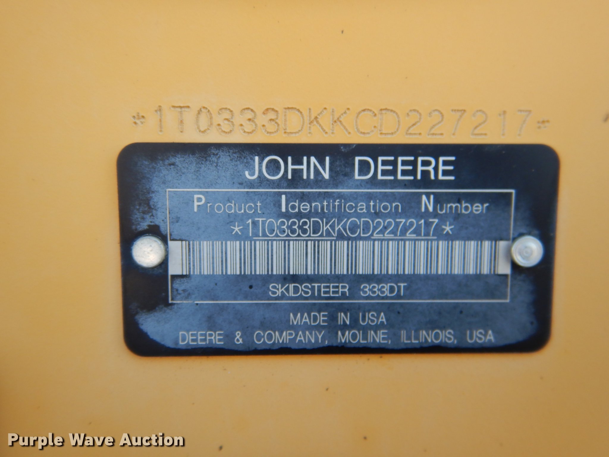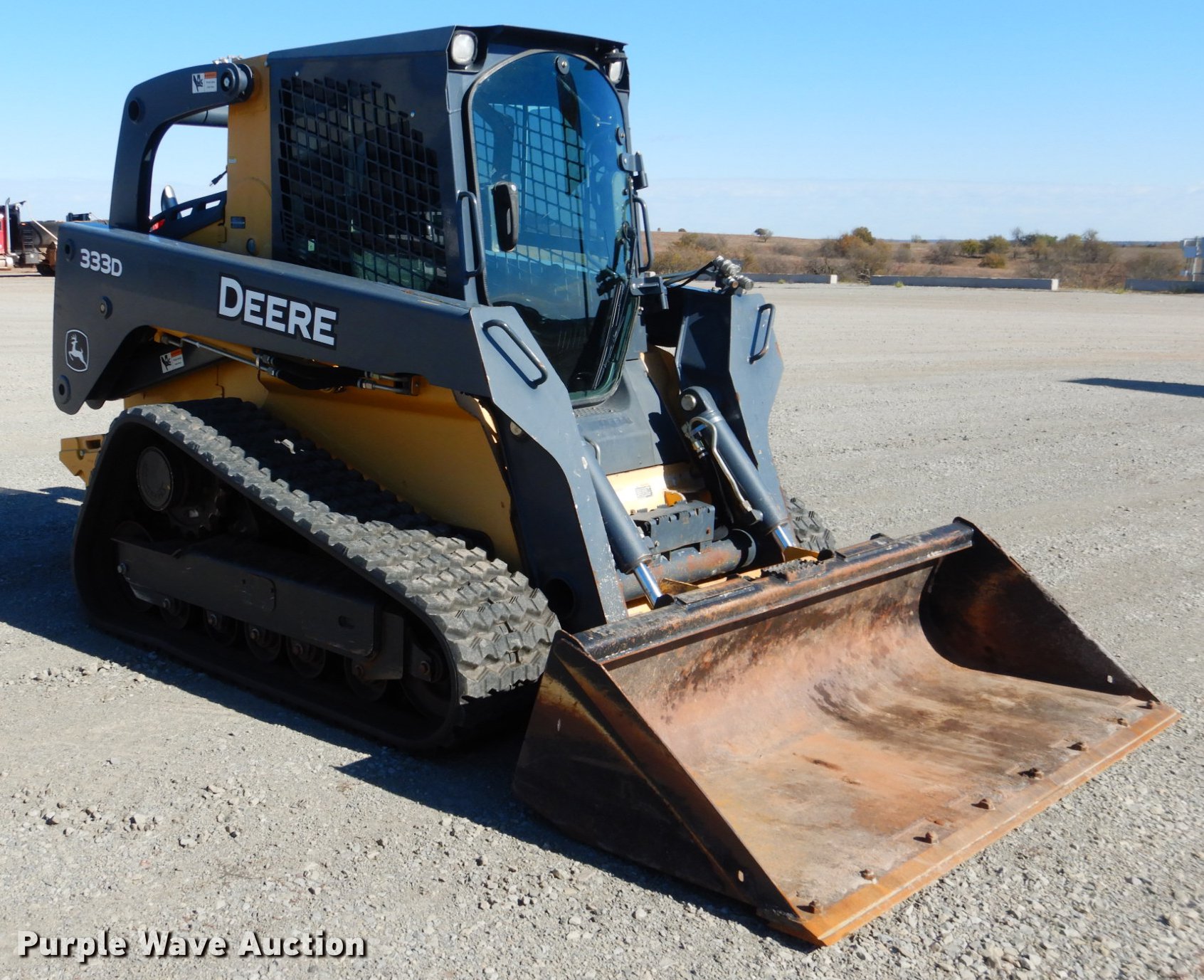 Purple Wave is selling a used Tracked Skid Steer Loader in Kansas. This item is a 2012 John Deere 333D skid steer with the following: 1,030 hours on meter, John Deere 5030 3.0L turbo diesel engine, Hydrostatic transmission, Enclosed cab, AC and heat, AM/FM, Joystick controls, Spring suspension seat, Front and rear work lights, Wipers, Block heater, John Deere C84 83"W bucket, Bolt-on cutting edge, Hydraulic quick coupler, Auxiliary hydraulics, Counter weights, 17.5"W tracks, Serial 1T033DKKC0227217