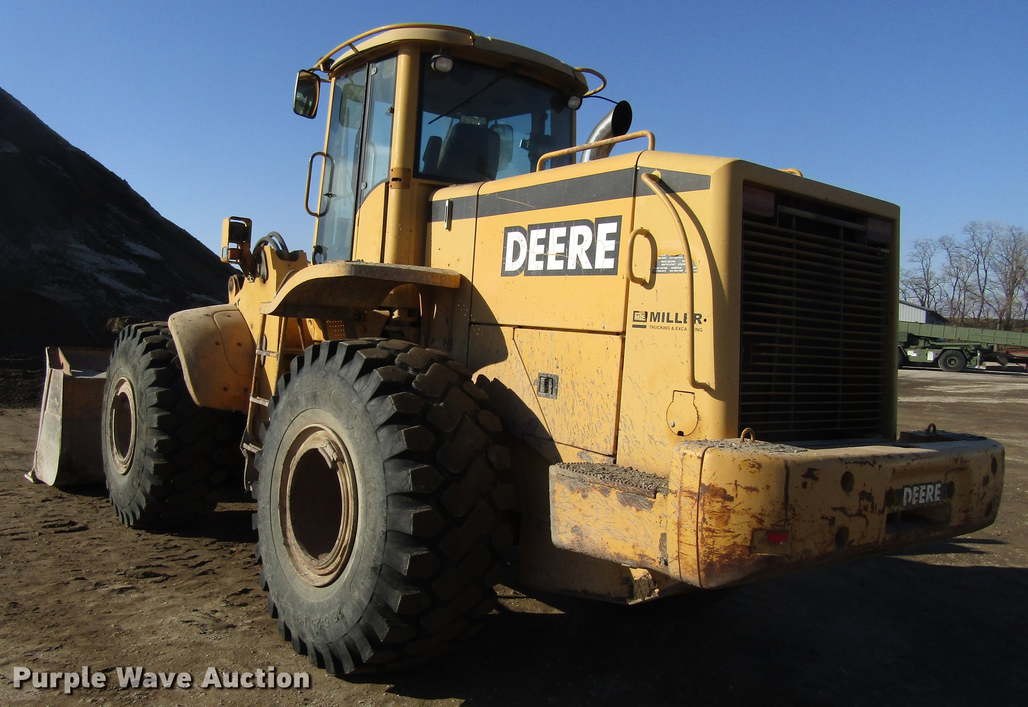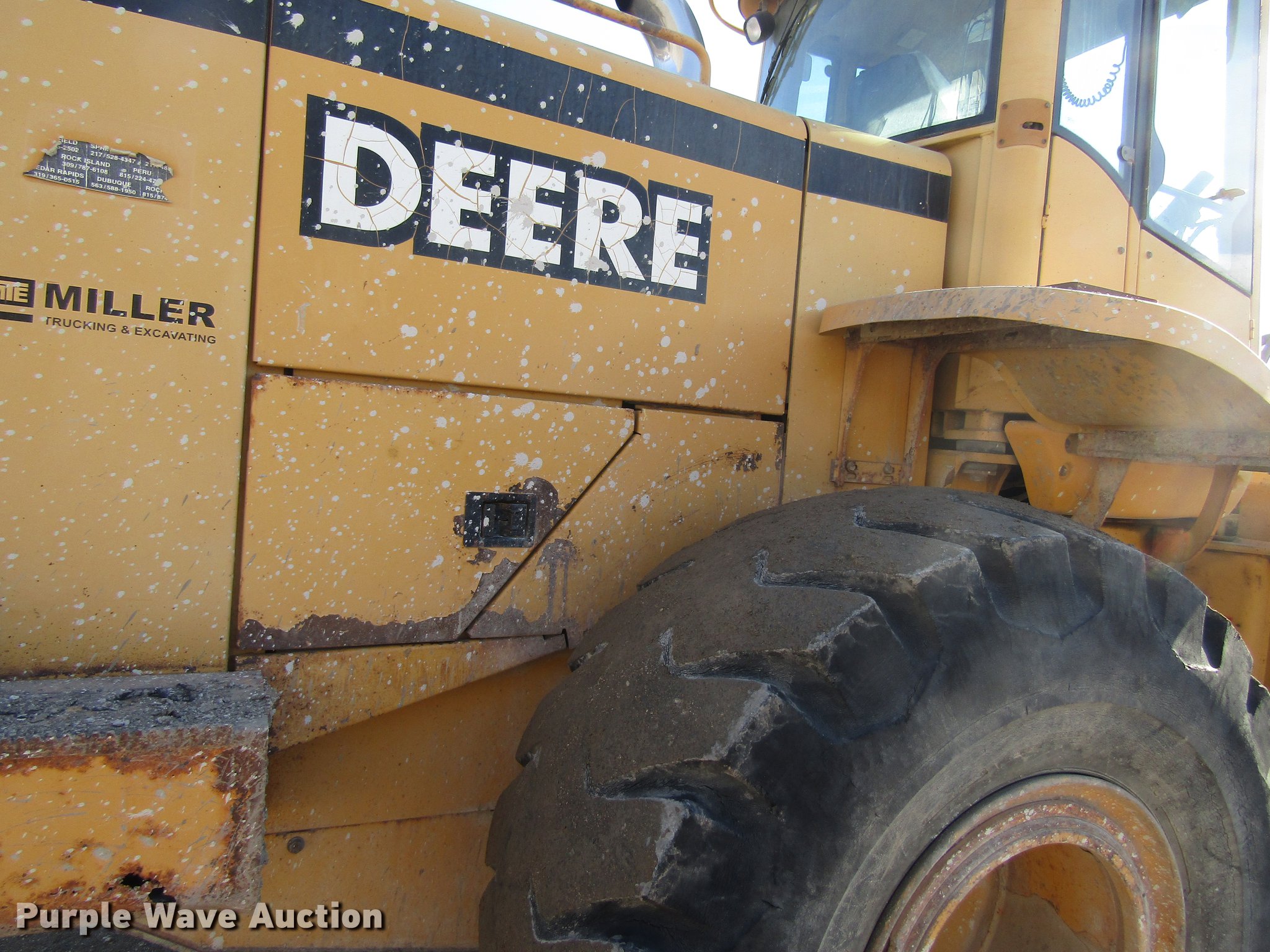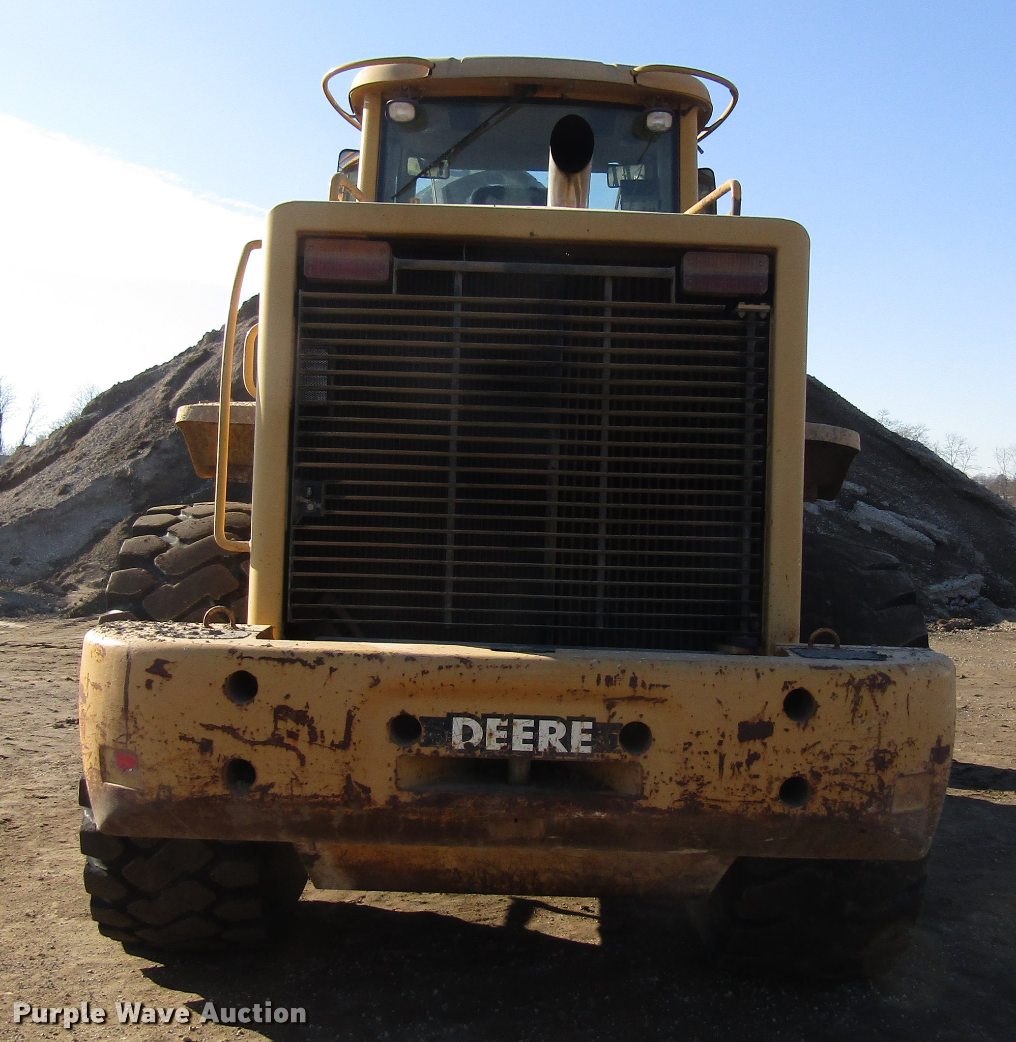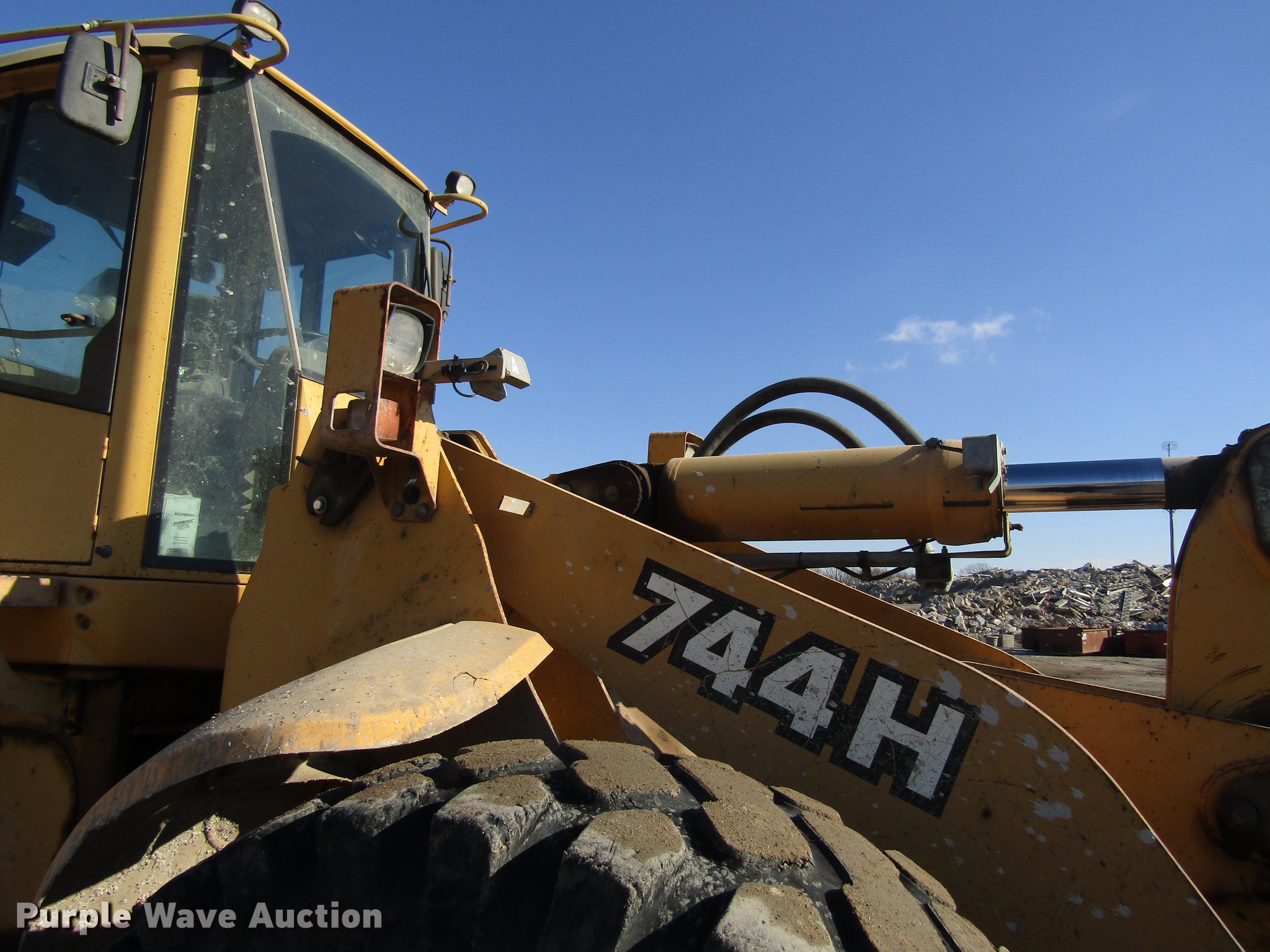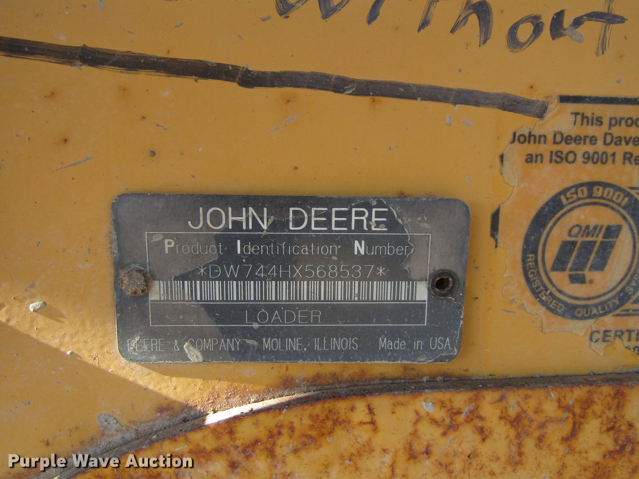 Purple Wave is selling a used Wheel Loader in Illinois. This item is a 1998 John Deere 744H wheel loader with the following: 19,966 hours on meter, John Deere 6125A six cylinder turbo diesel engine, Powershift transmission, 4F-3R gears, Enclosed cab, AC and heat, Joystick bucket controls, Front and rear work lights, Backup alarm, 126"W general purpose bucket, Bolt-on cutting edge, 26.5-25 tires, Center joint issues, Serial DW744HX568537