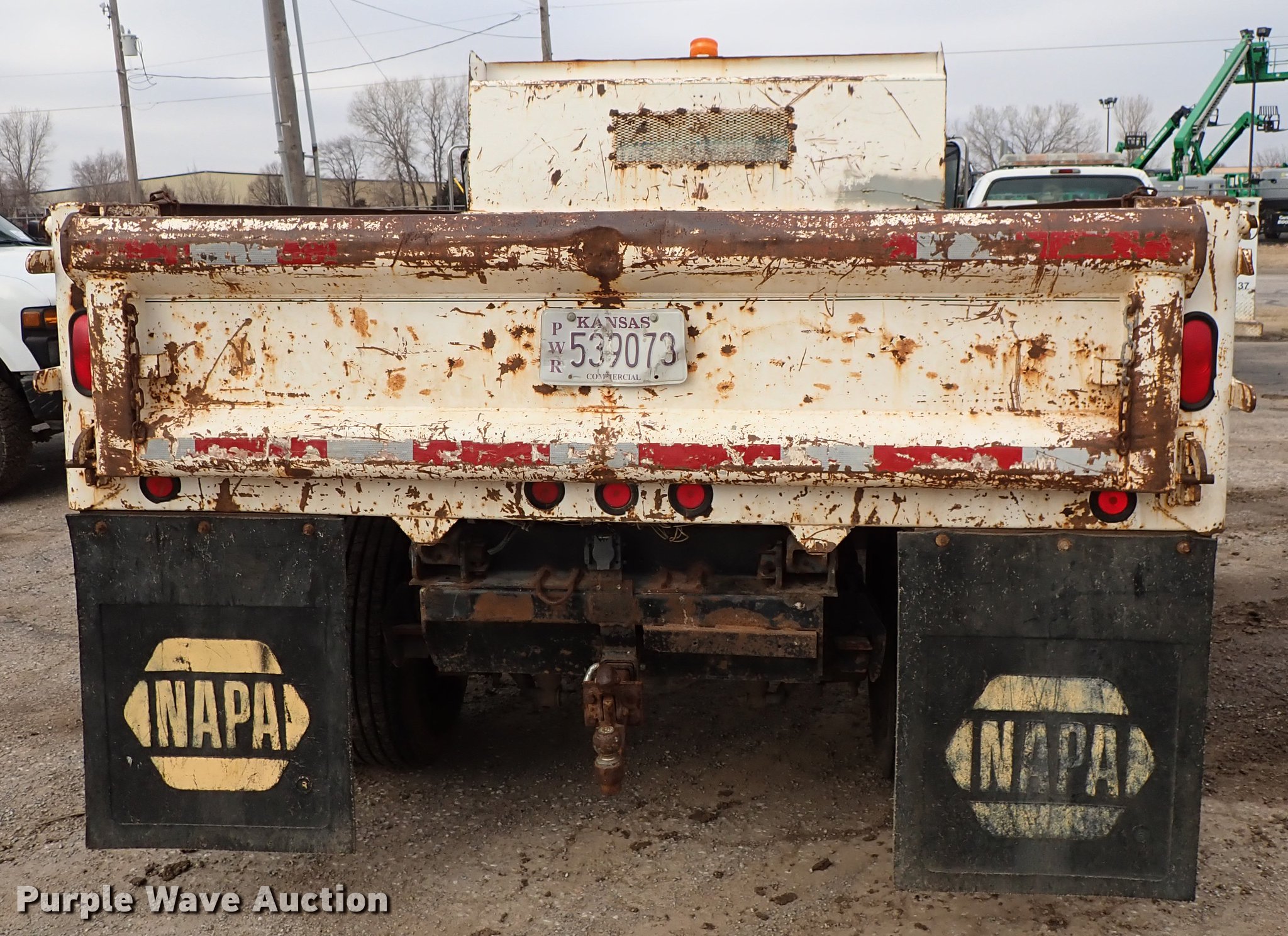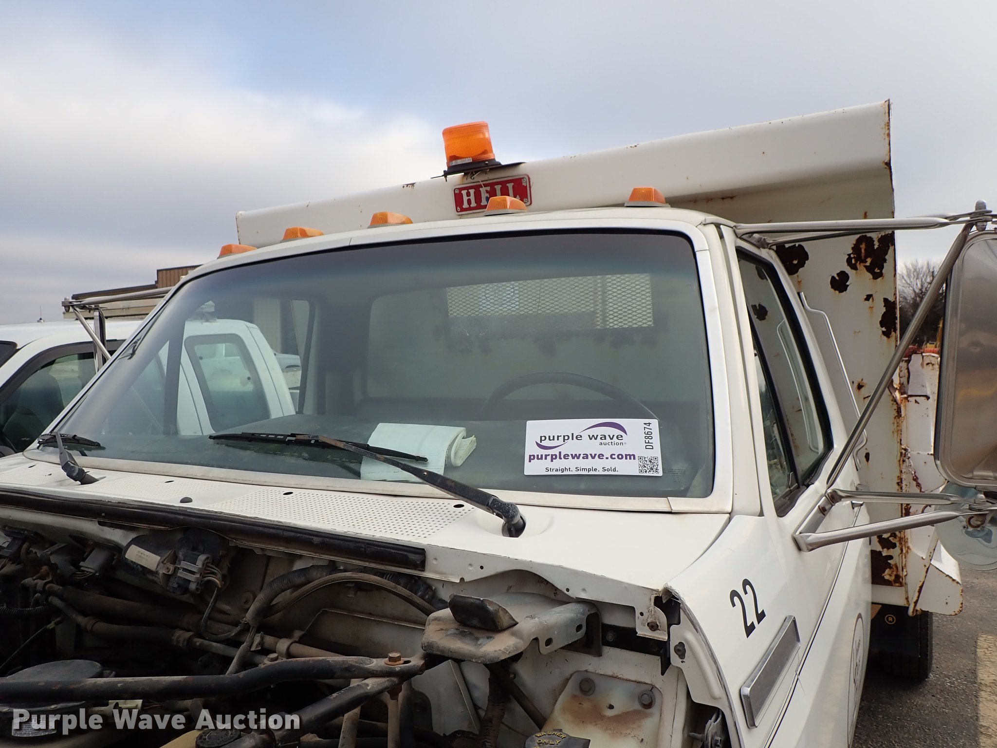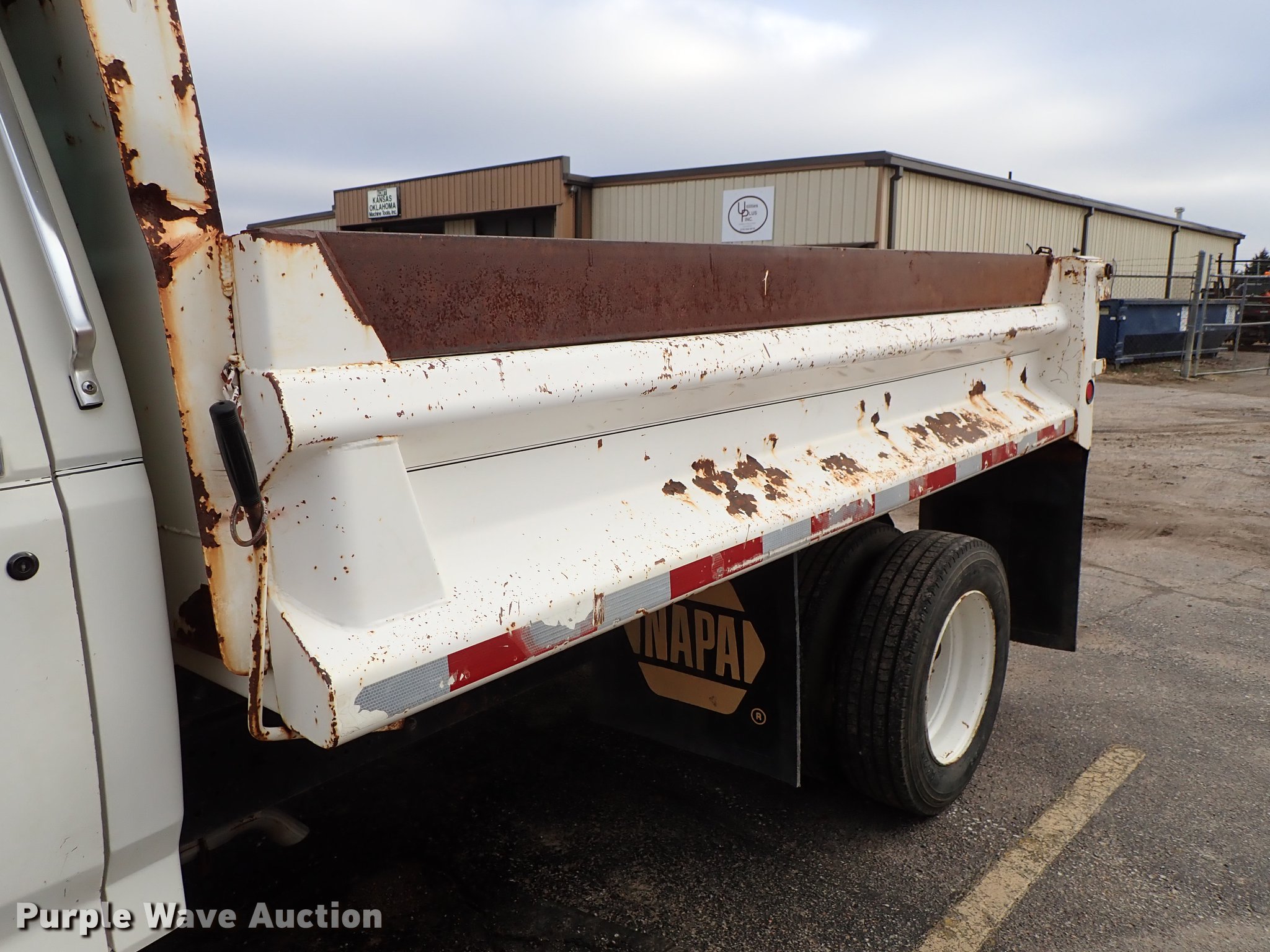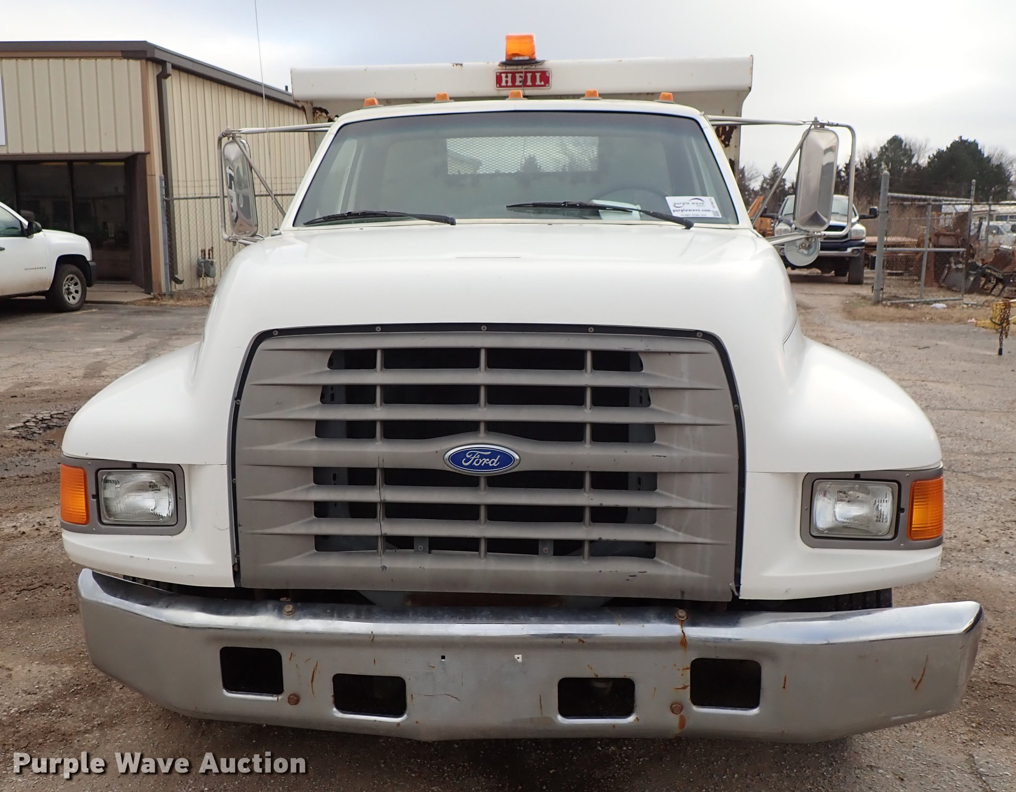 Purple Wave is selling a used Construction Dump Truck in Kansas. This item is a 1995 Ford F700 dump truck with the following: 205,464 miles on odometer, 7.0L V8 gas engine, Automatic transmission, Single axle, Heat, Manual windows and locks, Vinyl interior, 10'L x 92"W steel dump bed, In-cab controls, Receiver hitch, Trailer wiring, Spring suspension, Air brakes, 207" wheelbase, 245/70R19.5 tires, GVWR 21,000 lbs, Radiator leak