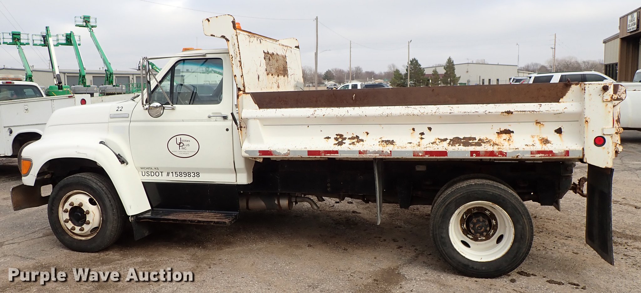 1995 Ford F700 dump truck. 205,464 miles on odometer, 7.0L V8 gas engine, Automatic transmission, Single axle, Heat, Manual windows and locks, Vinyl interior, 10'L x 92"W steel dump bed In-cab controls, Receiver hitch, Trailer wiring, Spring suspension, Air brakes, 207" wheelbase, 245/70R19.5 tires, GVWR 21,000 lbs, Radiator leak. Kansas title. 1FDNF72J6SVA82272. Utilities Plus, Inc.. Wichita, KS 67204