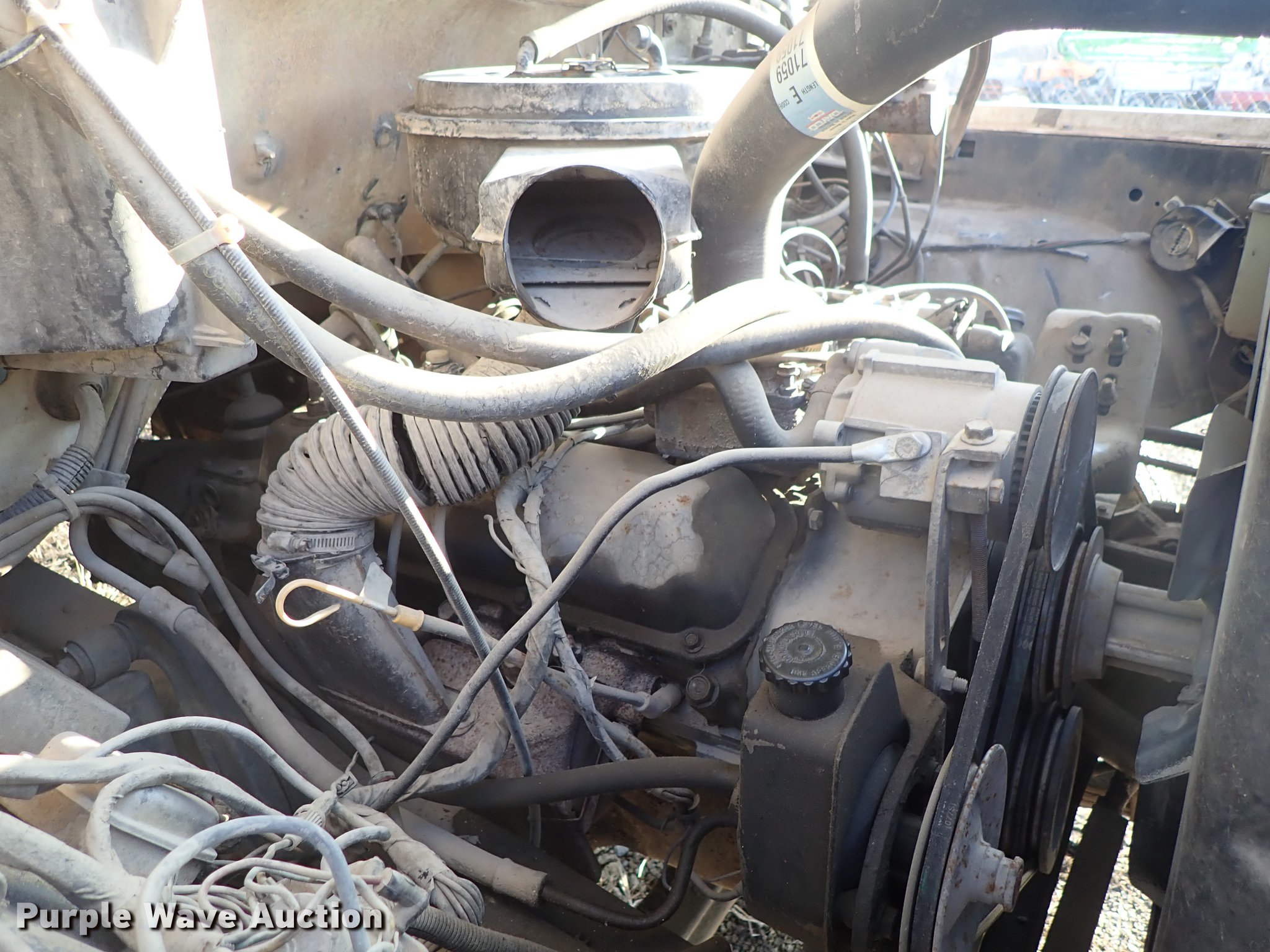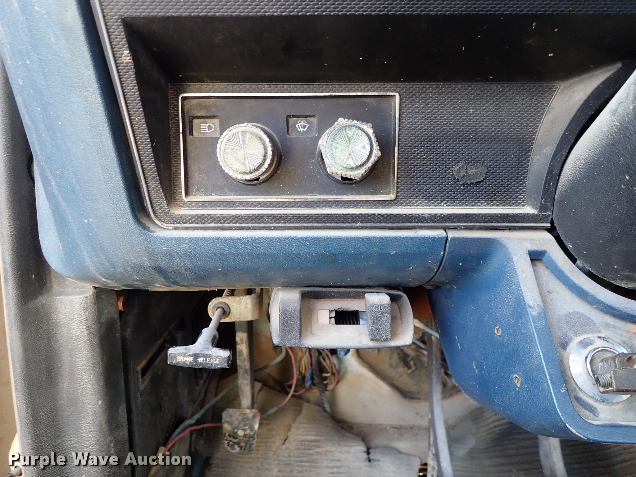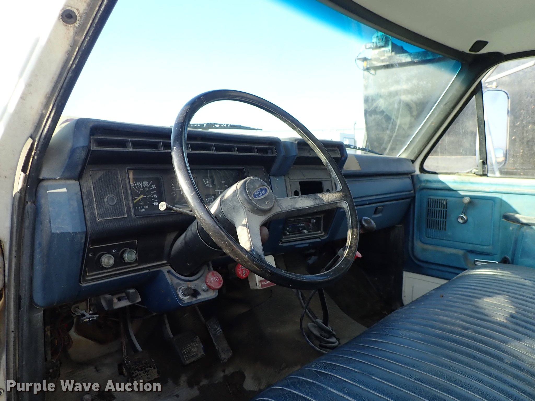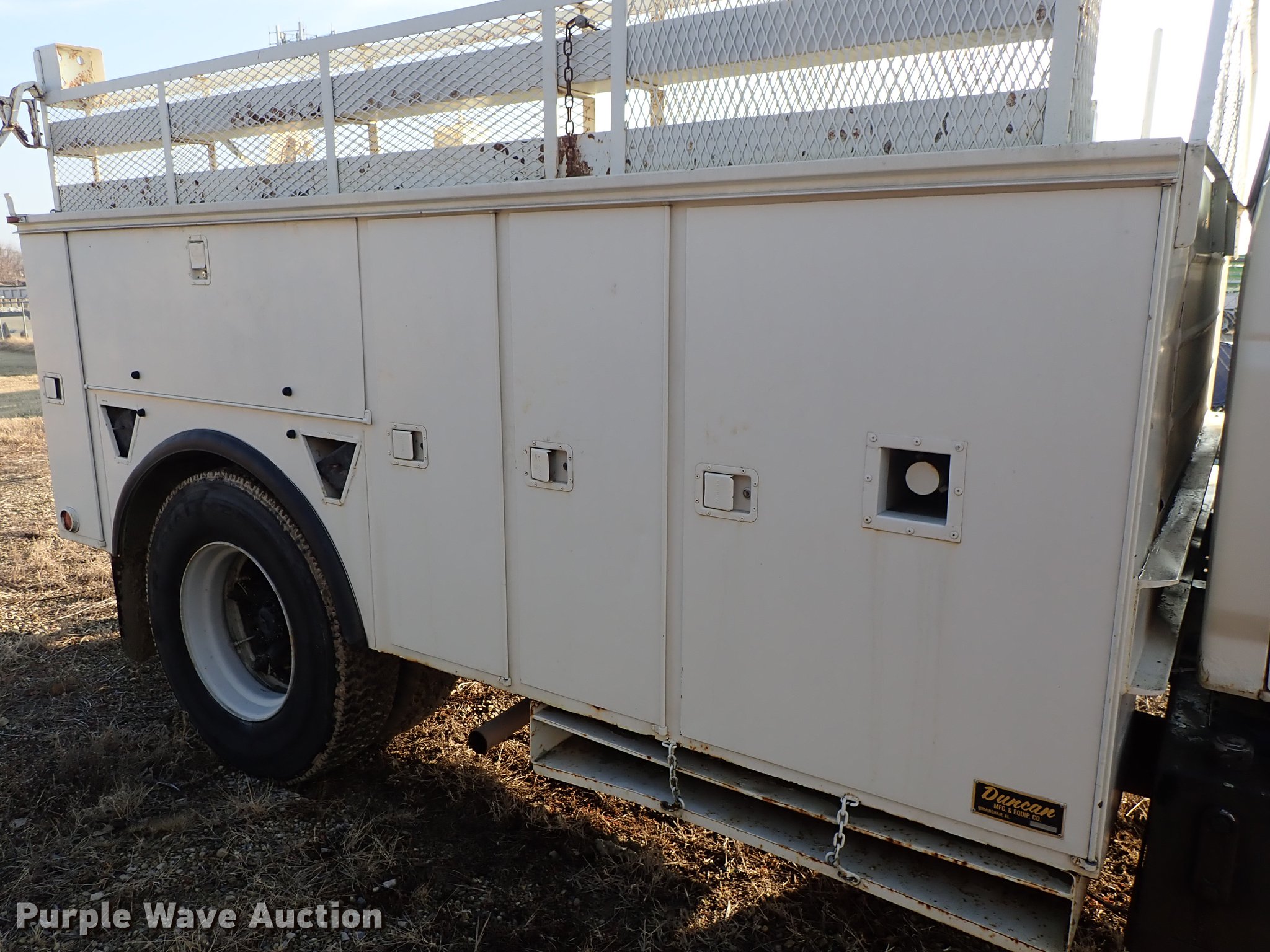 Purple Wave is selling a used Service Truck in Kansas. This item is a 1982 Ford F700 utility truck with the following: 65,320 miles on odometer, 6.1L V8 gas engine, Five speed manual transmission, Two speed rear end, Single axle, Heat, Chelsea PTO, Duncan utility bed, 139"L x 94"W, Winch, Reel carrier, Rear control box, Pintle hitch, Outriggers, Storage, 171" wheelbase, 11R22.5 tires, GVWR 27,500 lbs, Carburetor needs replaced