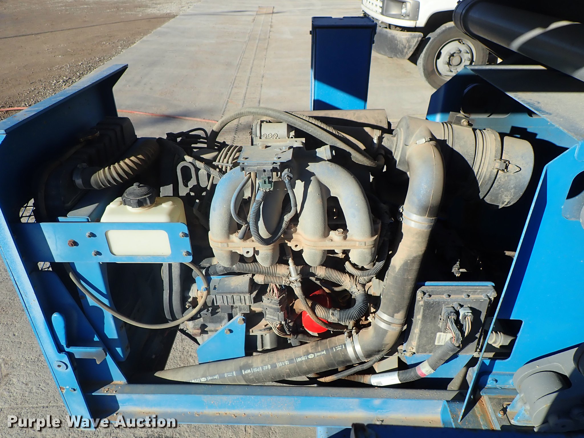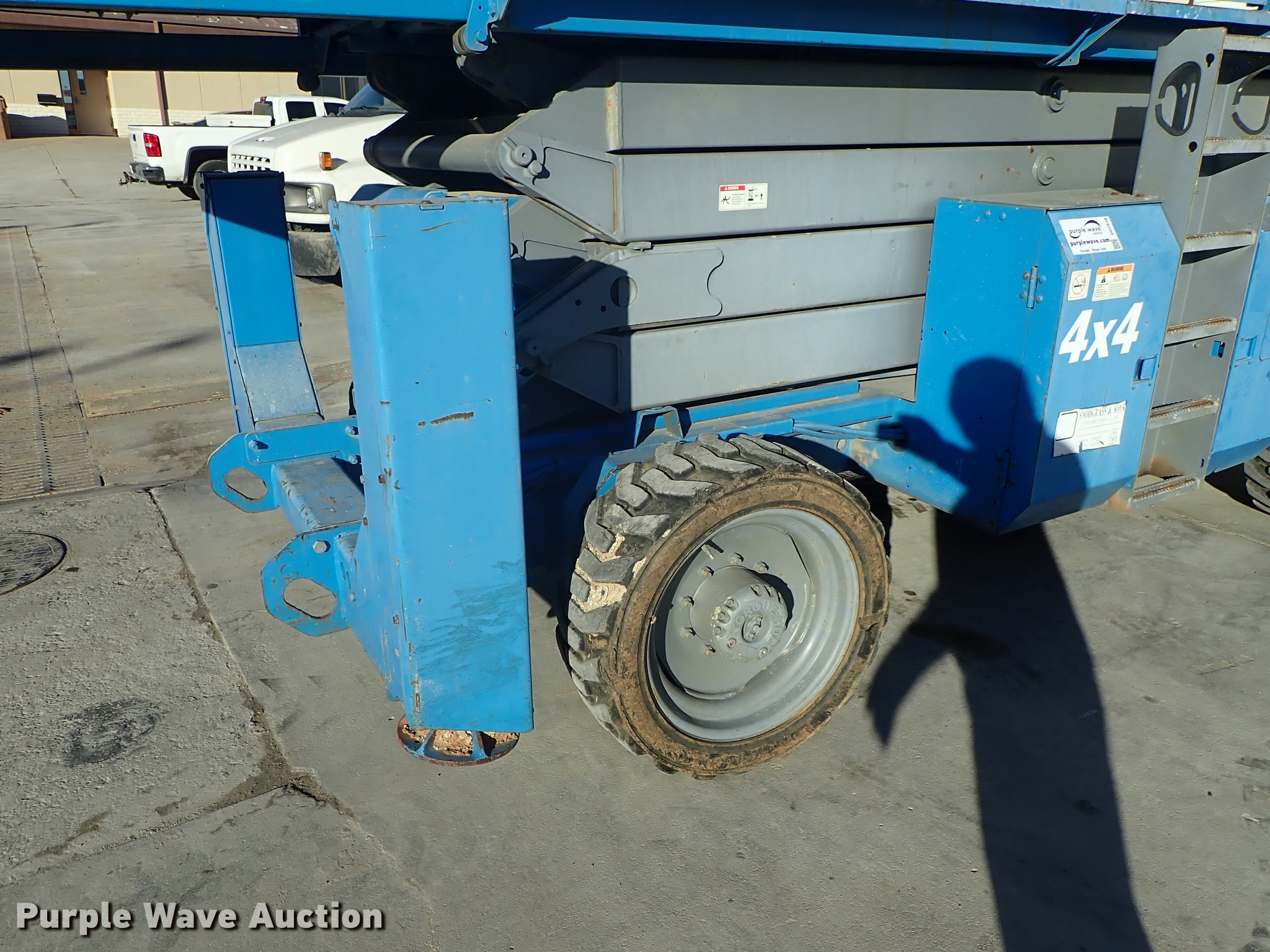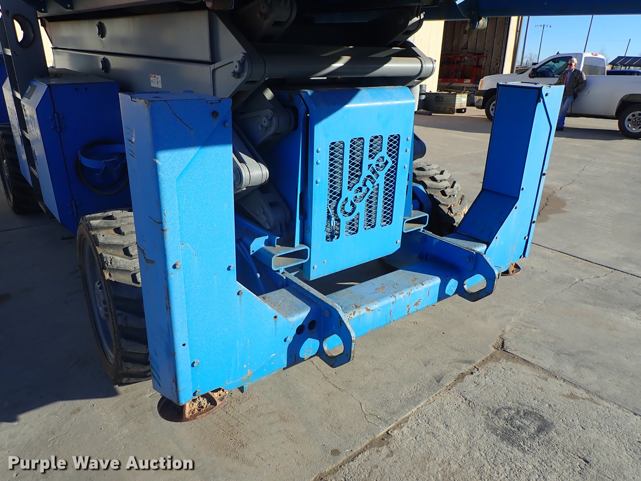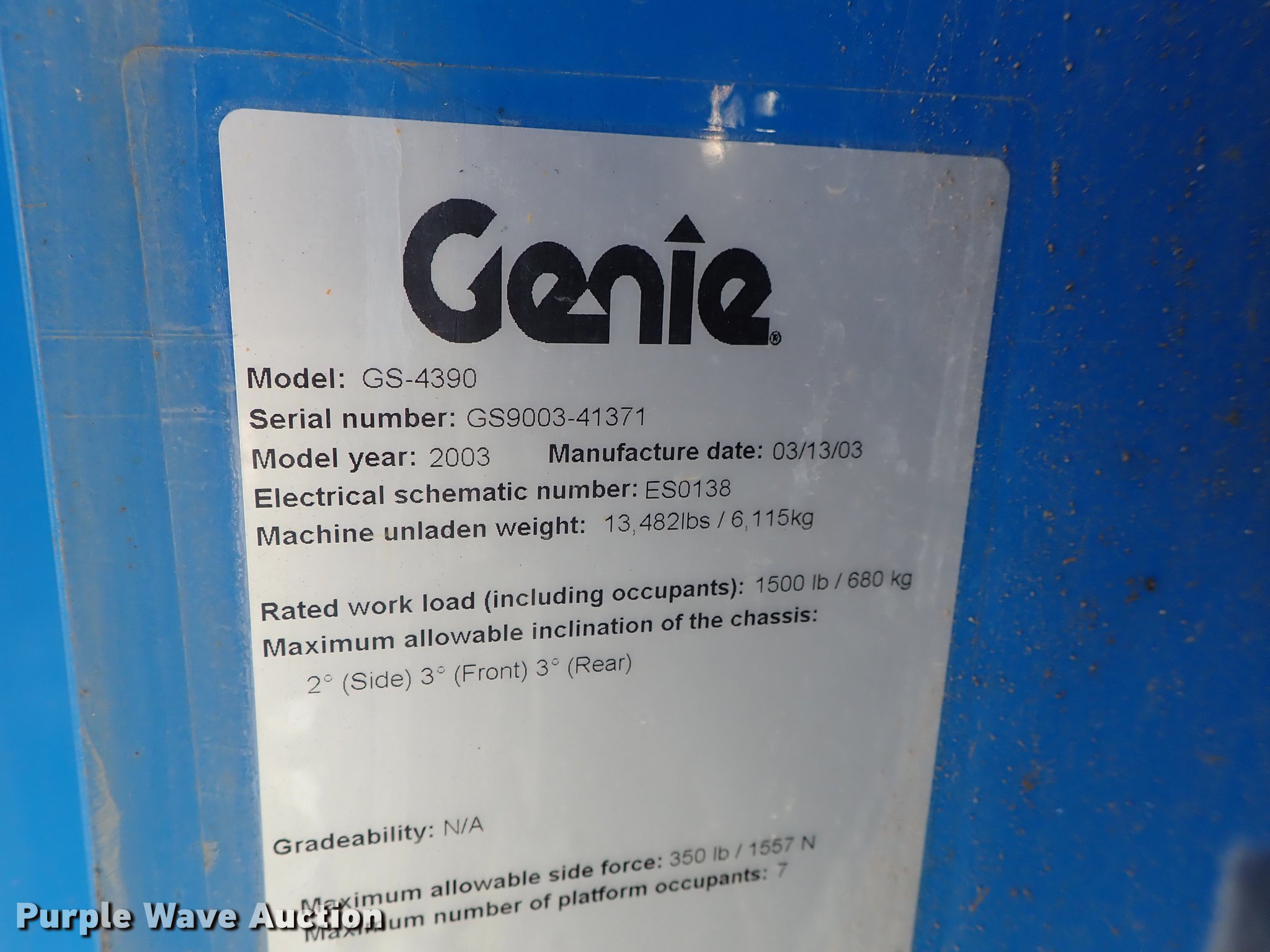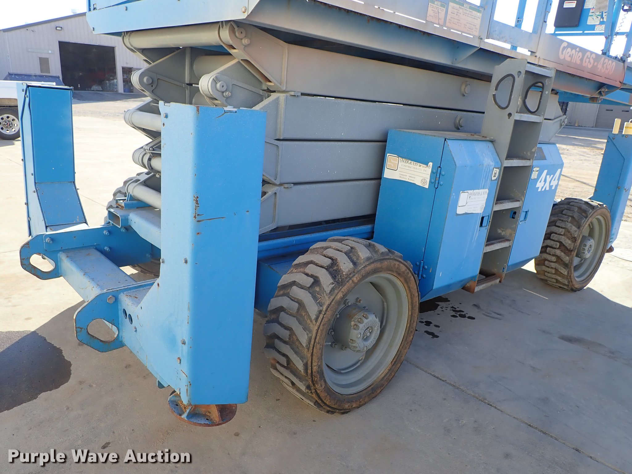 2003 Genie GS-4390 scissor lift. 2,224 hours on meter, Ford LRG-4251-6067-Z four cylinder gas engine Serial 03-01-050106, 1,500 lbs maximum lift capacity, 43' maximum lift height, 13'L x 66"W platform Platform extensions, Platform controls, Hydraulic outriggers, LSW305-546 NHS tires, Serial GS9003-41371. Snodgrass and Sons Construction. 2700 George Washington Blvd. Wichita, KS 67210