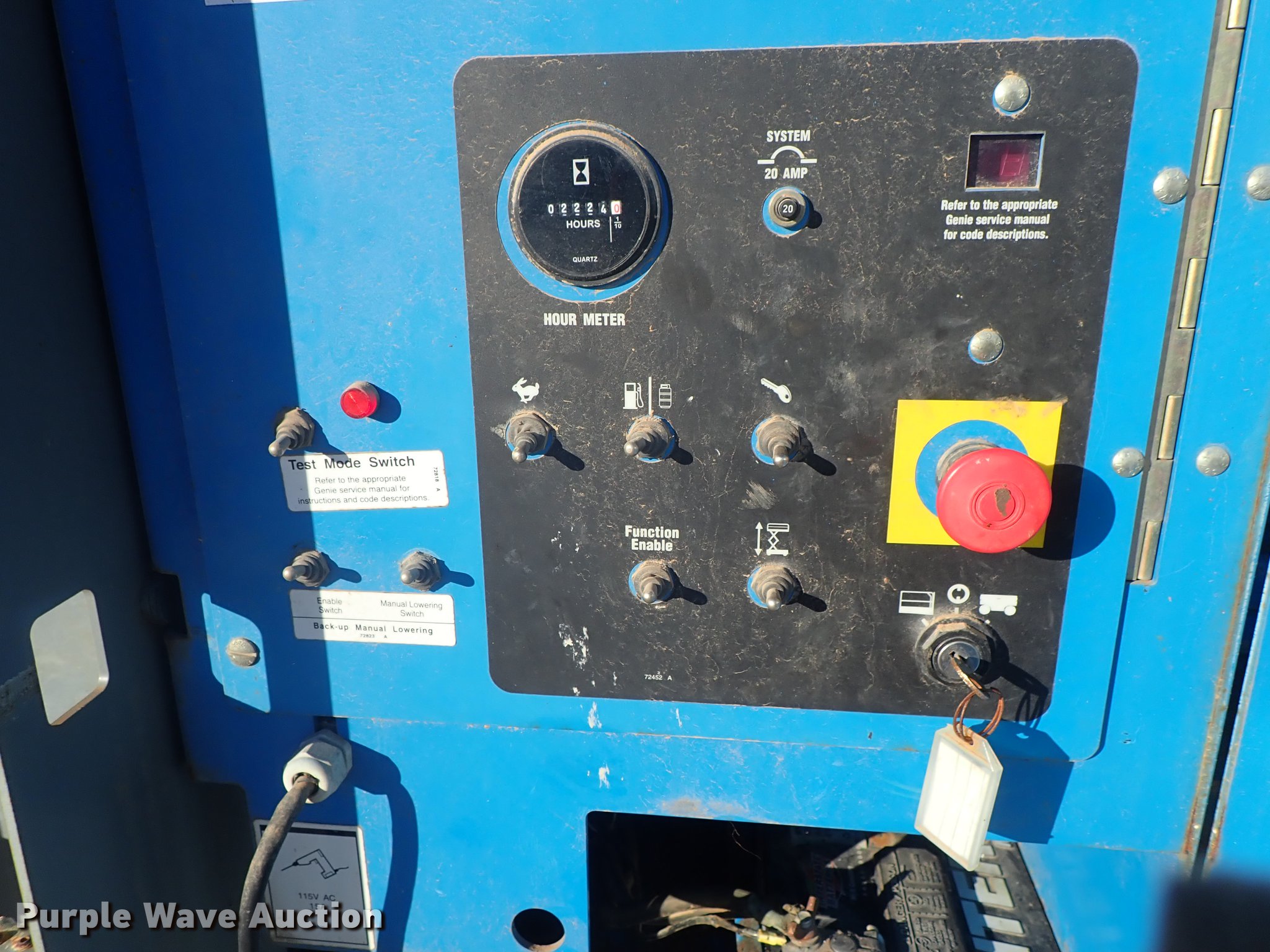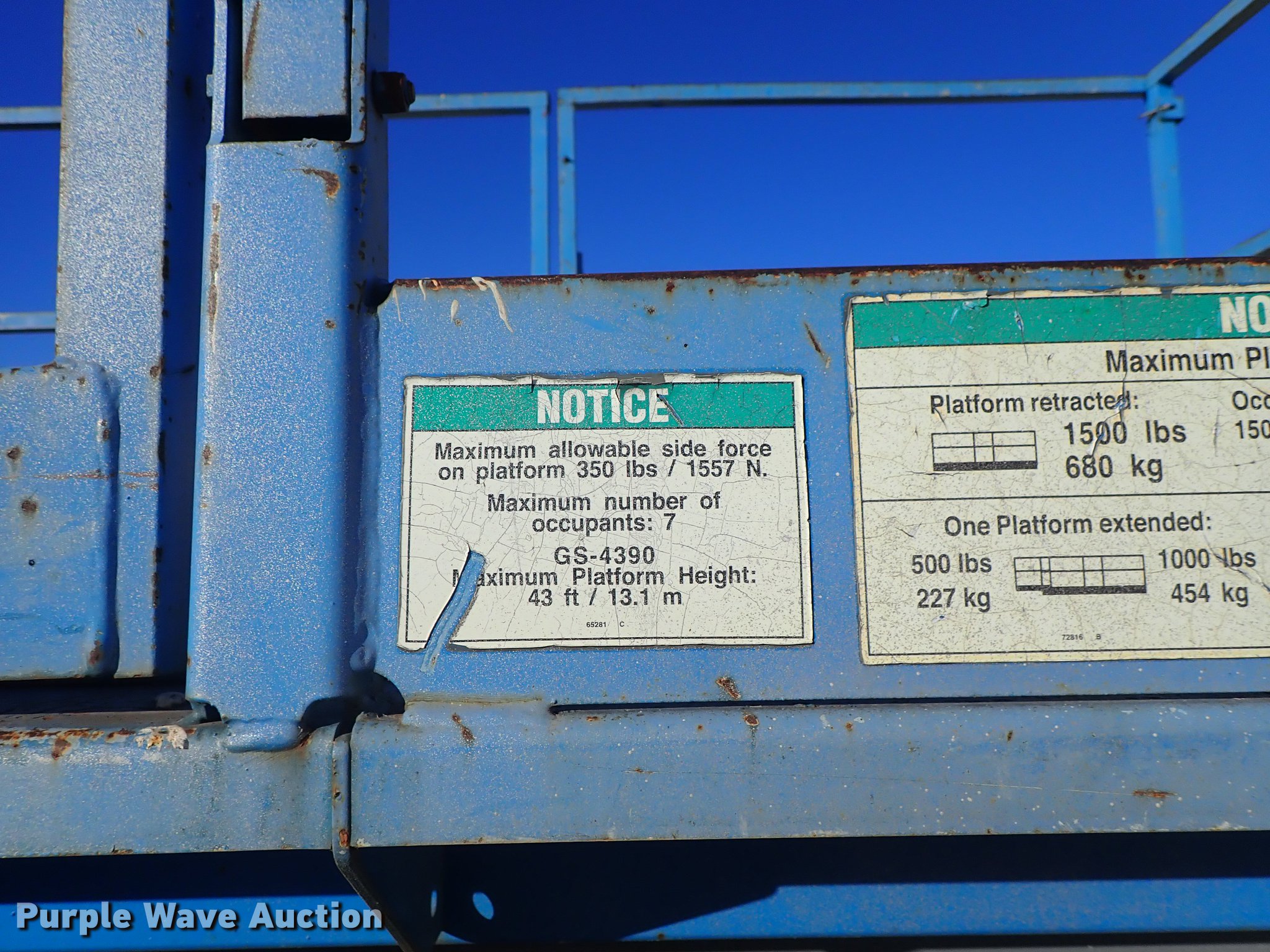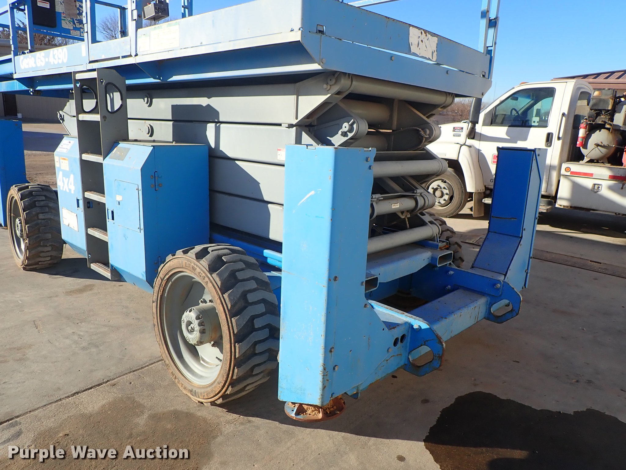 Purple Wave is selling a used Scissor or Vertical Lift in Kansas. This item is a 2003 Genie GS-4390 scissor lift with the following: 2,224 hours on meter, Ford LRG-4251-6067-Z four cylinder gas engine, Serial 03-01-050106, 1,500 lbs maximum lift capacity, 43' maximum lift height, 13'L x 66"W platform, Platform extensions, Platform controls, Hydraulic outriggers, LSW305-546 NHS tires, Serial GS9003-41371