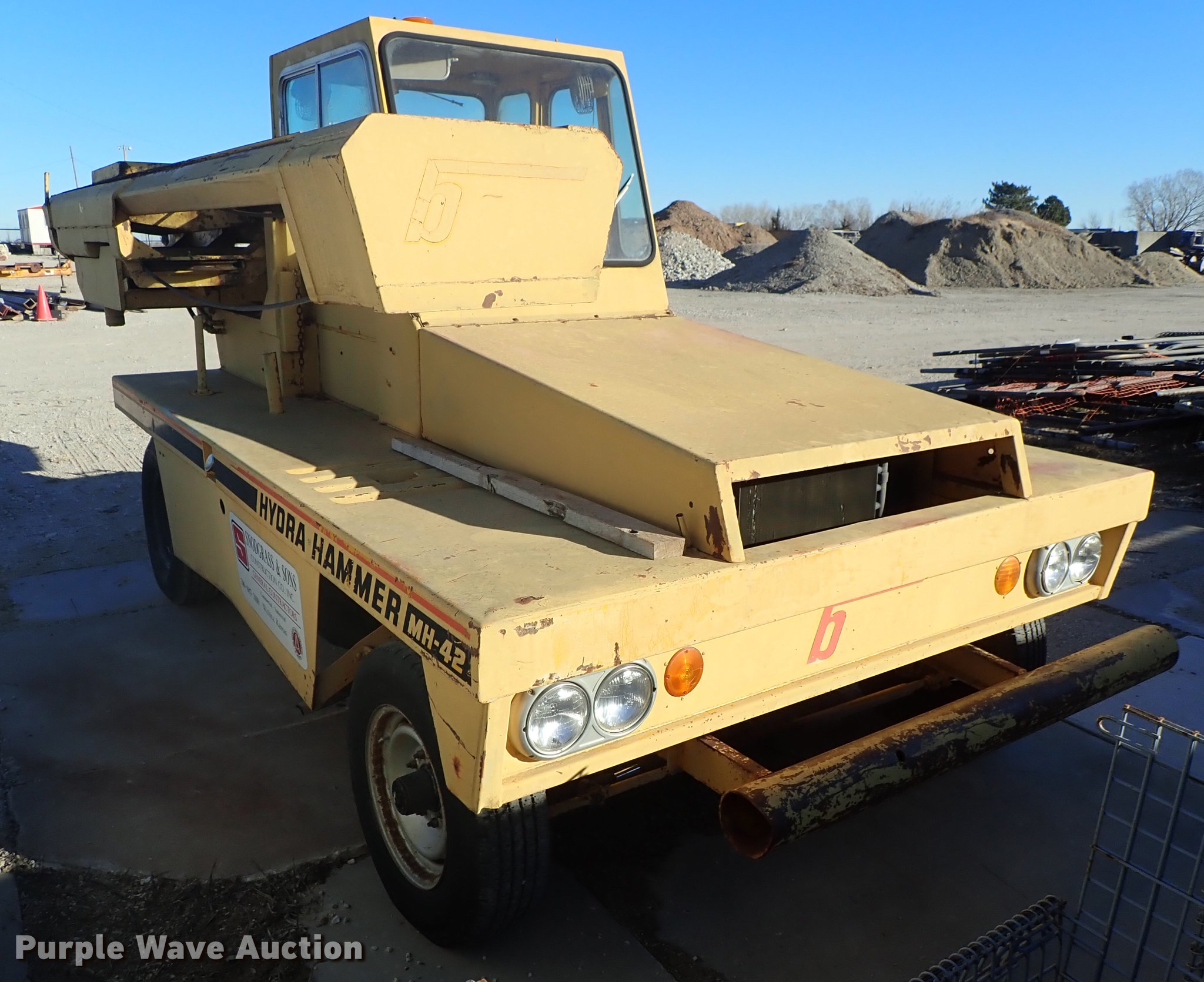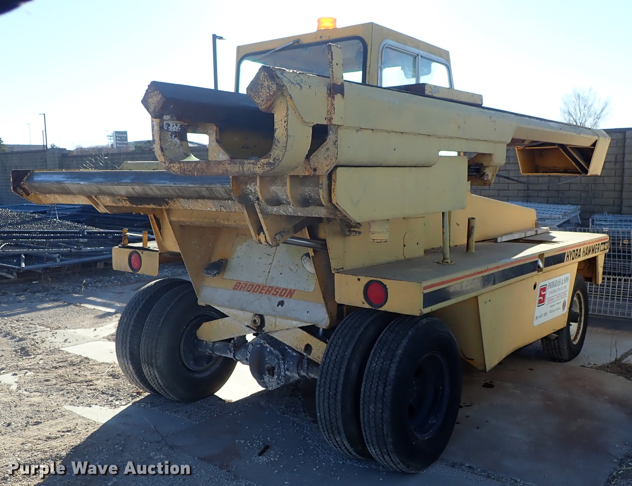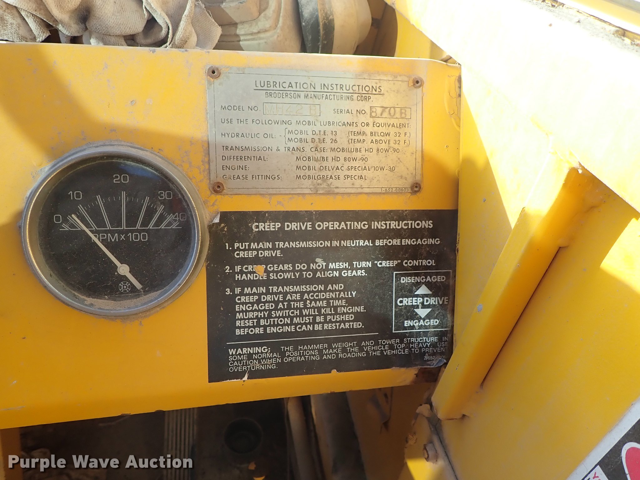 Broderson MH-42 Hydra hammer. 15,464 miles on odometer, 4,459 hours on meter Hours may vary, unit in use, Six cylinder gas engine, Four speed manual transmission, Creep control, Hydraulic leveling, Hydraulic side shift, Work lights, 225/75R16 tires, 7.50-16 tires, Serial 870B. Snodgrass and Sons Construction. 2700 George Washington Blvd. Wichita, KS 67210