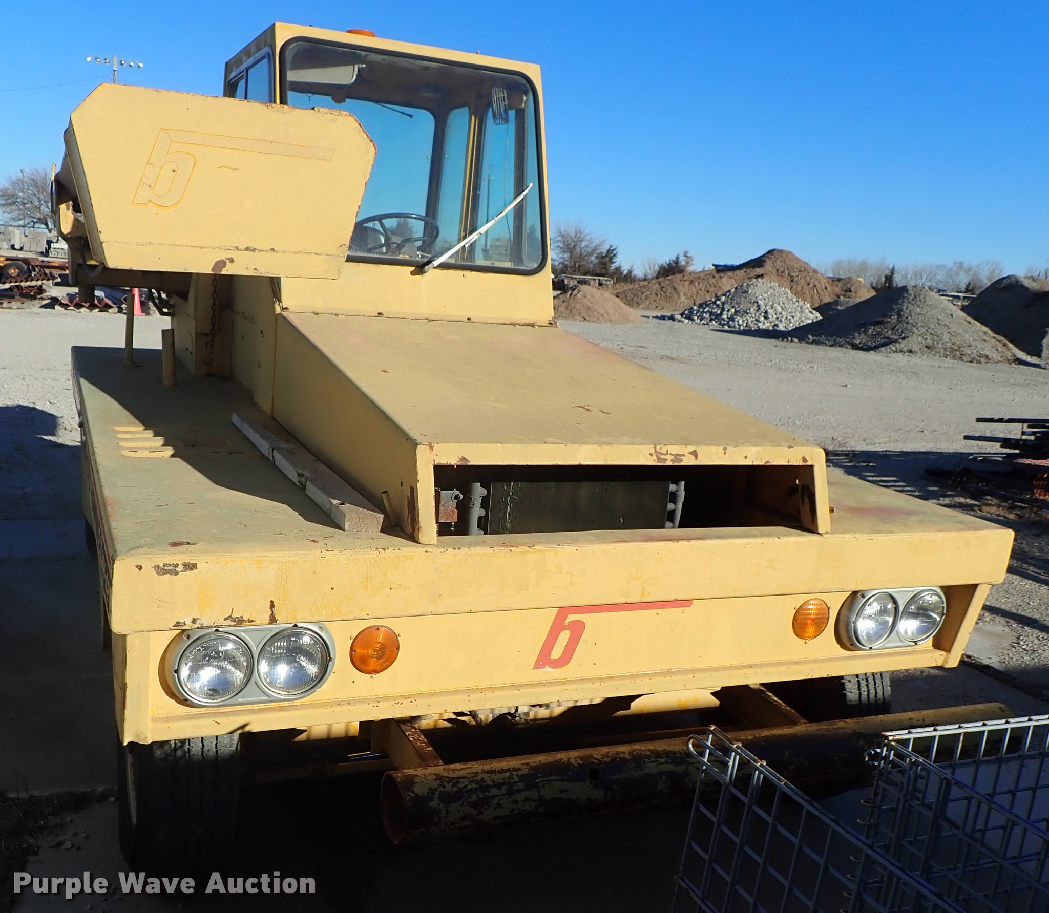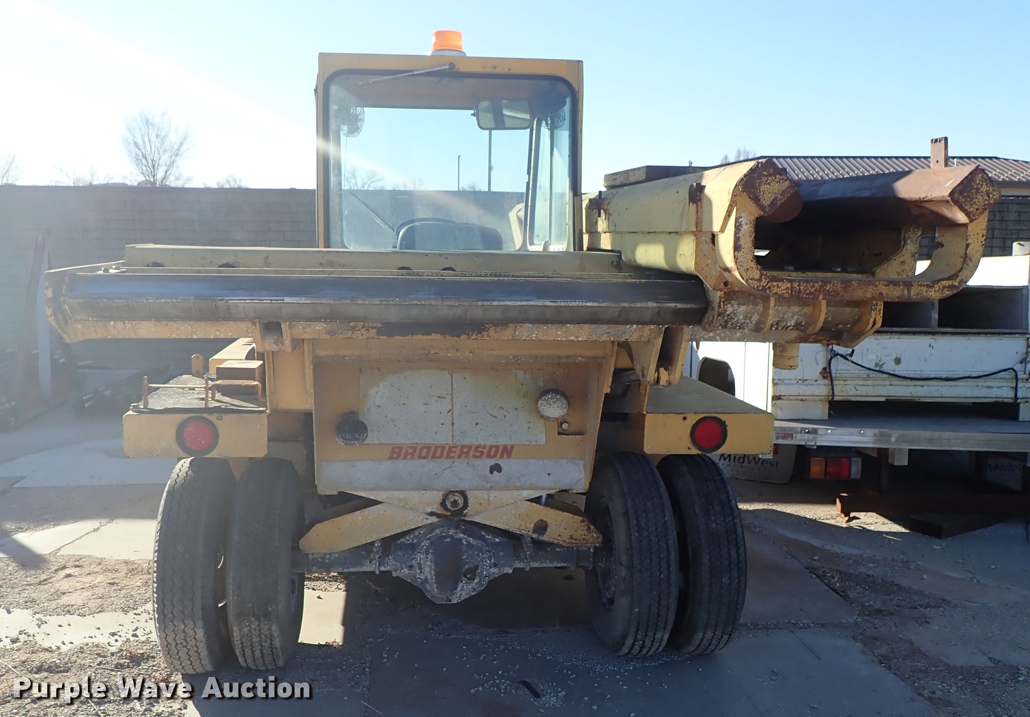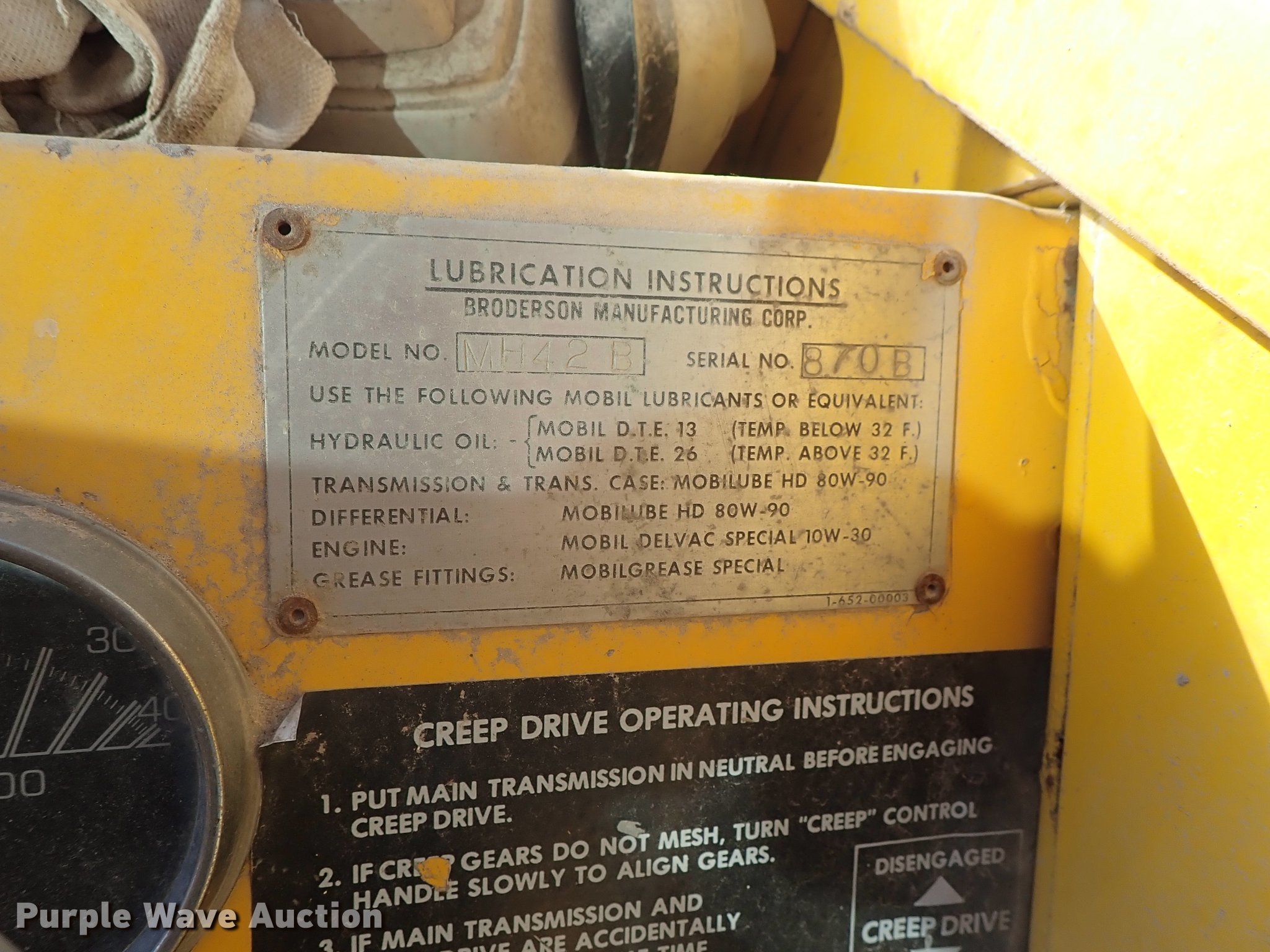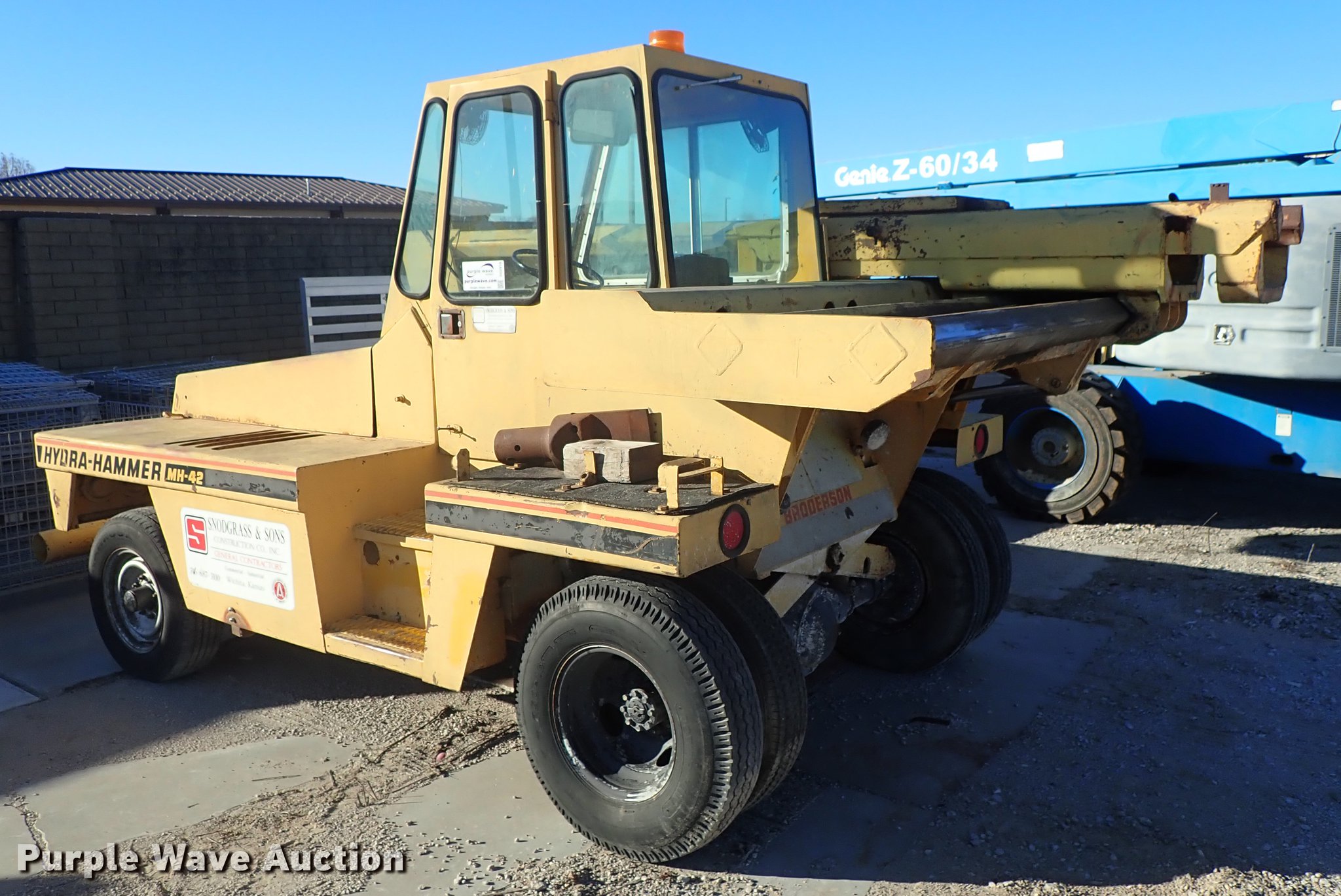 Broderson MH-42 Hydra hammer. 15,464 miles on odometer, 4,459 hours on meter Hours may vary, unit in use, Six cylinder gas engine, Four speed manual transmission, Creep control, Hydraulic leveling, Hydraulic side shift, Work lights, 225/75R16 tires, 7.50-16 tires, Serial 870B. Snodgrass and Sons Construction. 2700 George Washington Blvd. Wichita, KS 67210